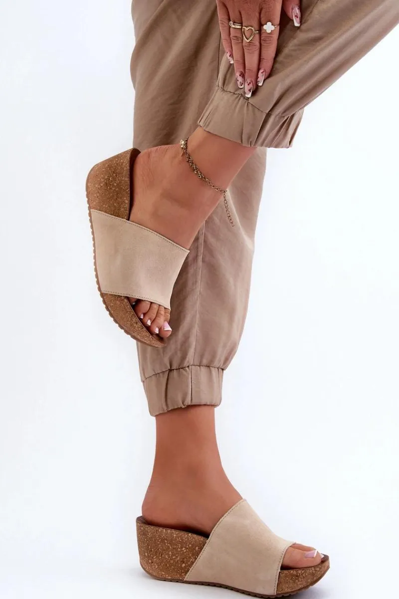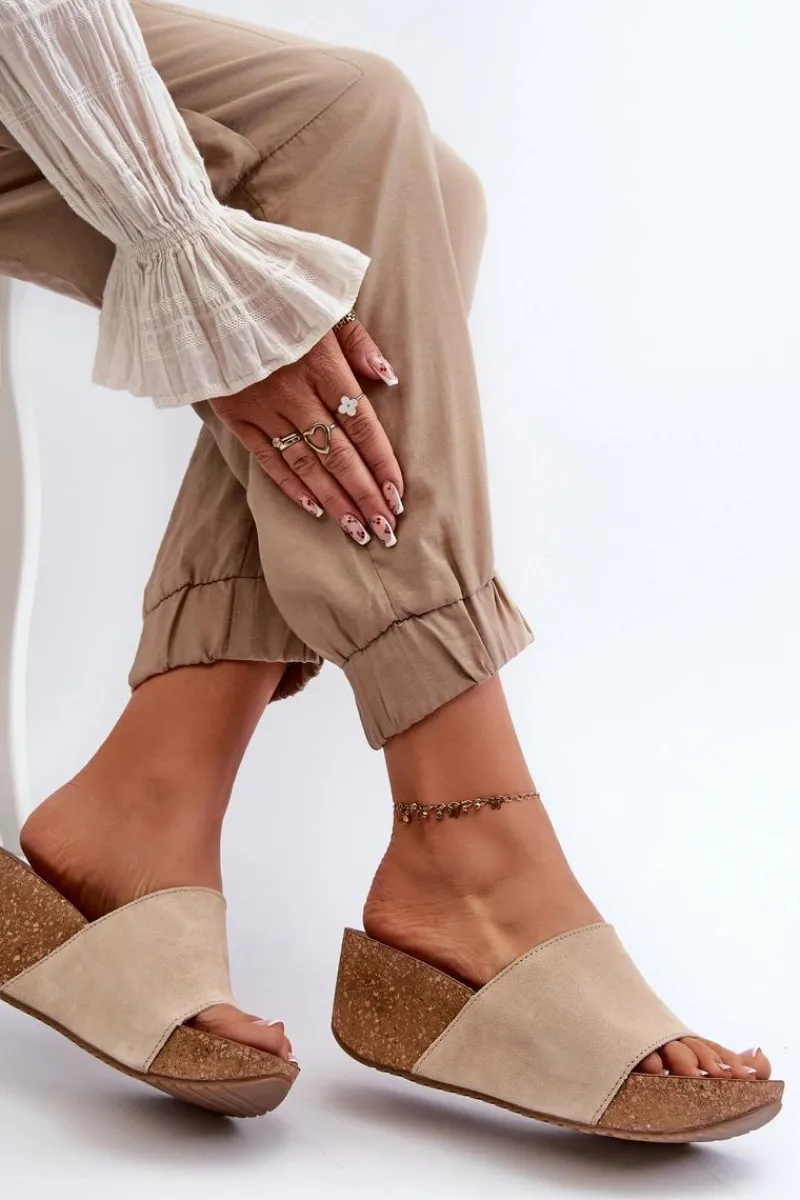Klapki damskie na korkowym koturnie. Wykonane z wysokiej jakości naturalnego zamszu, zapewniają trwałość i komfort noszenia. Modny fason, który będzie idealnym wyborem na letnie dni. Przy wyborze rozmiaru prosimy sugerować się tabelą rozmiarów.
