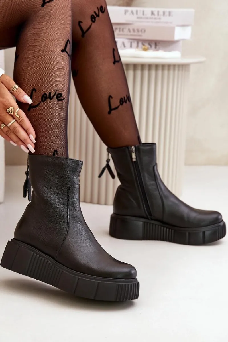 Botki damskie zostały wykonane z wysokiej jakości naturalnych skór. Osadzone na masywnej platformie z delikatnym koturnem. Zapinane z boku cholewki na suwak, natomiast suwak z tyłu jest ozdobny. Dodatkowo botki posiadają usztywniany zapiętek. Ocieplone w środku filcem. Model ten na pewno sprawdzi się w wielu jesiennych stylizacjach! Przy wyborze rozmiaru prosimy kierować się tabelą rozmiarów