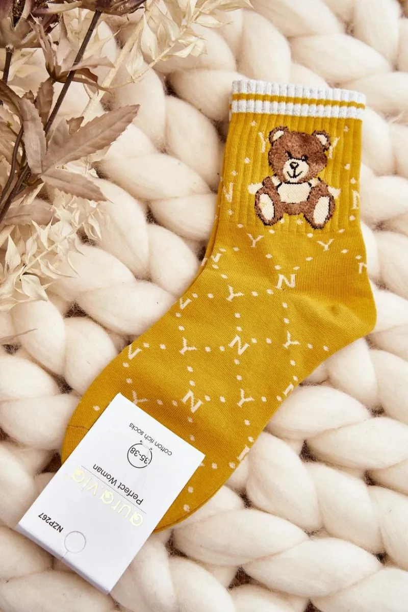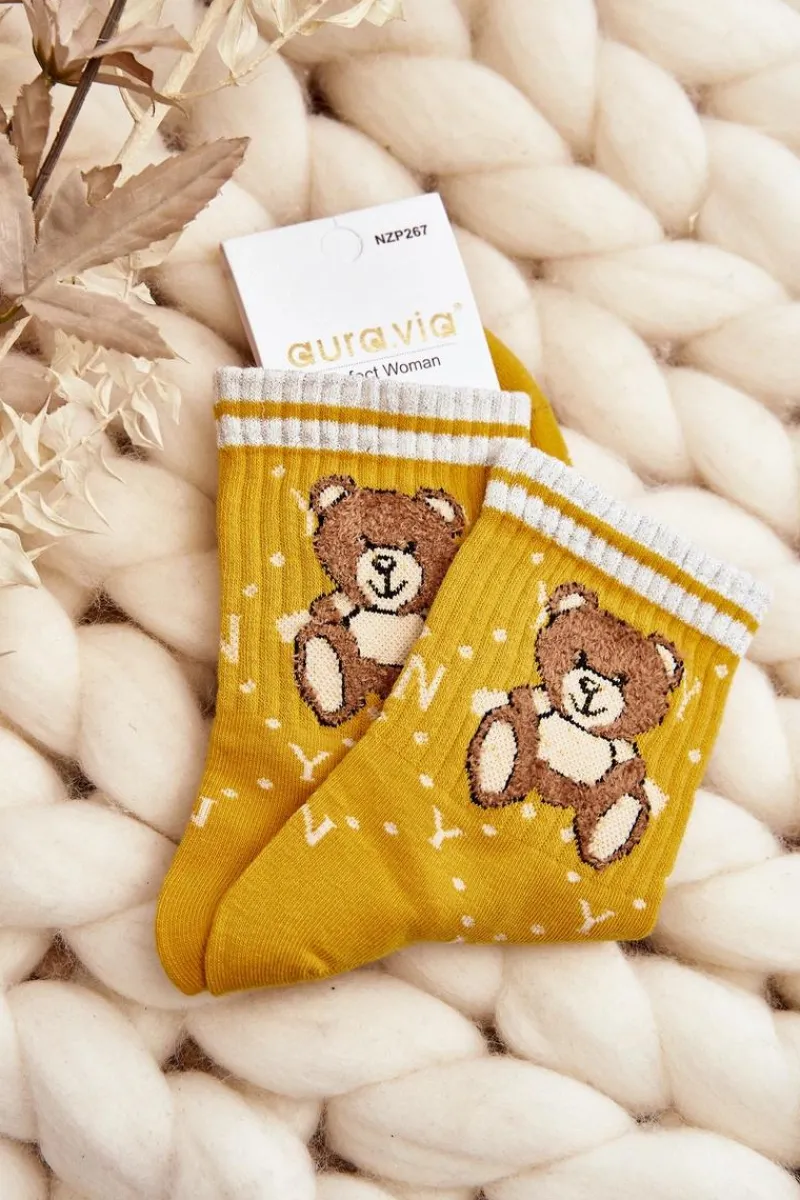 Aura.via Wzorzyste Skarpety Damskie Z Misiem Żółte