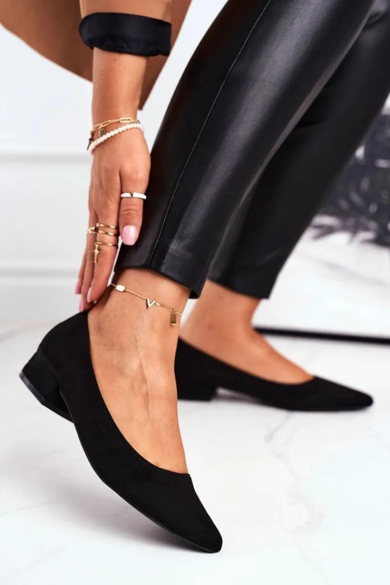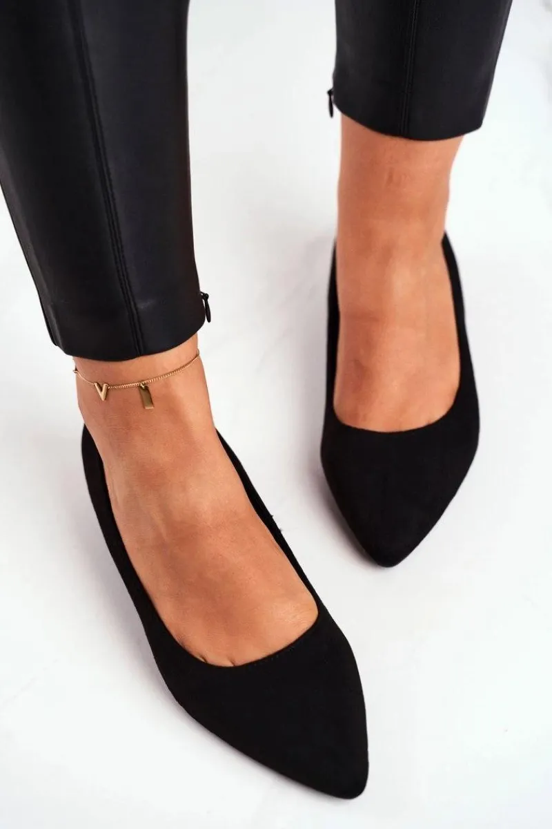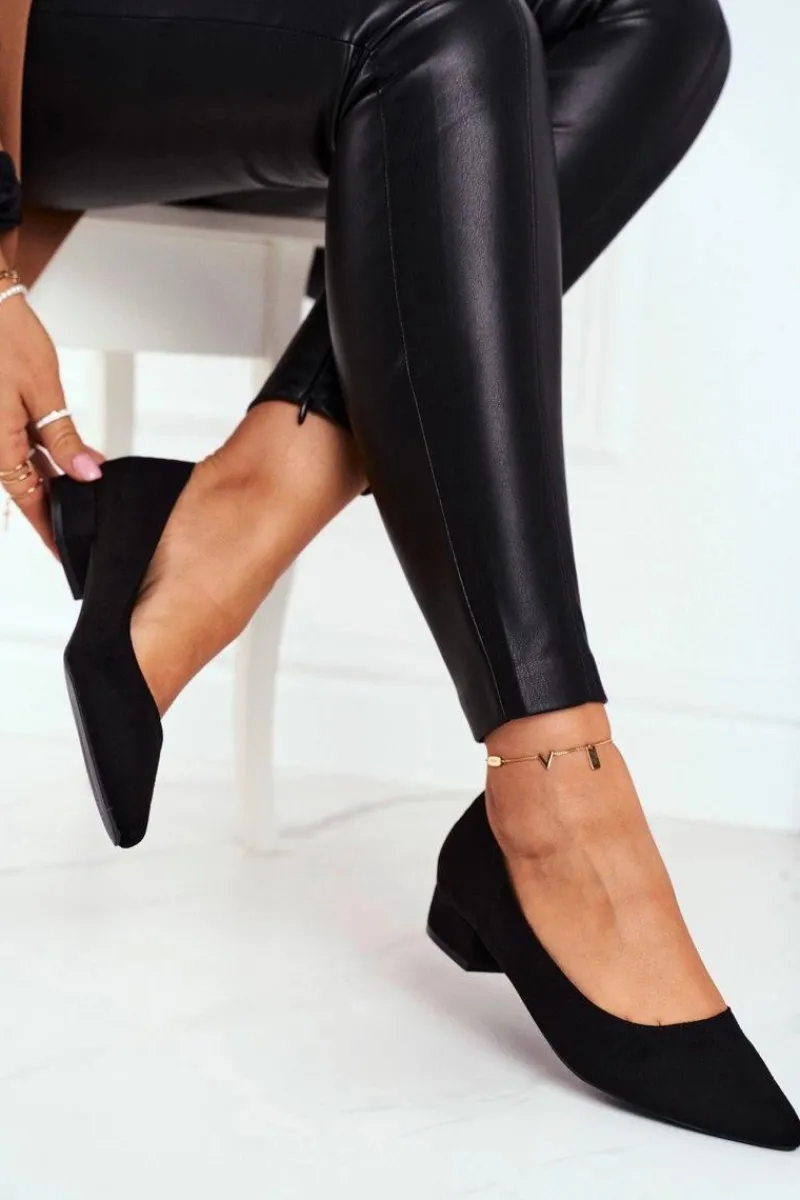 Baleriny na obcasie wykonane z eko zamszu. Nosek w szpic wysmukli Twoją sylwetkę! Przy wyborze rozmiaru prosimy kierować się tabelą rozmiarów