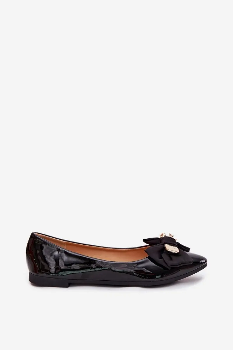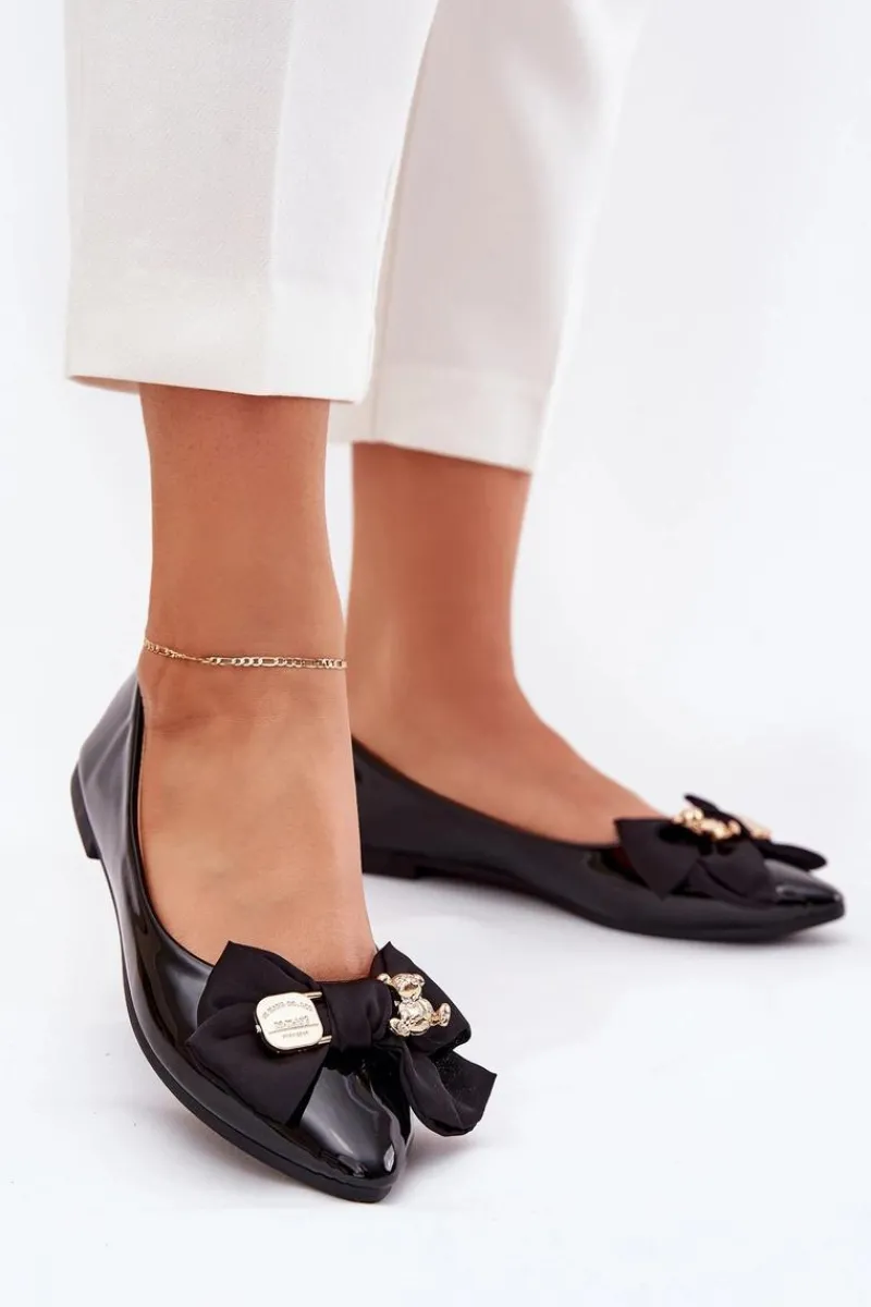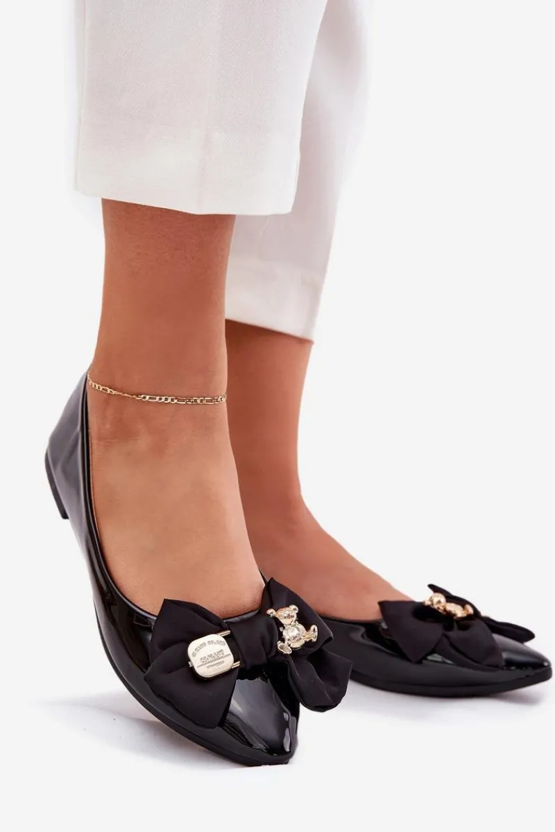 Baleriny damskie wykonane z eko skóry, łączące stylowy wygląd z komfortem. Model wyróżnia się migdałowymi noskami oraz uroczą kokardką ozdobioną złotą broszką, która dodaje im wyjątkowego uroku. Idealne do codziennych stylizacji, zapewniają wygodę i modny wygląd na każdą okazję. Przy wyborze rozmiaru prosimy sugerować się tabelą rozmiarów.