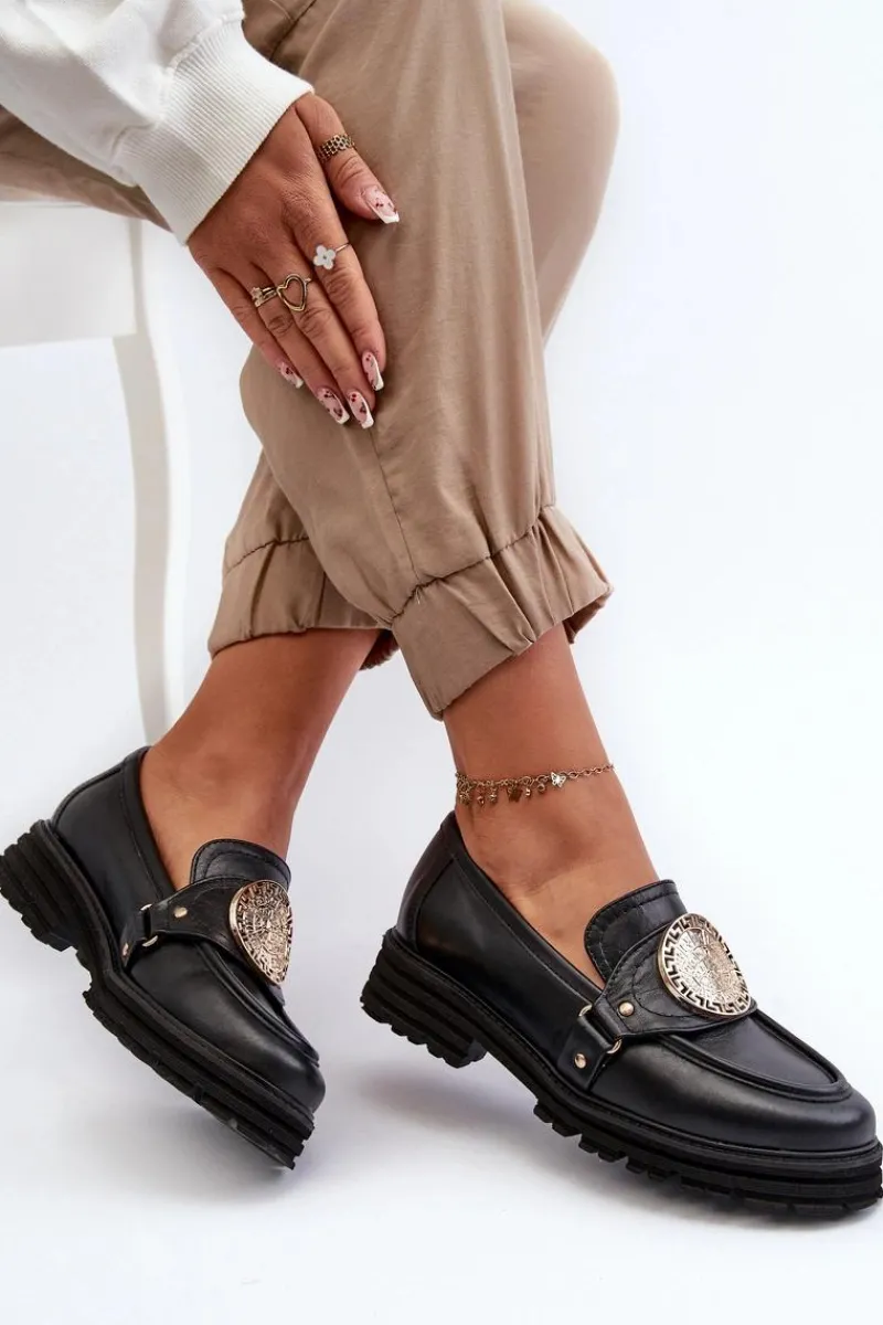 Damskie mokasyny wykonane z naturalnej skóry. Osadzone na płaskim obcasie, gwarantują stabilność i wygodę podczas noszenia. Zaokrąglone noski dodają im delikatności. Z przodu złota ozdoba, która nadaje im subtelnej elegancji. Skórzana wkładka zapewnia komfort nawet podczas długiego noszenia. Dodatkowo usztywniany zapiętek zapewnia lepsze trzymanie stopy. Ten elegancki fason z łatwością dopasujesz do wielu stylizacji, dodając im wyjątkowego charakteru i klasy. Przy wyborze rozmiaru prosimy sugerować się tabelą rozmiarów.