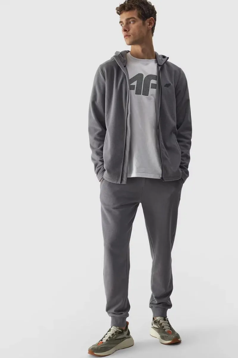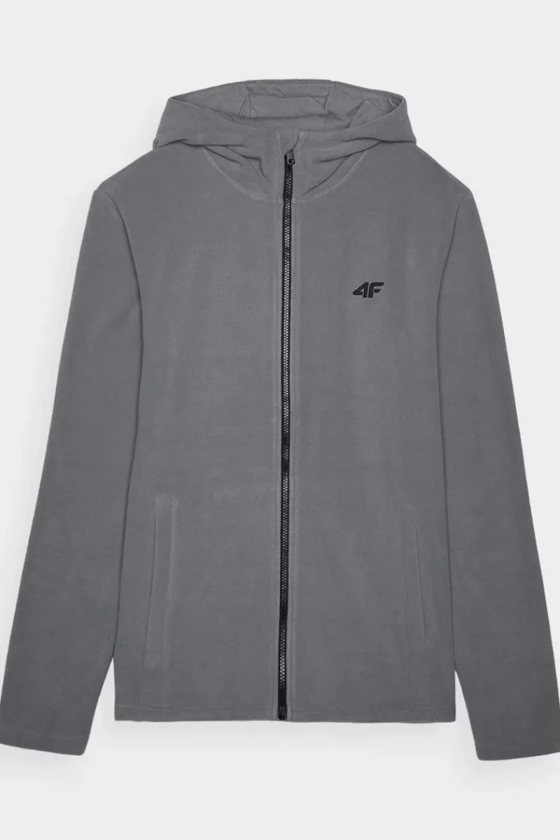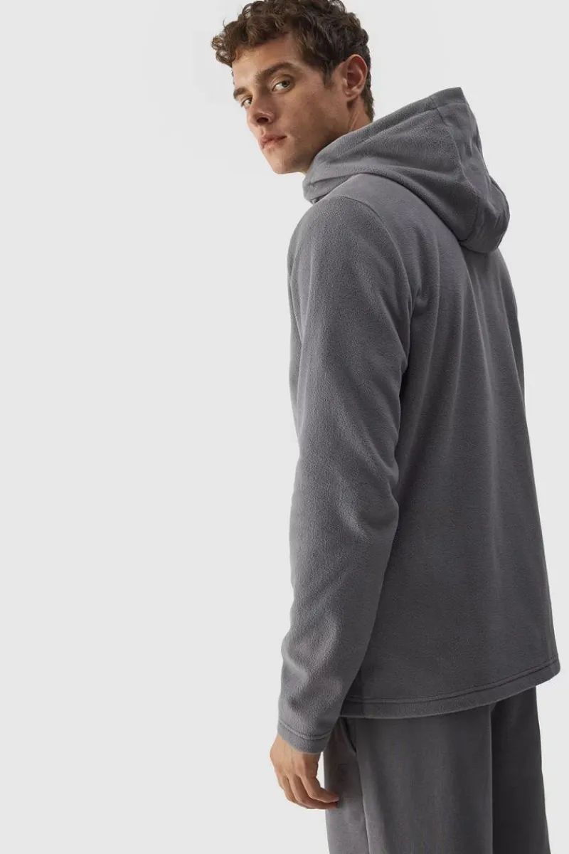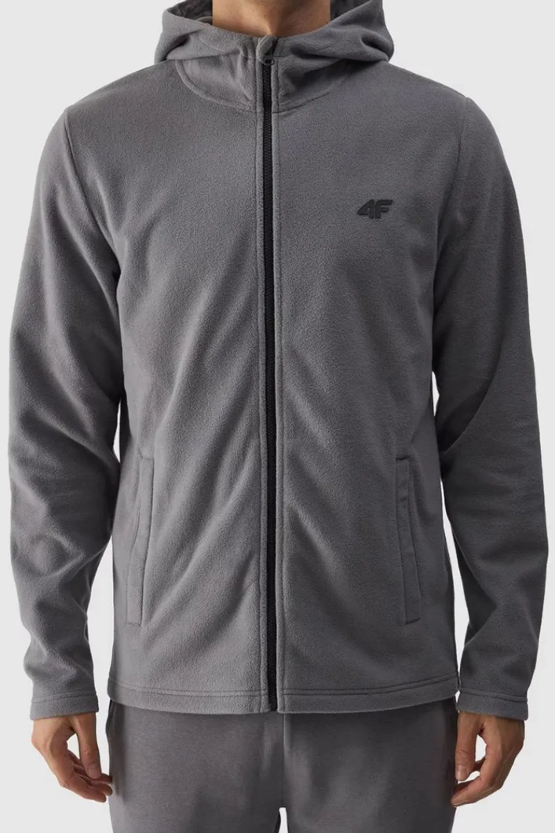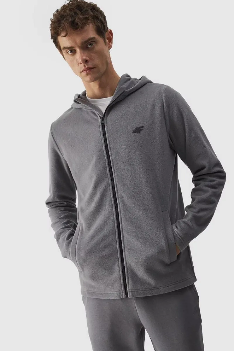 Bluza polarowa dla mężczyzny jest wykonana z gładkiego i miękkiego w dotyku polaru, który cechuje się bardzo dobrą izolacją termiczną, a przy tym oddycha i szybko schnie. Technologia 4FWarm wspiera komfort cieplny. Bluza polarowa dla mężczyzny posiada stójkę z nieodpinanym kapturem bez regulacji. Mankiety z materiału zasadniczego. Po bokach znajdują się 2 kieszenie otwarte. Zapinany na jednokierunkowy zamek główny. Posiada krój regular, który wygodnie dopasowuje się do sylwetki oraz standardową długość sięgającą do linii bioder. Poliester 100% Materiał główny: Poliester 100%