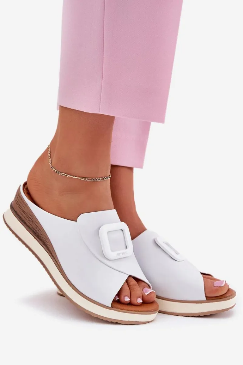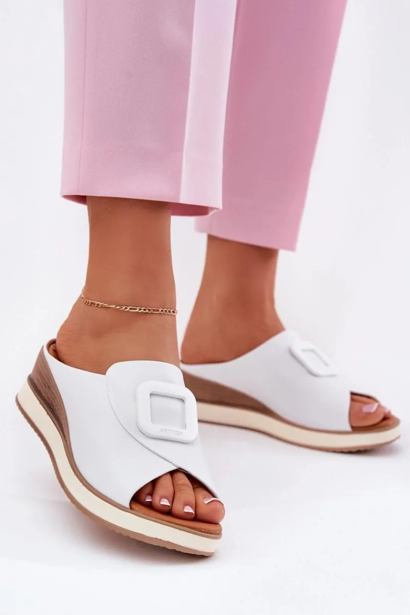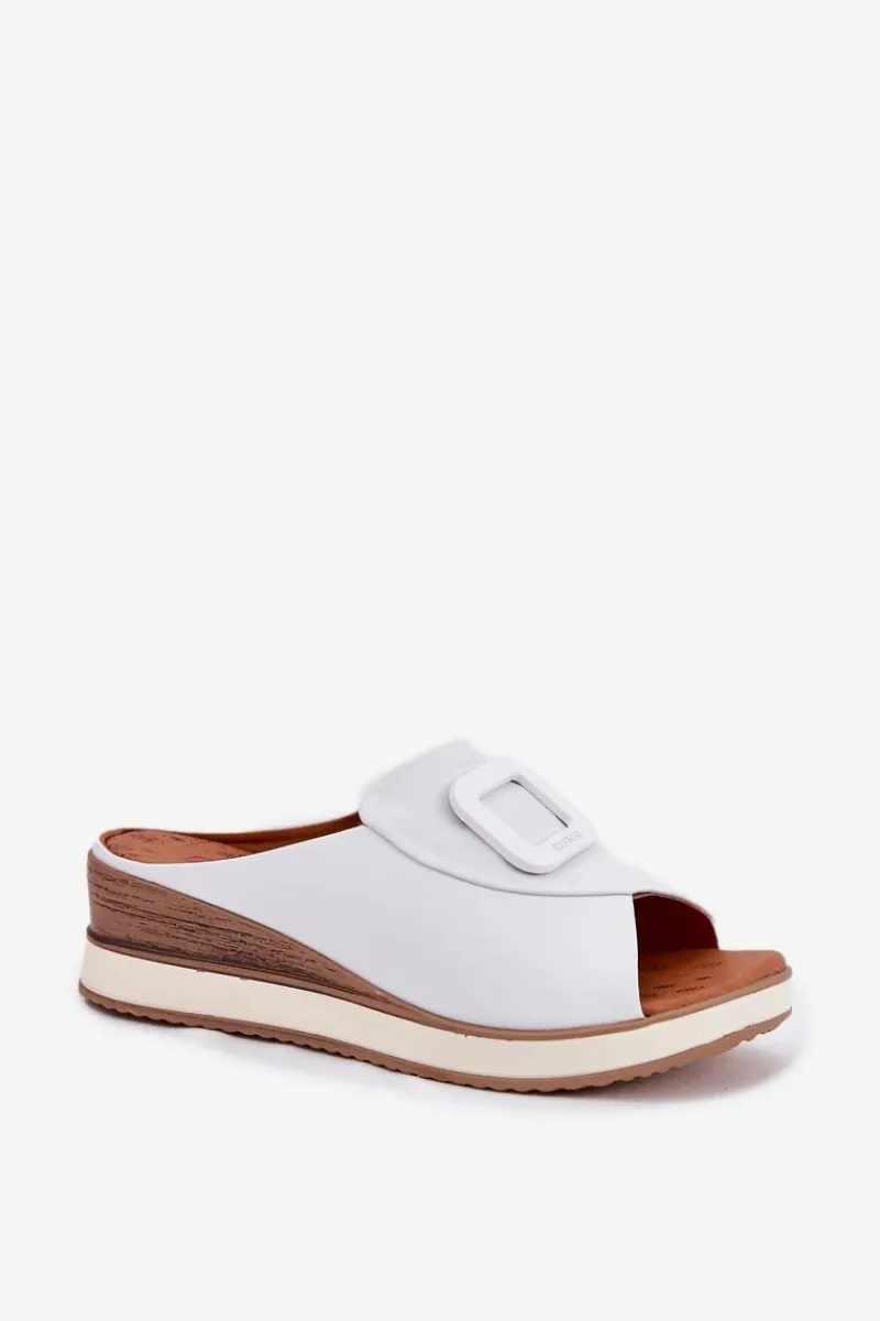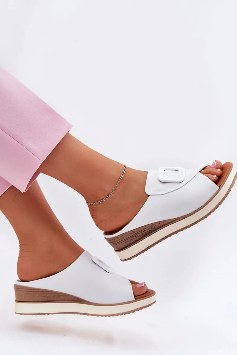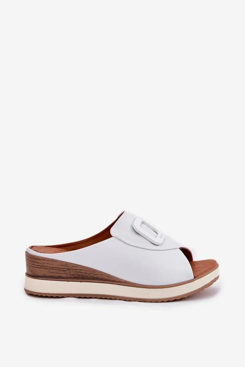Damskie klapki wykonane z naturalnej skóry to elegancka propozycja na cieplejsze dni. Osadzone na koturnie, zapewniają stabilność i wygodę przez cały dzień. Z przodu butów znajduje się subtelny ozdobny detal, który nadaje im wyjątkowego charakteru. Miękka wkładka dba o komfort noszenia, a stylowy fason sprawia, że klapki będą doskonałym uzupełnieniem letnich stylizacji. Przy wyborze rozmiaru prosimy sugerować się tabelą rozmiarów.
