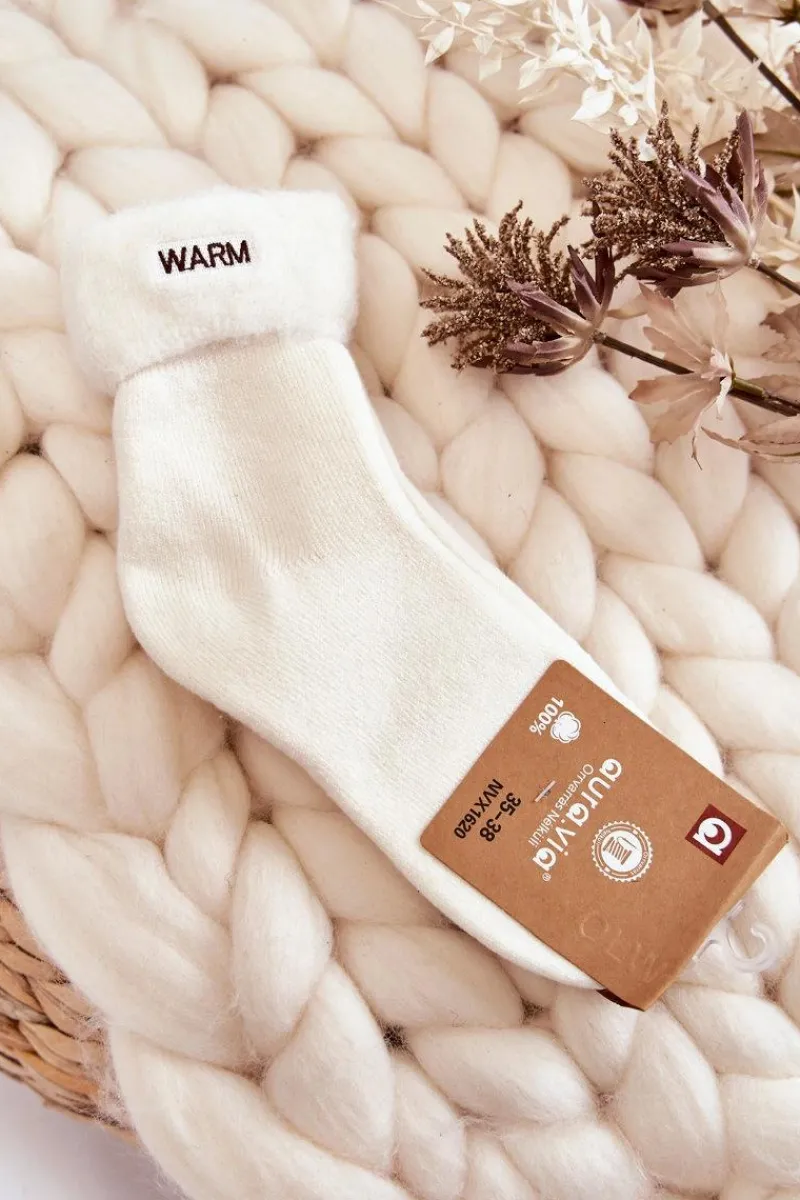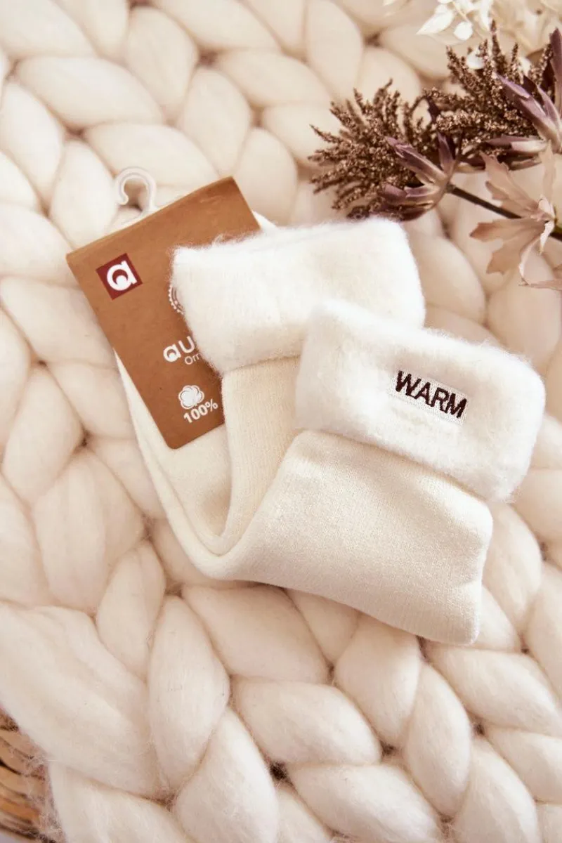 Bawełniane skarpetki w dwóch grupach rozmiarowych idealnie sprawdzą się dla każdego, kto ceni sobie ciepło i komfort podczas chłodniejszych dni. Posiadają ocieplenie w postaci delikatnego futerka. Z boku skarpetek znajduje się ozdobny napis.
