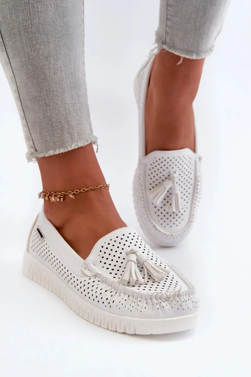 Mokasyny damskie wykonane z ekologicznej skóry. Osadzone na platformie. Noski zaokrąglone. Przód ozdobiony małymi frędzlami. Model ten posiada miękką wkładkę ze skóry naturalnej, która zapewni wygodę podczas noszenia. Klasyczny fason, który dopasujesz do casualowych oraz eleganckich stylizacji. Przy wyborze rozmiaru prosimy sugerować się tabelą rozmiarów.