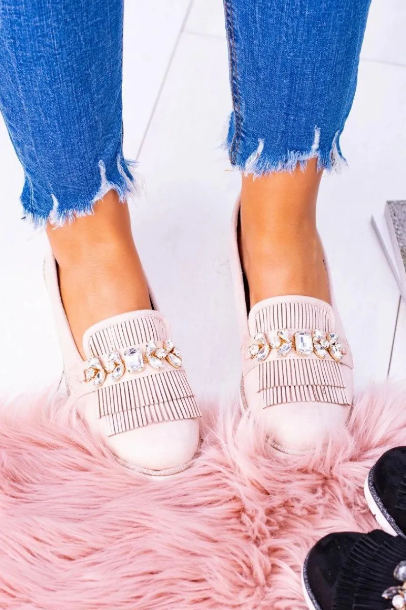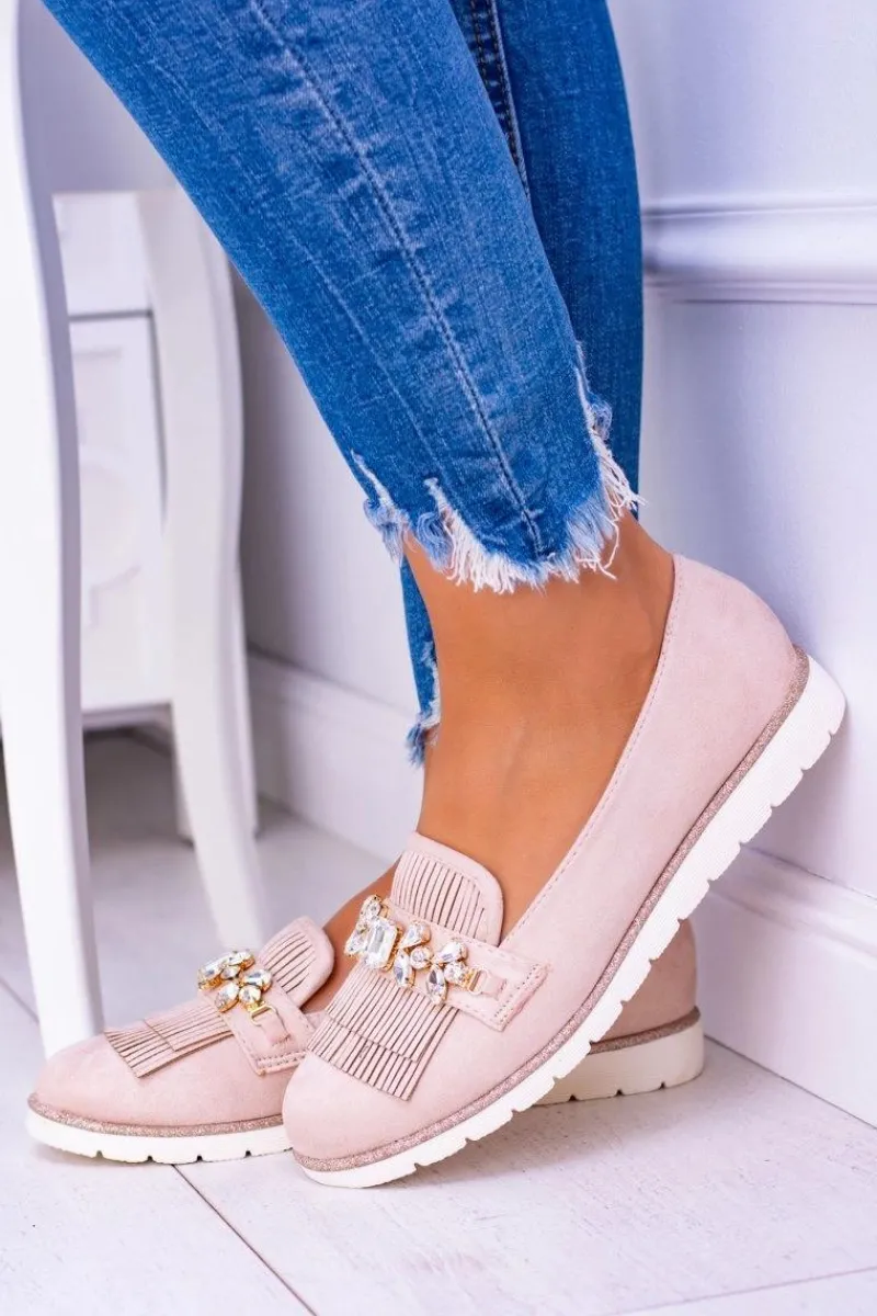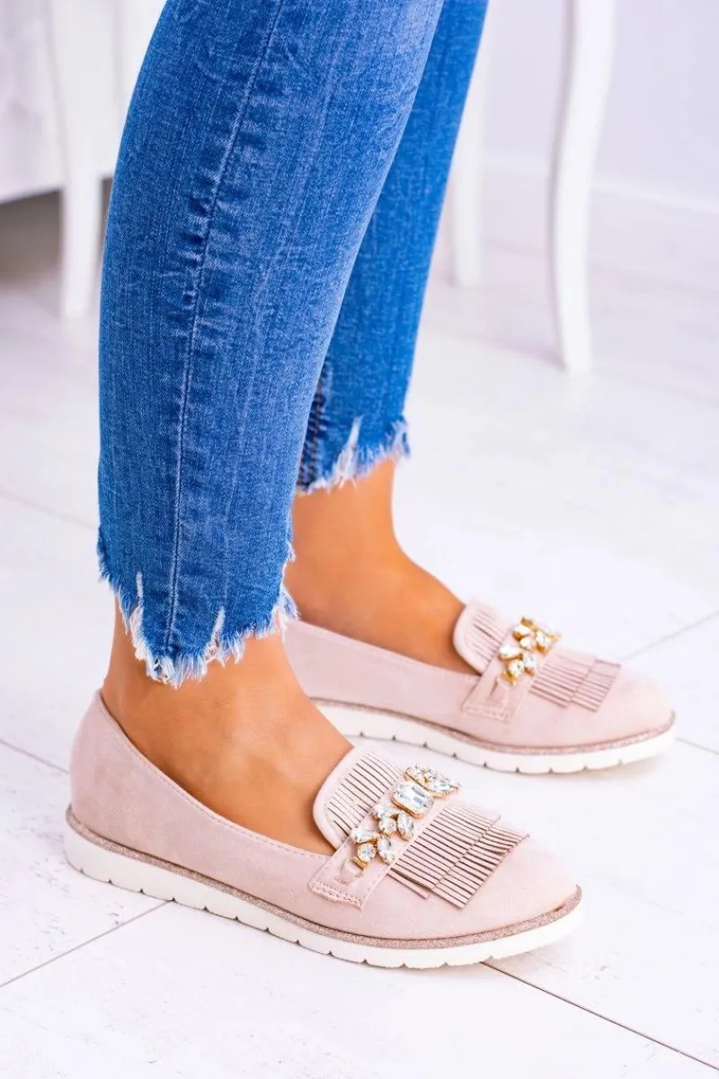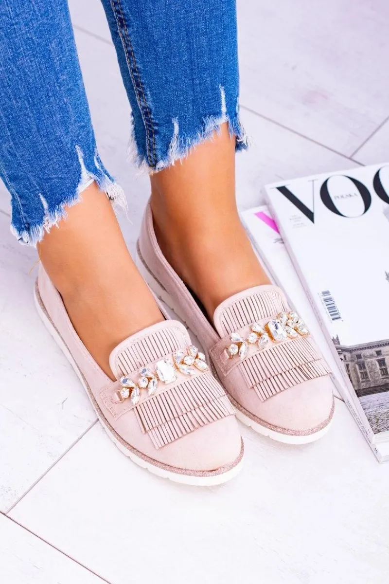 Best Beżowe Zamszowe Mokasyny z Kryształami Vivaro Damskie Mokasyny Damskie Zamszowe