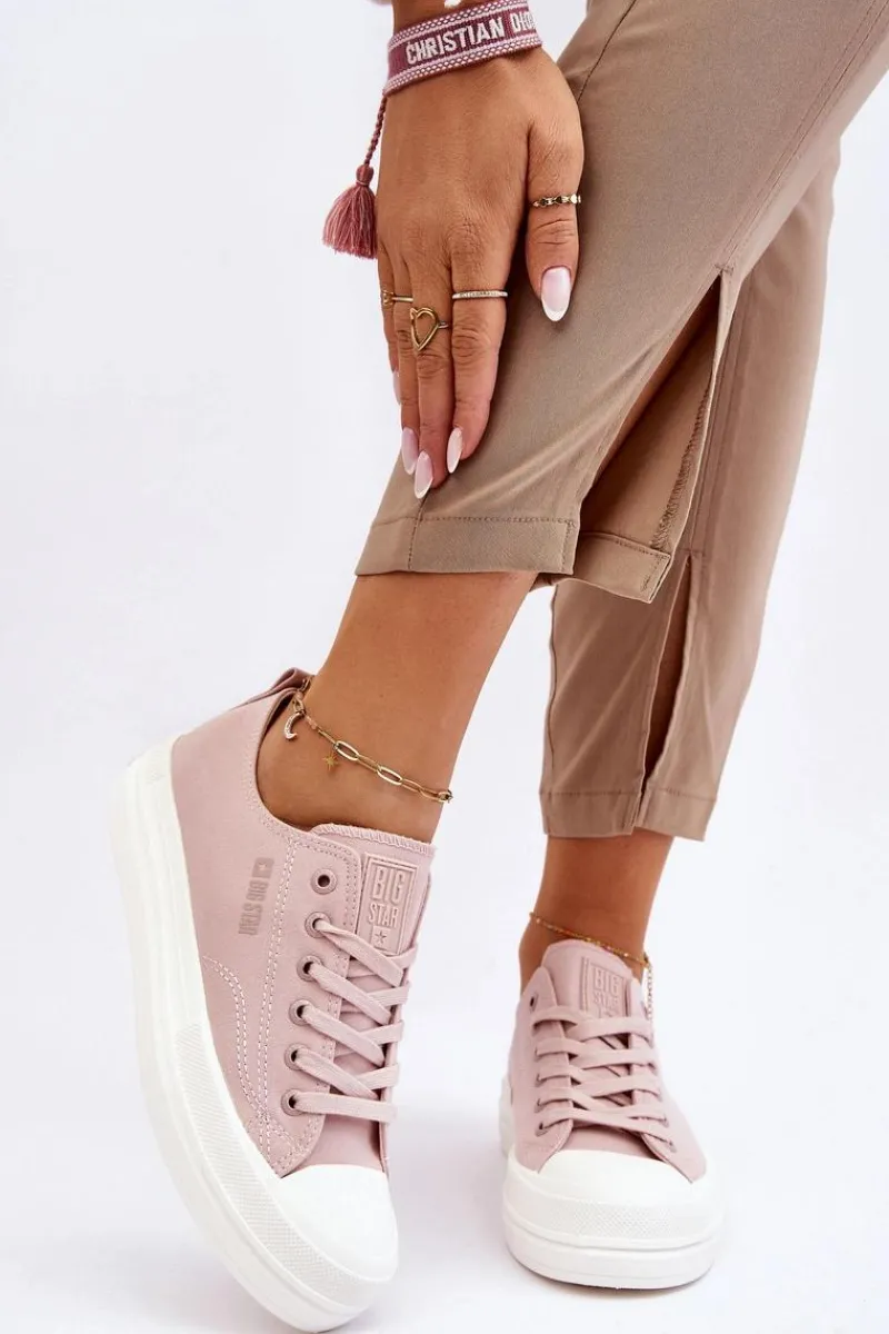 Damskie trampki polskiej marki BIG STAR. Wykonane zostały z materiału tekstylnego. Posiadają materiałową wkładkę oraz sznurowanie. Osadzone na platformie oraz antypoślizgowej podeszwie. Trampki pasują do wielu stylizacji, dlatego koniecznie powinnaś mieć ten model w swojej garderobie! Sprawdź także pozostałe nasze oferty z trampkami marki Big Star! Przy wyborze rozmiaru prosimy sugerować się tabelą rozmiarów.