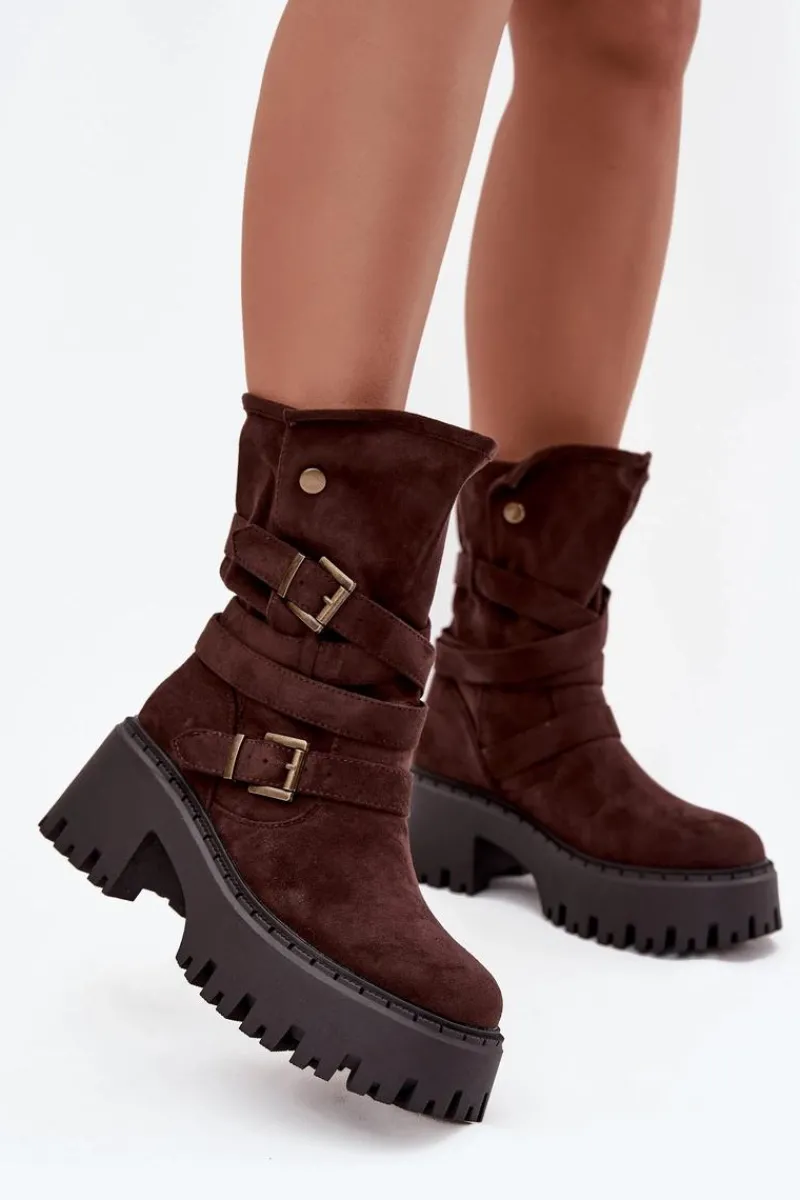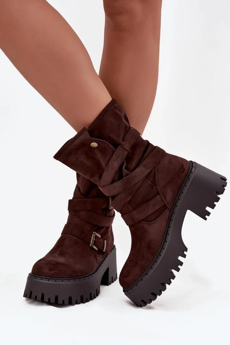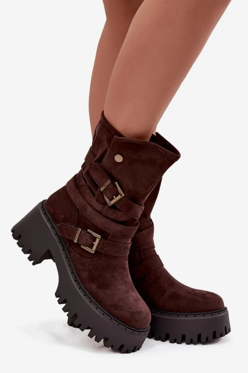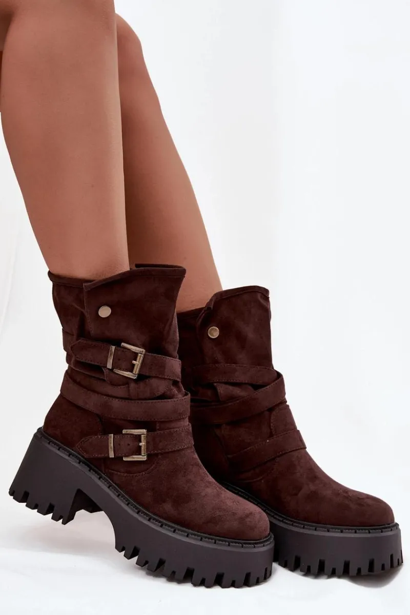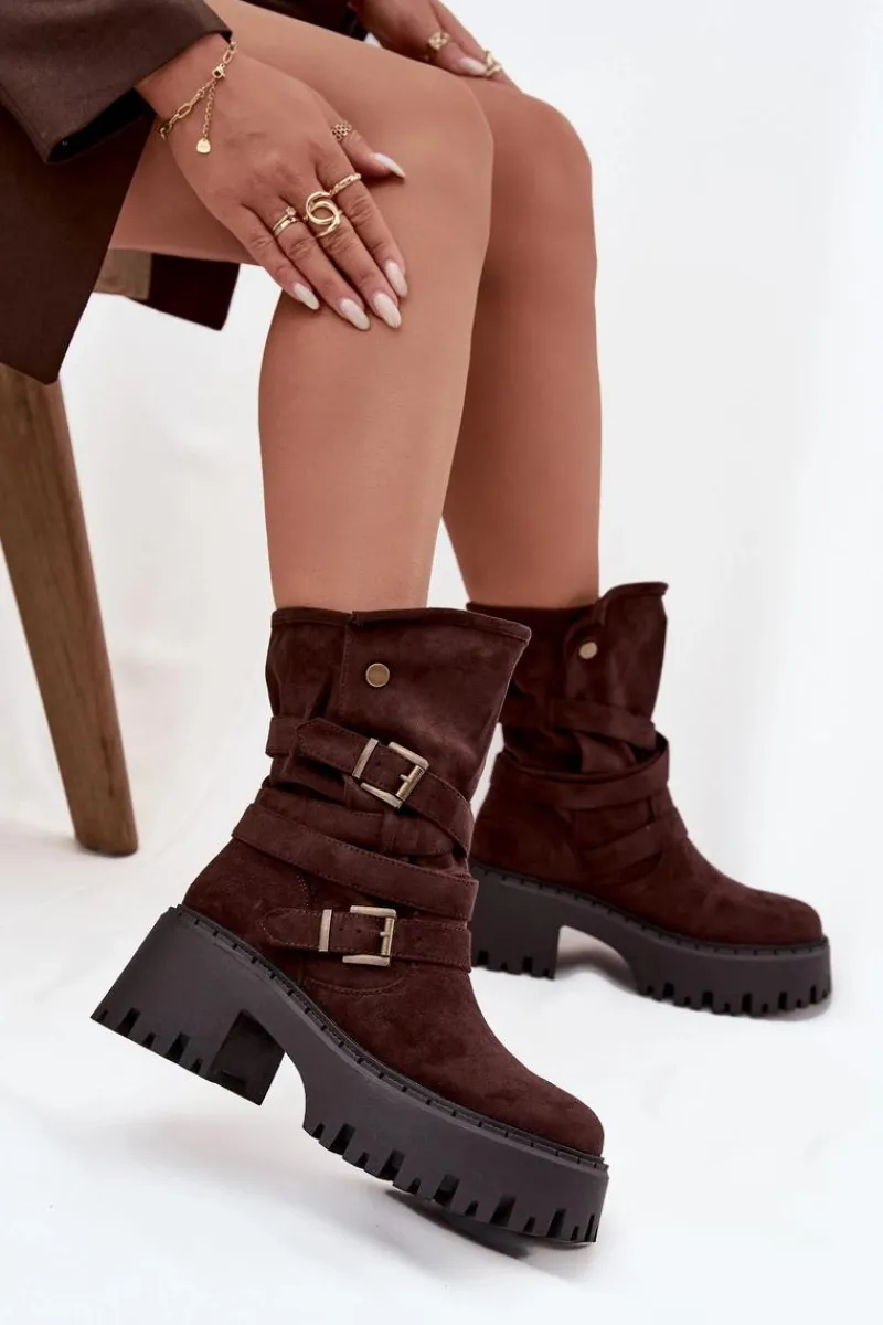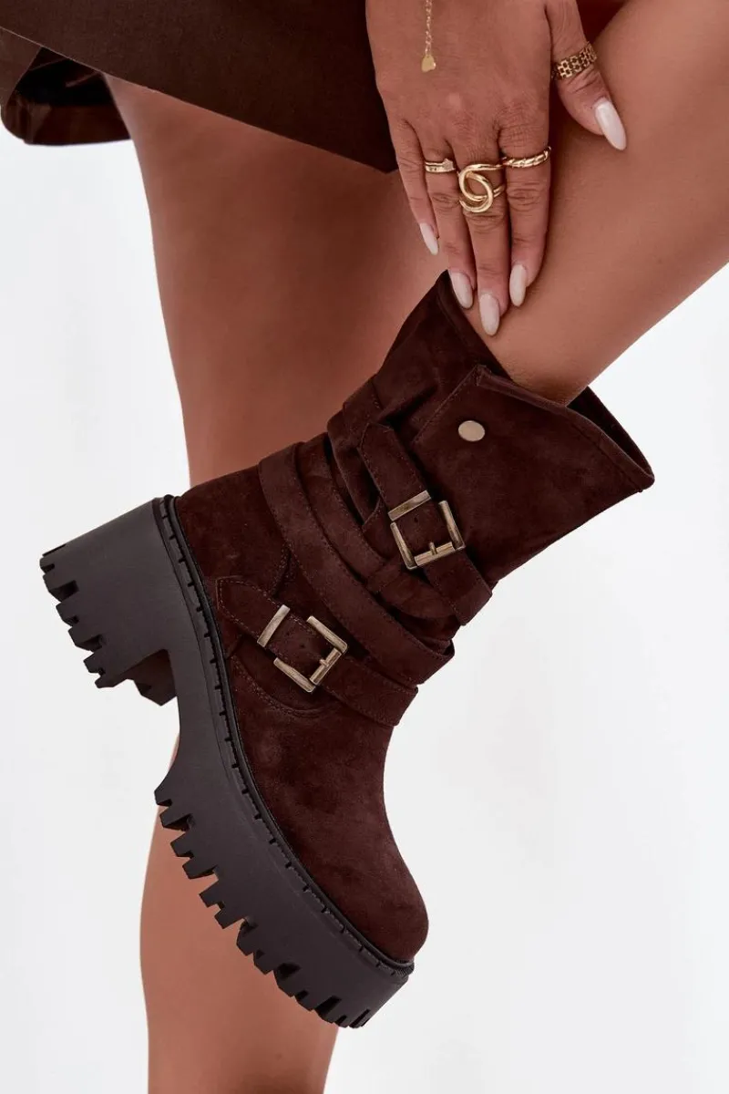 Botki damskie wykonane z eko zamszu. Osadzone na masywnym obcasie, który zapewni stabilność na każdym kroku. Noski zaokrąglone. Model ten wyróżnia się paskiem oplecionym wokół cholewki ze złotymi klamrami. Góra cholewki zapinana na dwa zatrzaski. Bez względu na okazję, te botki będą doskonałym uzupełnieniem Twojej garderoby! Przy wyborze rozmiaru prosimy sugerować się tabelą rozmiarów.
