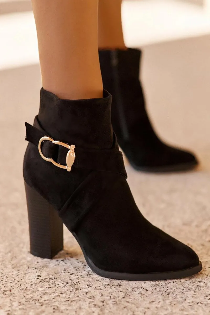 Eleganckie botki za kostkę wykonane z eko zamszu. Osadzone na wysokim obcasie w postaci słupka. Cholewka ozdobiona paskami z klamrą. Model zapinany na suwak. Zapiętek usztywniony, wnętrze ocieplone kocem obuwniczym. Idealny model do eleganckich i imprezowych stylizacji. Przy wyborze rozmiaru prosimy sugerować się tabelą rozmiarów.