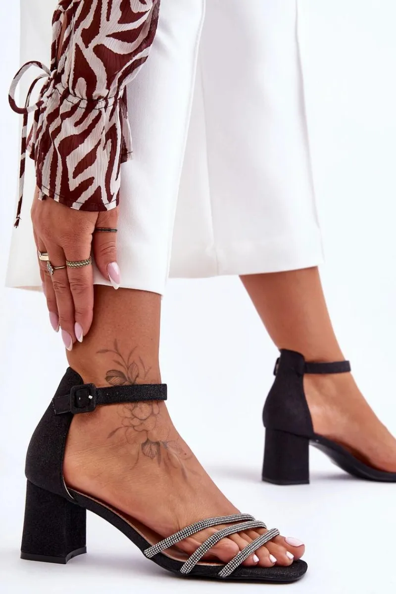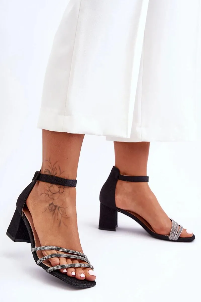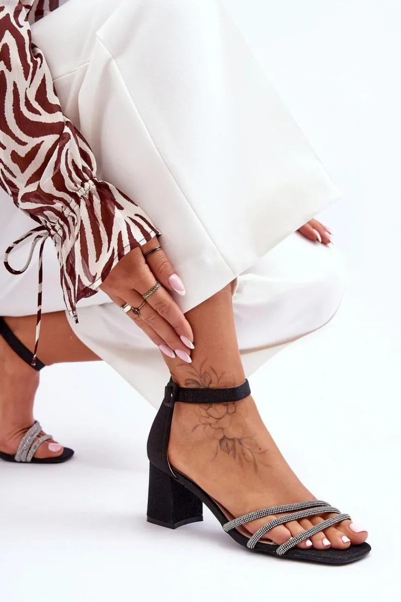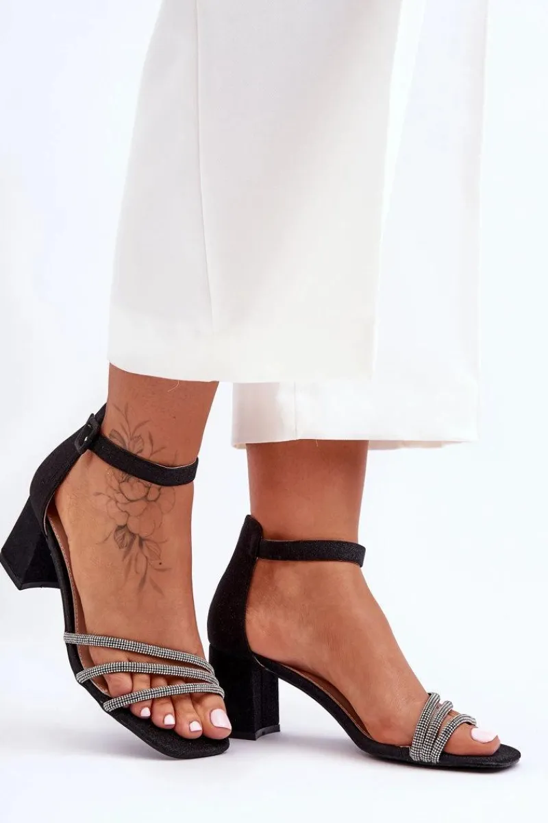 Klasyczne, błyszczące damskie sandałki na niskim obcasie w postaci słupka. Z przodu zdobione małymi cyrkoniami. Zapinane wokół kostki na regulowany pasek ze sprzączką. Idealne na różnego rodzaju imprezy! Koniecznie powinnaś je mieć w swojej szafie! Przy wyborze rozmiaru prosimy kierować tabelą rozmiarów.