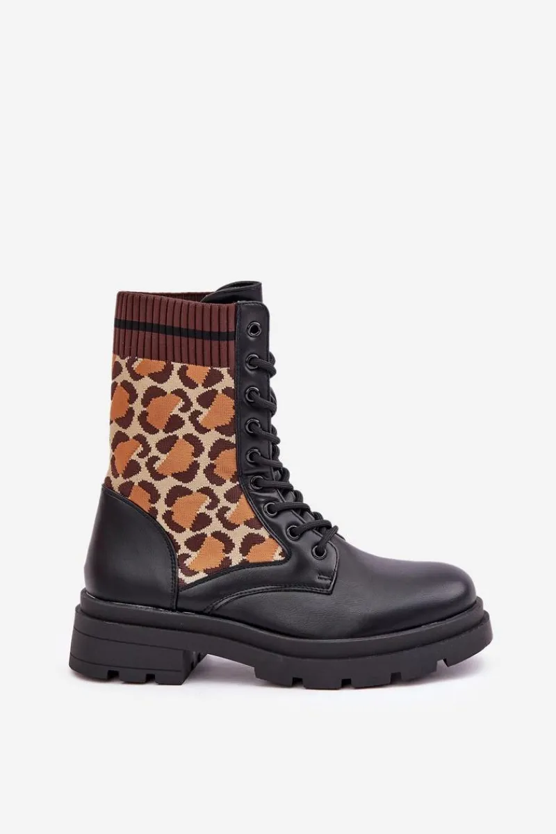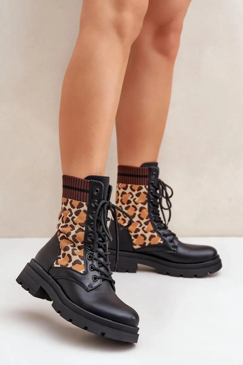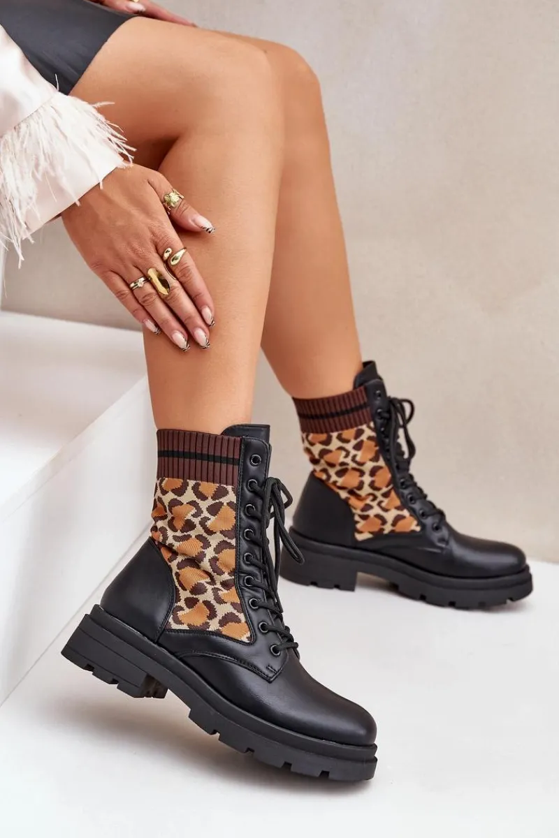 Botki damskie wykonane z połączenia eko skóry i tkaniny, ozdobione stylowym wzorem w panterkę. Model sznurowany z zaokrąglonymi noskami, co zapewnia wygodę i stabilność. Wnętrze ocieplane na wysokości stopy, idealne na chłodniejsze dni. Świetny wybór dla kobiet ceniących wygodę i modne akcenty. Przy wyborze rozmiaru prosimy sugerować się tabelą rozmiarów.