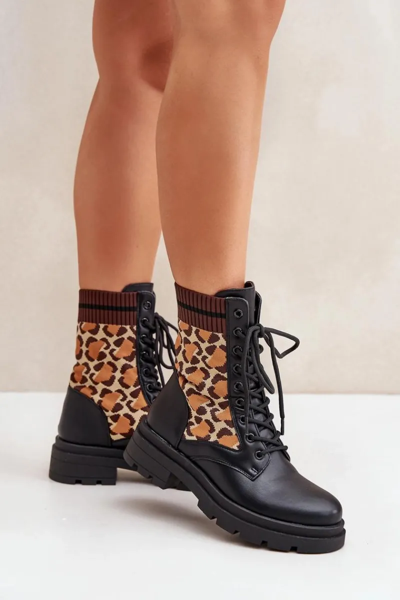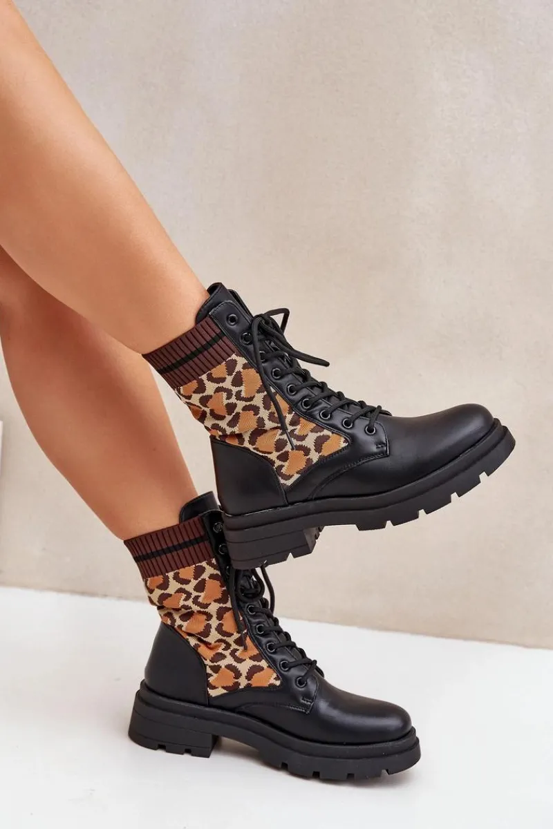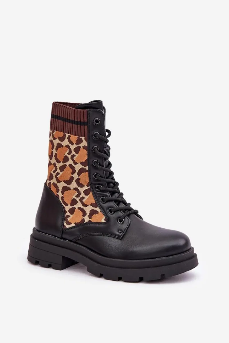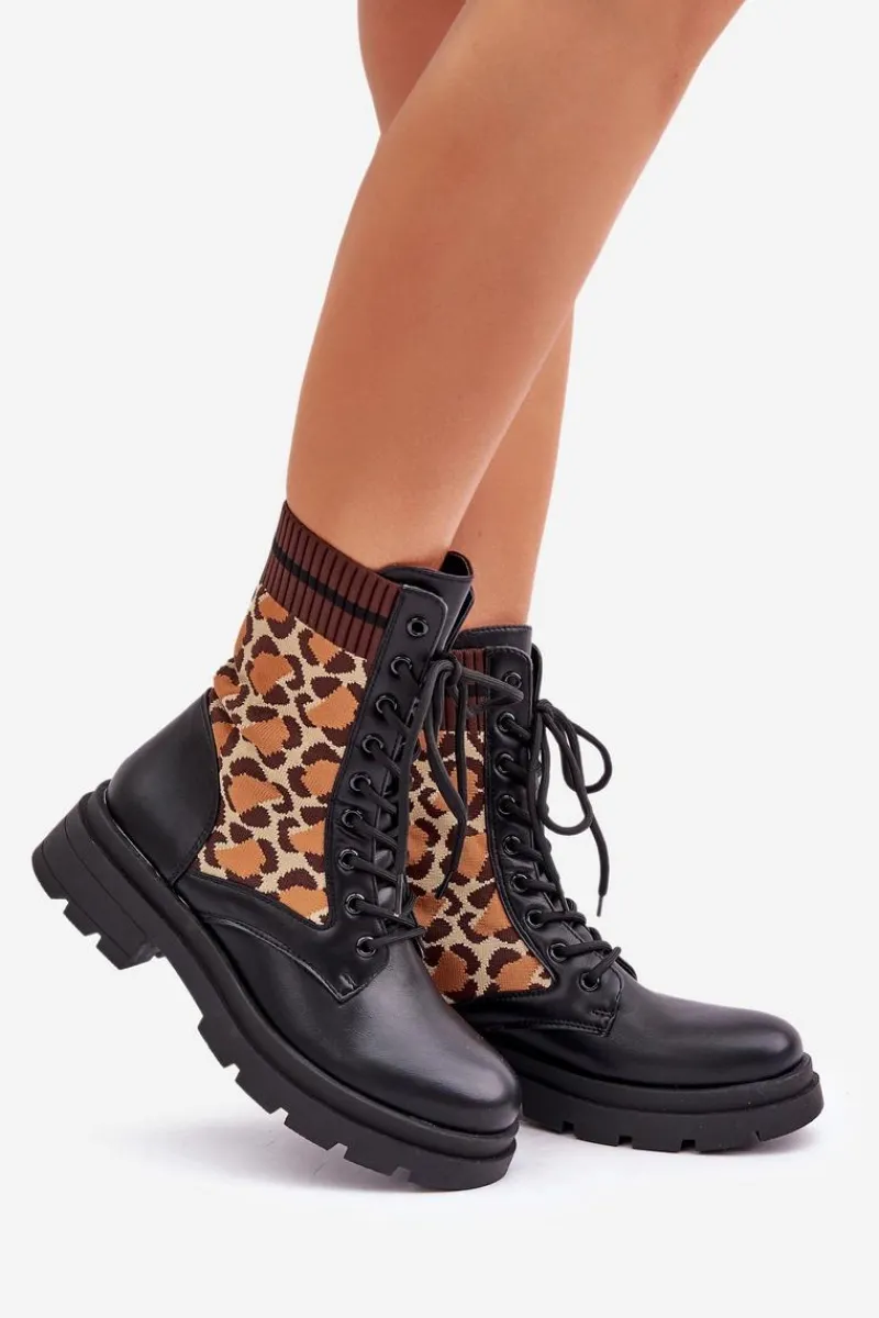 Botki damskie wykonane z połączenia eko skóry i tkaniny, ozdobione stylowym wzorem w panterkę. Model sznurowany z zaokrąglonymi noskami, co zapewnia wygodę i stabilność. Wnętrze ocieplane na wysokości stopy, idealne na chłodniejsze dni. Świetny wybór dla kobiet ceniących wygodę i modne akcenty. Przy wyborze rozmiaru prosimy sugerować się tabelą rozmiarów.