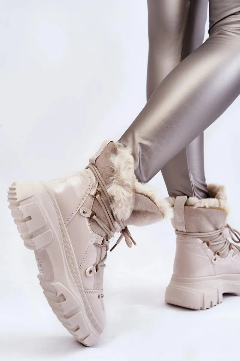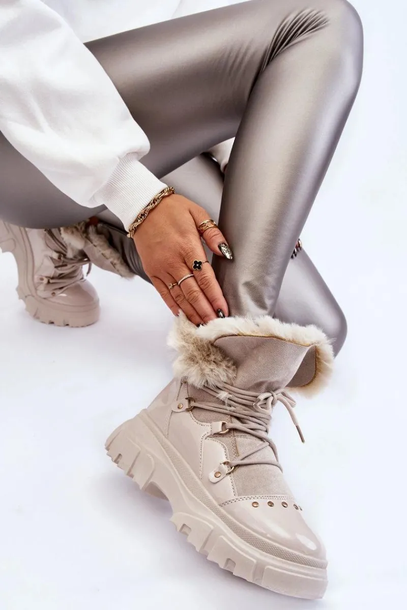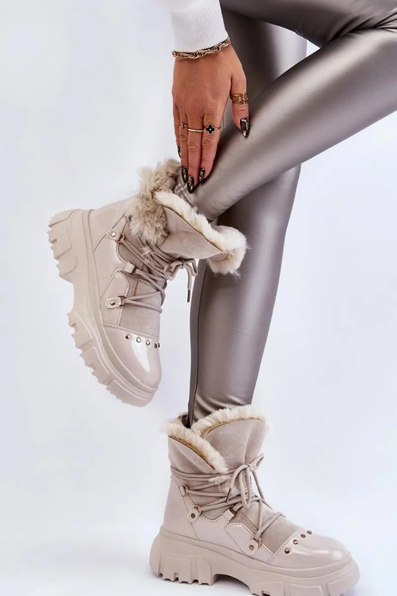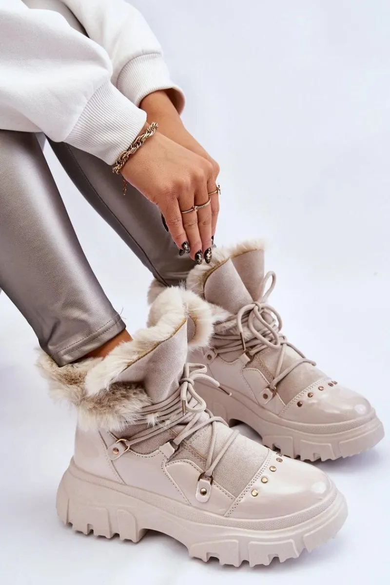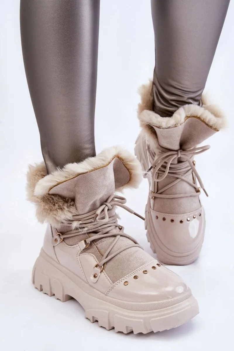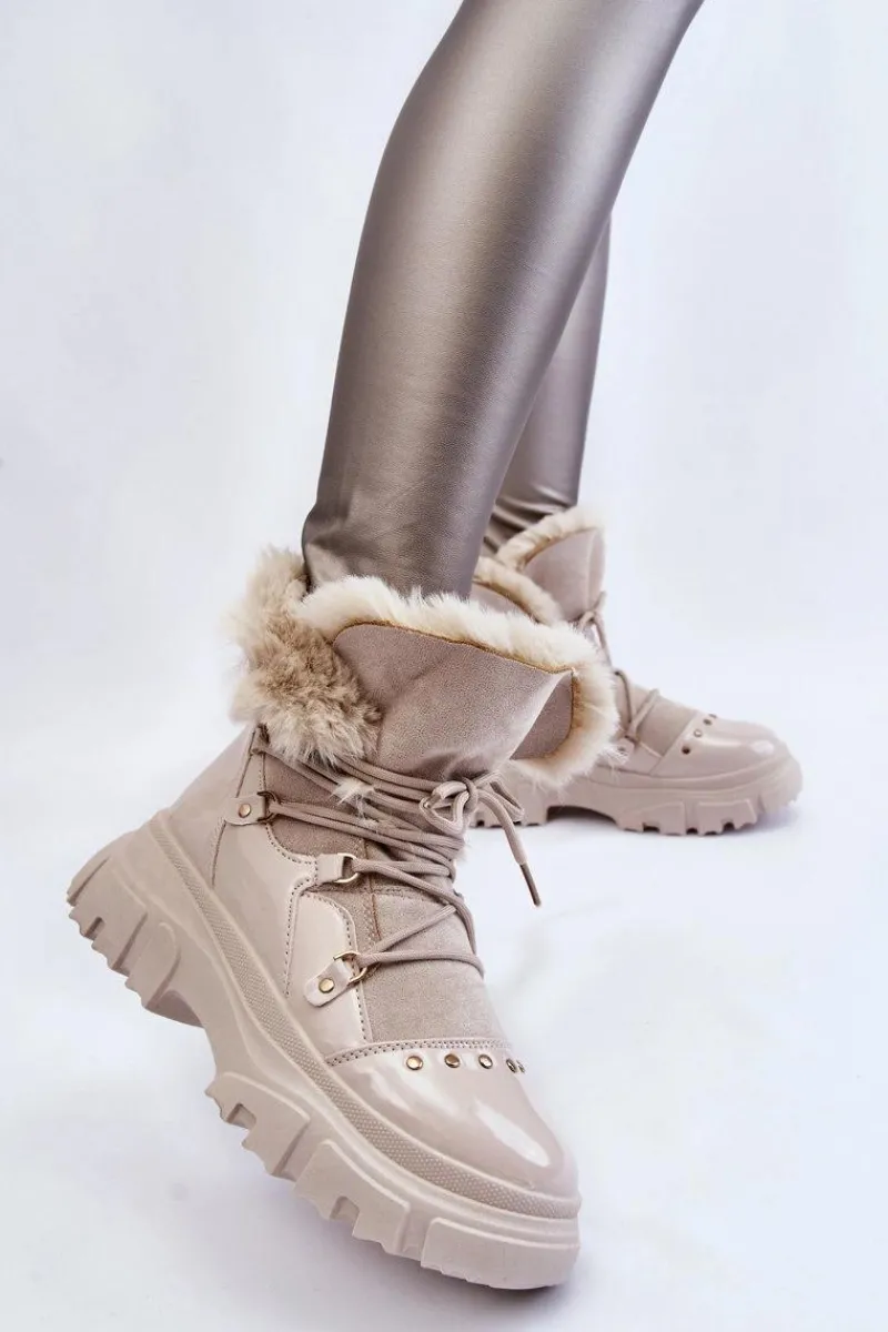 Świetne botki na płaskim obcasie i platformie z bieżnikiem będą pasować do wielu stylizacji! Wykonane z połączenia eko zamszu oraz eko skóry. Botki posiadają wewnątrz ocieplenie w postaci futerka. Model wsuwany, z dodatkowym sznurowaniem. Dodatkowo z przodu zostały ozdobione ćwiekami. Koniecznie powinnaś mieć ten model w swojej szafie! Przy wyborze rozmiaru prosimy sugerować się tabelą rozmiarów.
