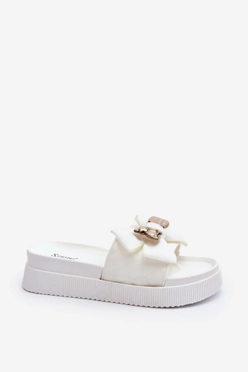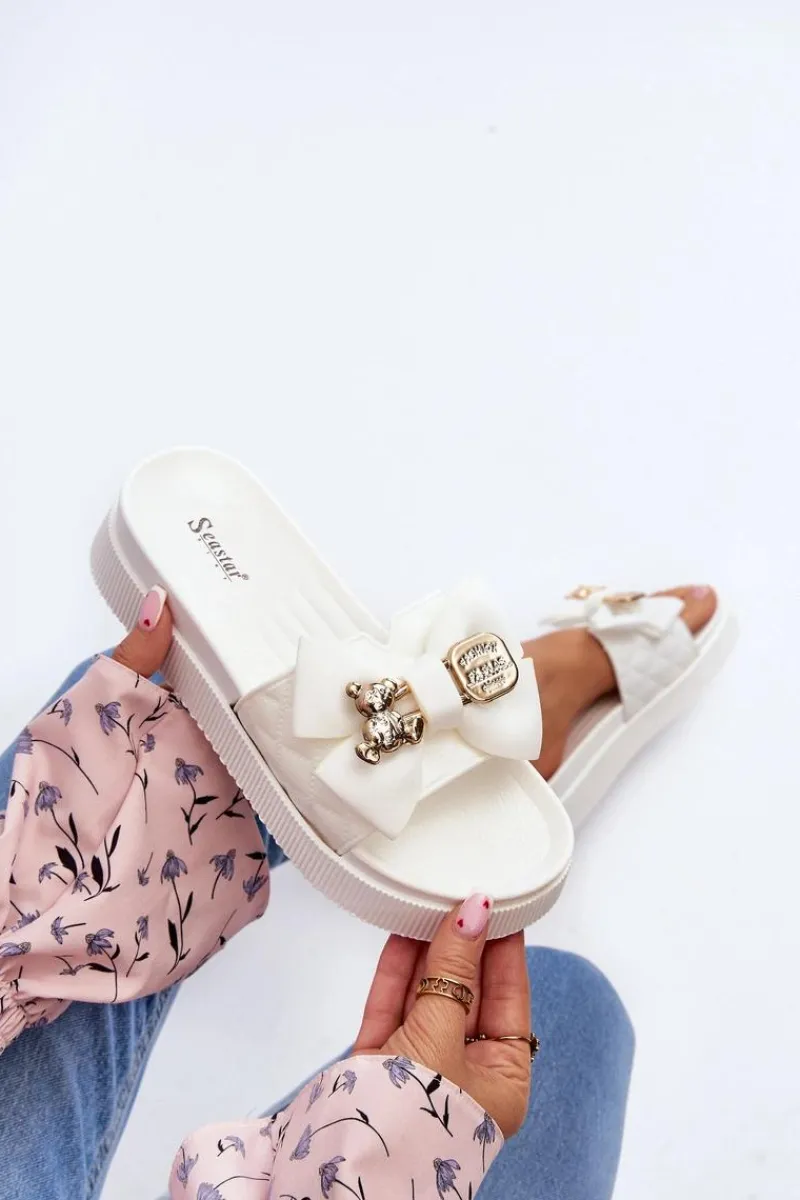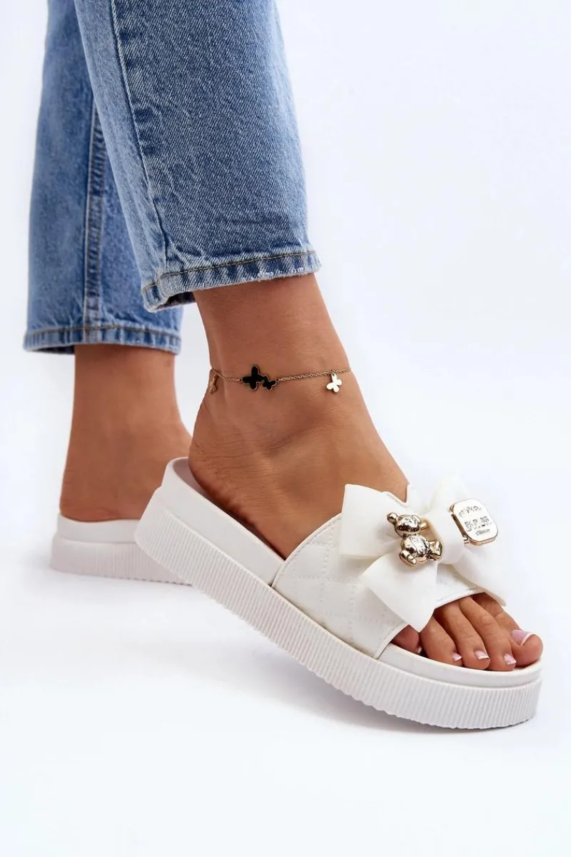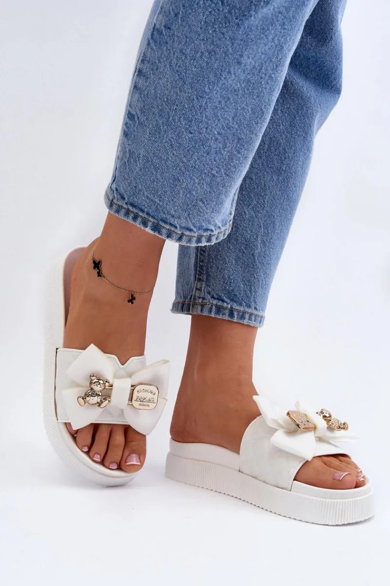 Damskie klapki wykonane z eko skóry. Osadzone na masywnej platformie. Model ten posiada materiałową kokardę i imitację agrafki z misiem i blaszką z napisem. Idealne klapki na nadchodzący sezon! Koniecznie powinnaś je mieć! Przy wyborze rozmiaru prosimy sugerować się tabelą rozmiarów.