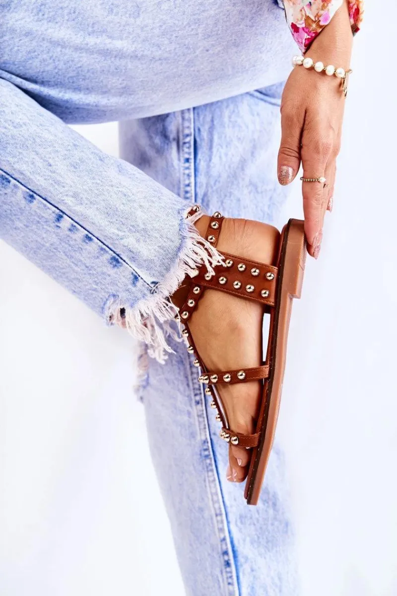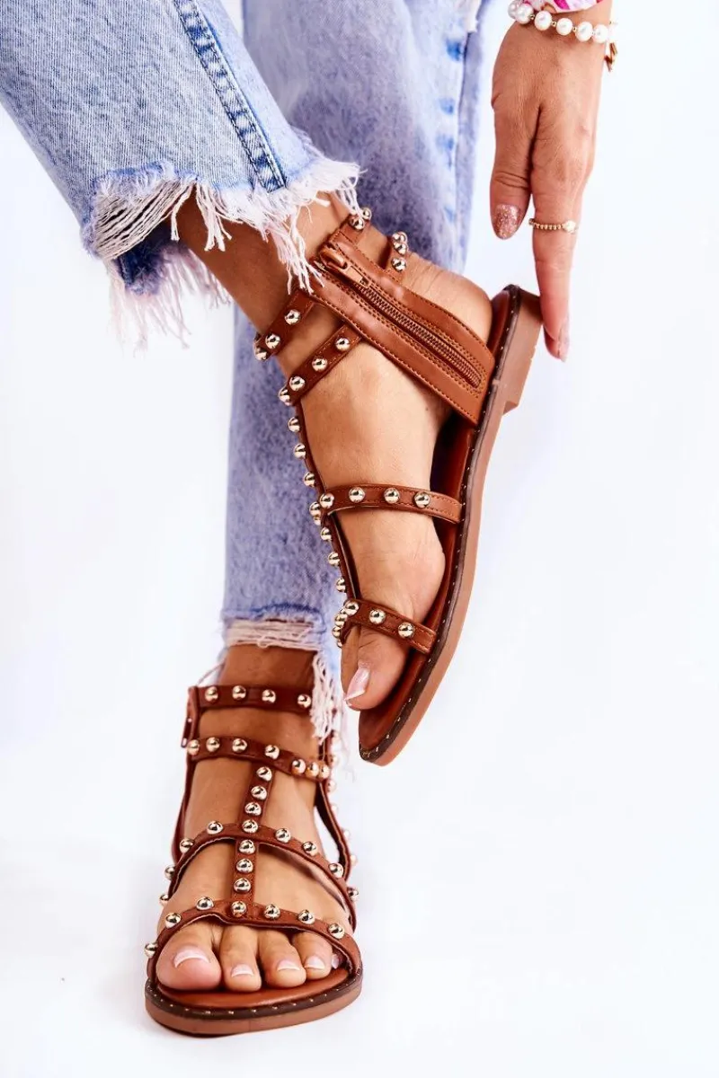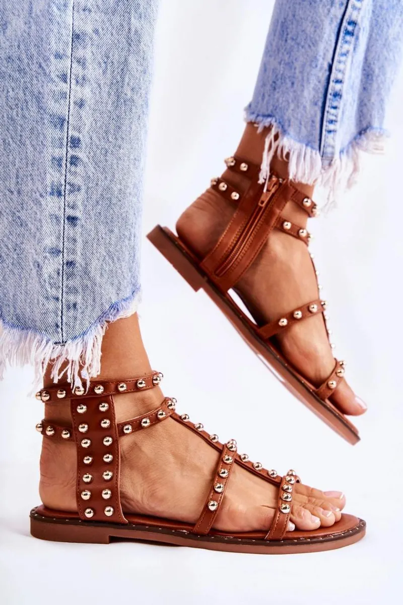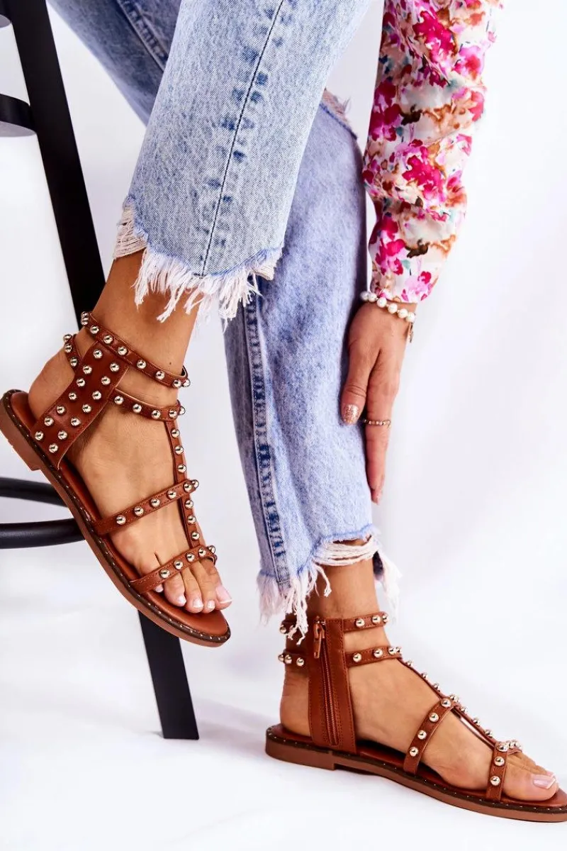 Damskie sandały z wysoką cholewką za kostkę. Osadzone na płaskim obcasie z antypoślizgową podeszwą. Buty posiadają ozdobne ćwieki. Zapinane na suwak z boku cholewki. Miękka wkładka wykonana z eko skóry pozwoli na wygodne użytkowanie obuwia. Nosek odkryty. Wokół podeszwy znajdują się ozdobne ćwieki. Ten ciekawy fason jest niezwykle przewiewny. Przy wyborze rozmiaru prosimy sugerować się tabelą rozmiarów.