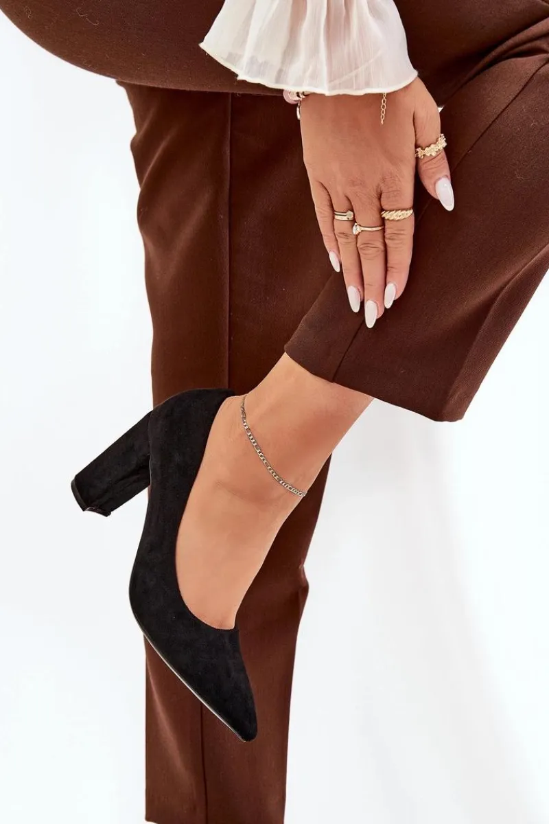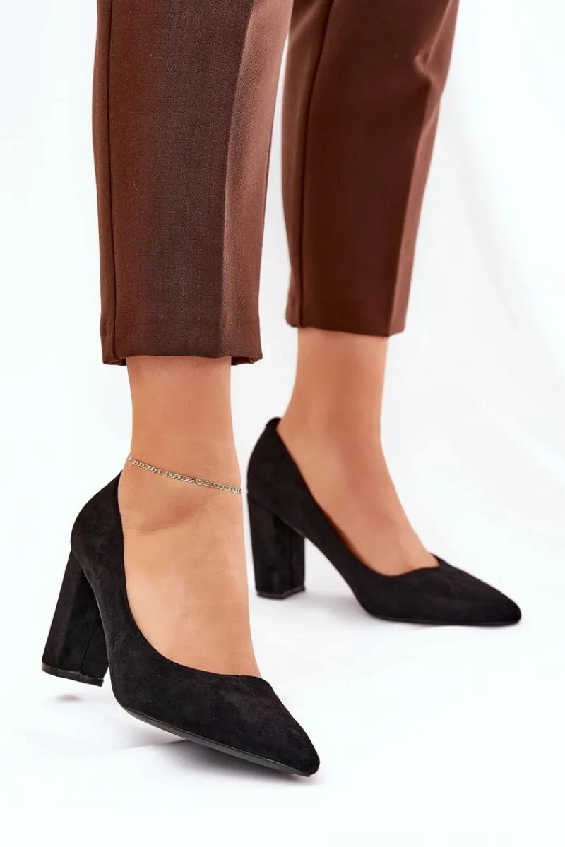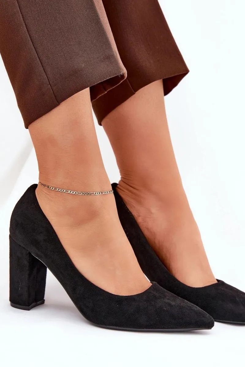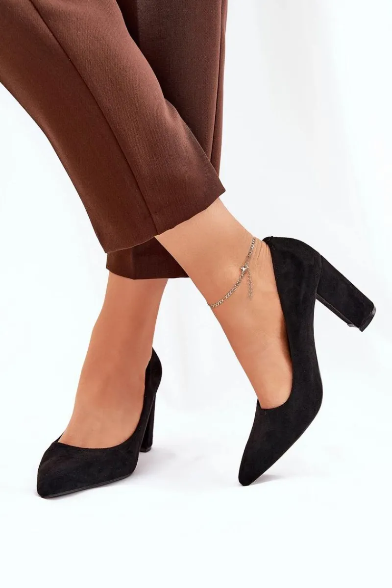 Czółenka wykonane z eko zamszu, osadzone na stabilnym obcasie typu słupek. Szpiczaste noski optycznie wysmuklają nogi, dodając sylwetce lekkości. Klasyczny fason sprawia, że będą idealnym wyborem na różne okazje – od formalnych spotkań po wieczorne wyjścia. Przy wyborze rozmiaru prosimy kierować się tabelą rozmiarów