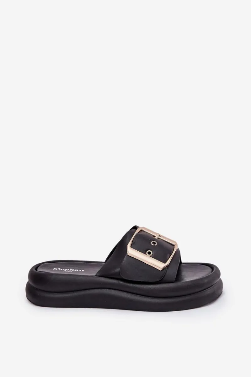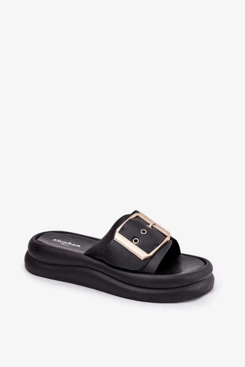 Klapki damskie na masywnej platformie to idealny wybór dla tych, którzy pragną połączyć wygodę z modnym stylem. Wykonane z ekologicznej skóry. Osadzone na masywnej platformie, która zapewni stabilność i wygodę noszenia przez cały dzień. Model ten wyróżnia duża, złota klamra z regulowanym paskiem. Idealne na letnie spacery czy wieczorne wyjścia. Przy wyborze rozmiaru prosimy sugerować się tabelą rozmiarów.