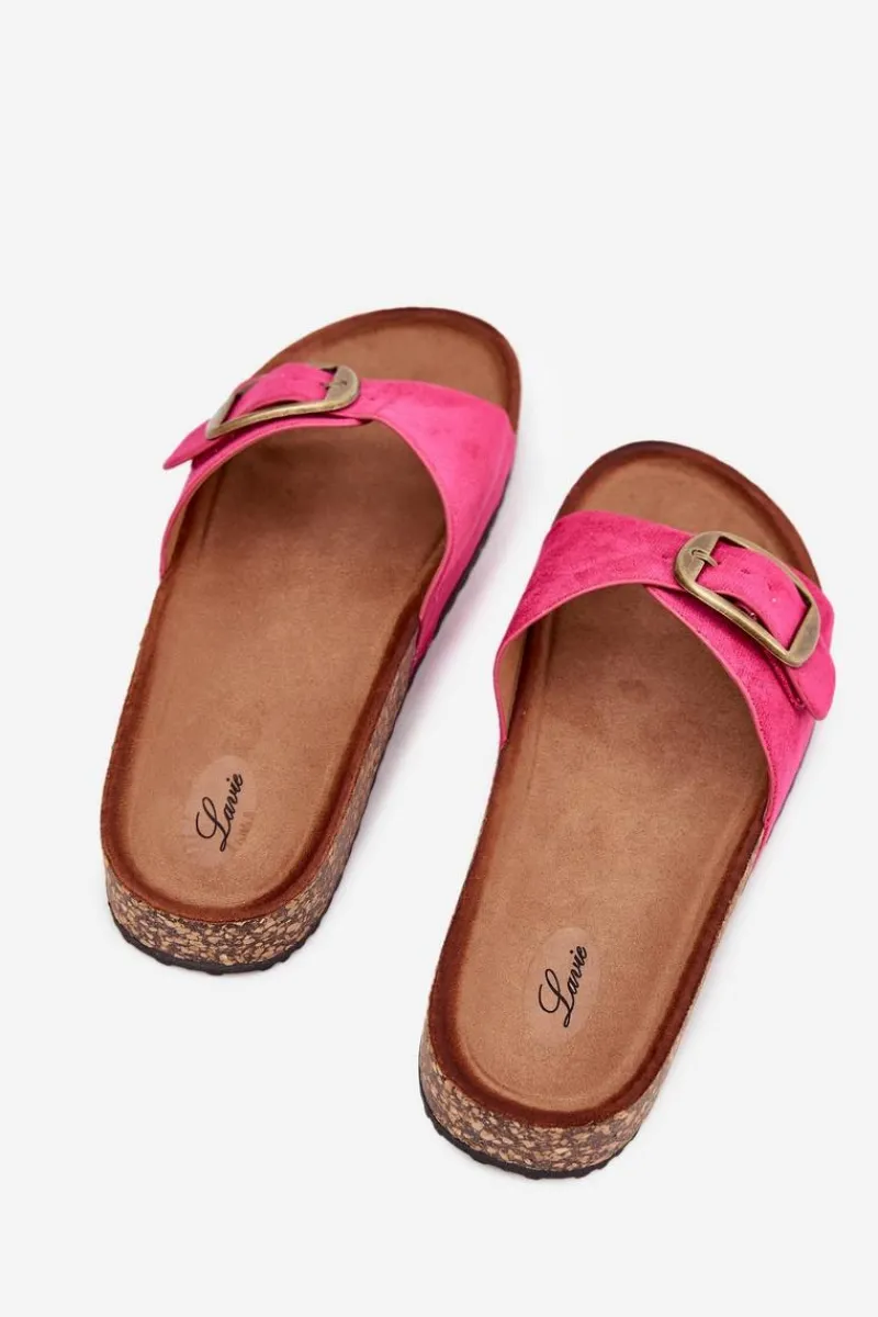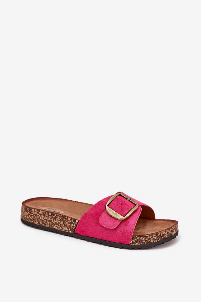 Klapki damskie wykonane z eko zamszu. Osadzone na korkowej platformie. Wyróżniają się klamrą z regulowanym paskiem, który umożliwia idealne dopasowanie do stopy. Profilowana wkładka zapewnia komfort przez cały dzień, a ich prosty wygląd sprawia, że są doskonałe do codziennych stylizacji. Idealne na letnie dni, pasują do sukienek, spódnic czy spodni, wprowadzając lekkość i styl do każdej kreacji. Przy wyborze rozmiaru rosimy sugerować się tabelą rozmiarów.