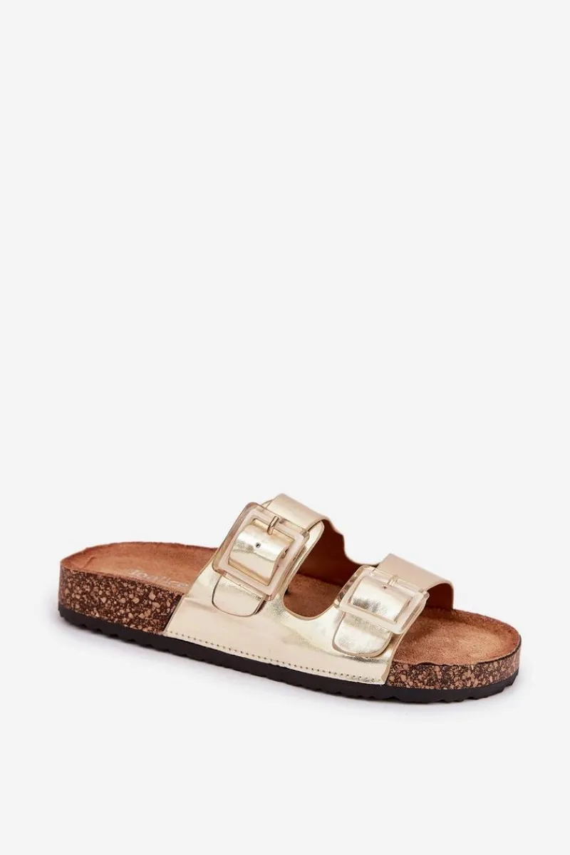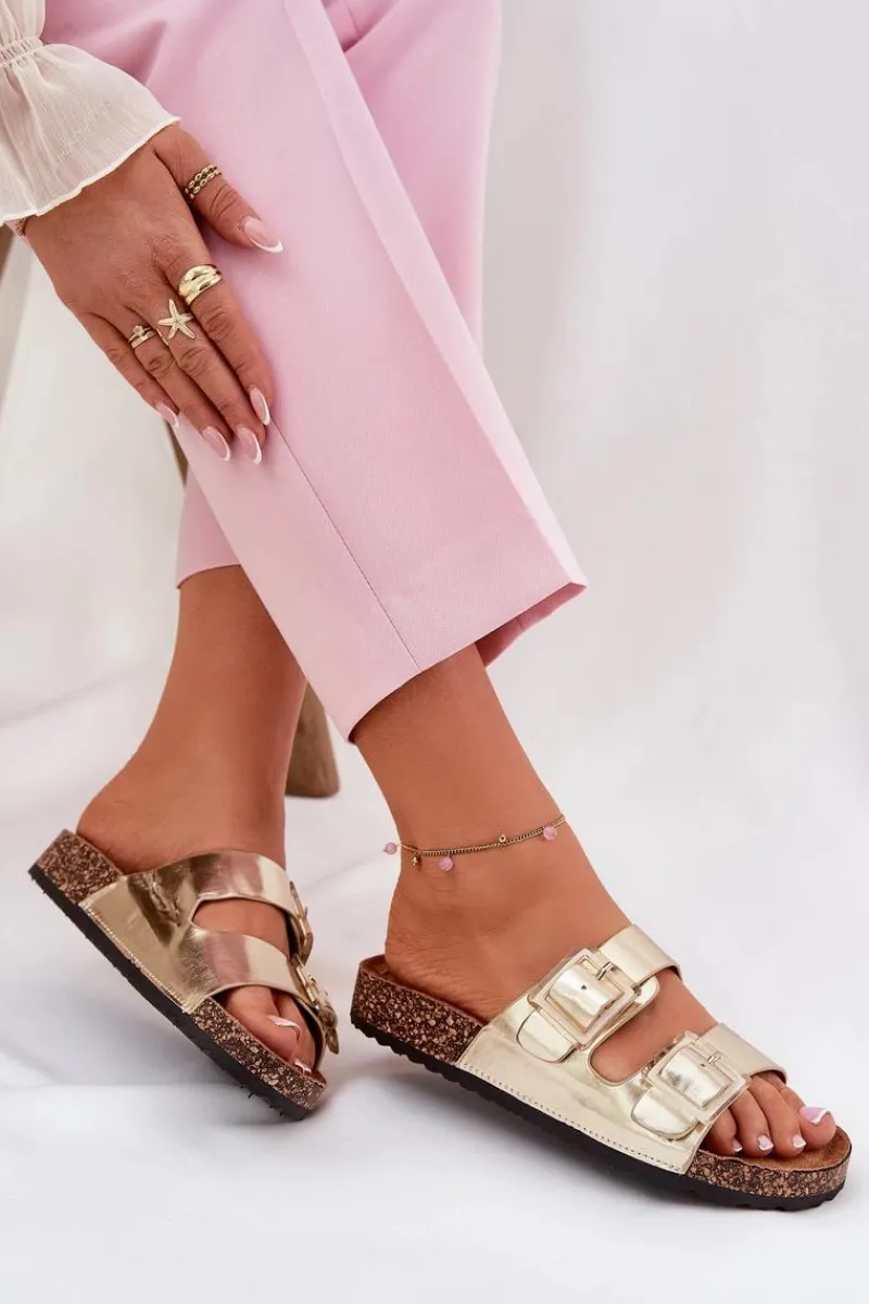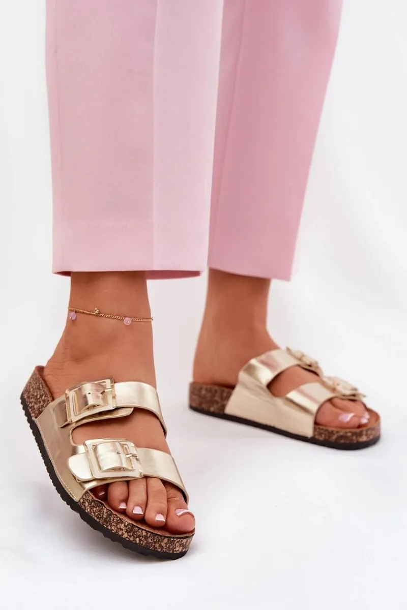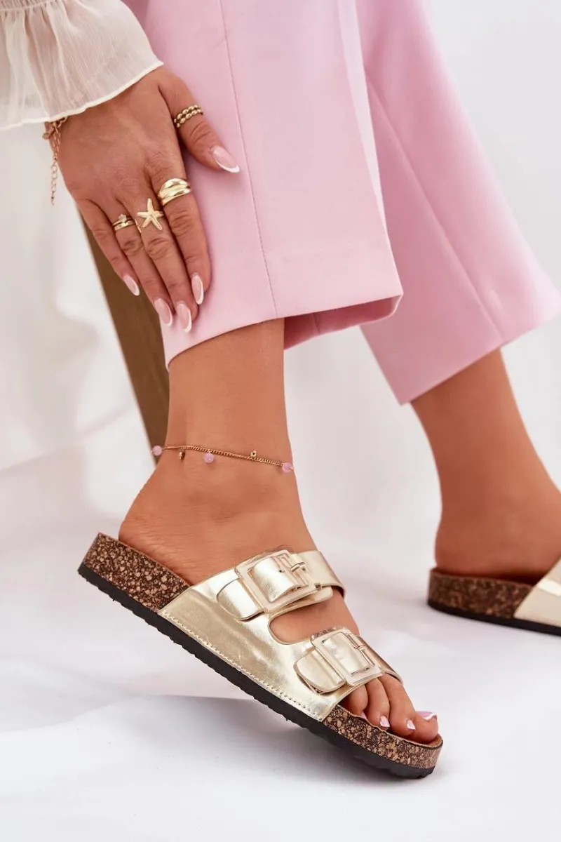 Best Boto Klapki Damskie Z Klamrami Na Korkowej Podeszwie Złote Sercele