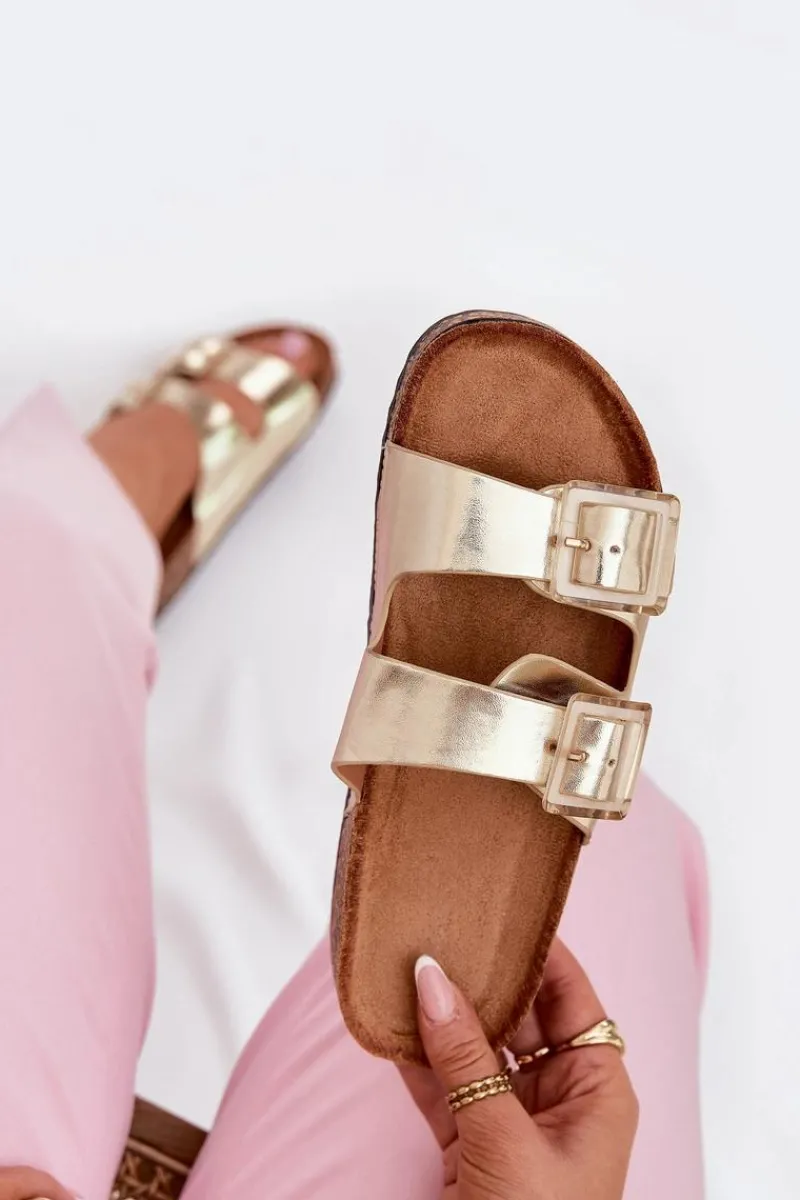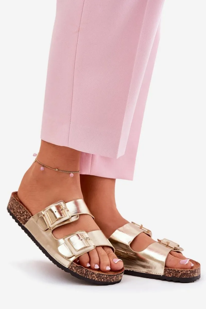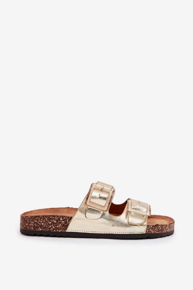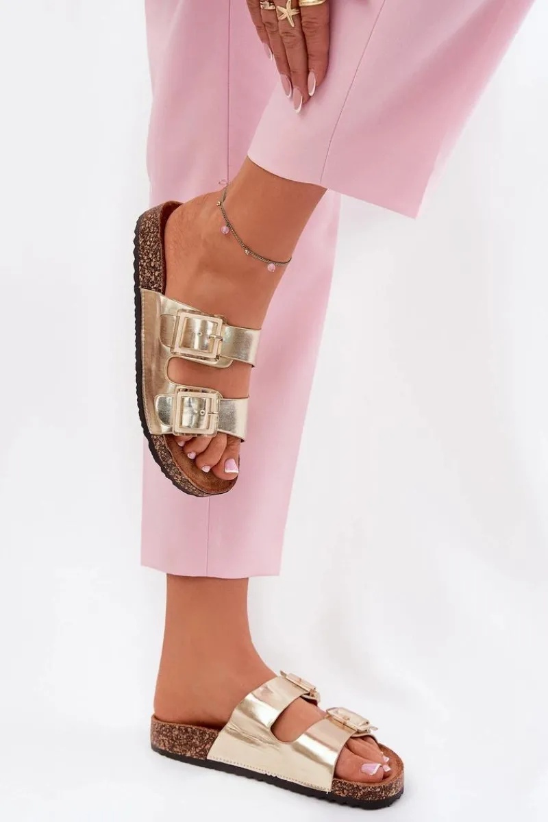 Best Boto Klapki Damskie Z Klamrami Na Korkowej Podeszwie Złote Sercele