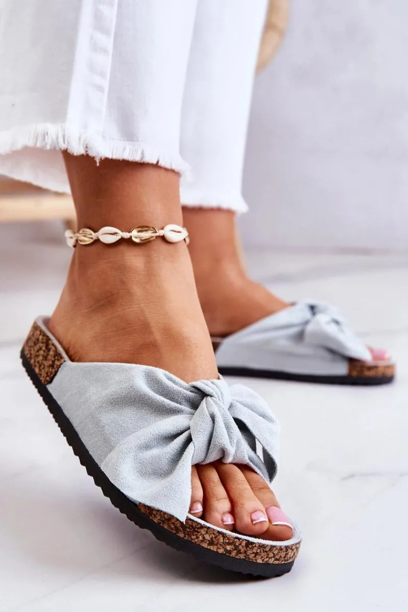 Piękne klapki na korkowej podeszwie. Buty posiadają profilowaną wkładkę, która zagwarantuje maksimum komfortu. Cholewka wykonana jest z miękkiego eko zamszu przyjemnego w dotyku. Podeszwa wykonana z tworzywa sztucznego. Urocza kokarda na przodzie. Klapki sprawdzą się zarówno na co dzień do pracy czy na zakupy, ale także do domu zamiast papci. Idealne na lato! Klapki dostępne są w wielu pięknych kolorach! Przy wyborze rozmiaru prosimy sugerować się tabelą rozmiarów.