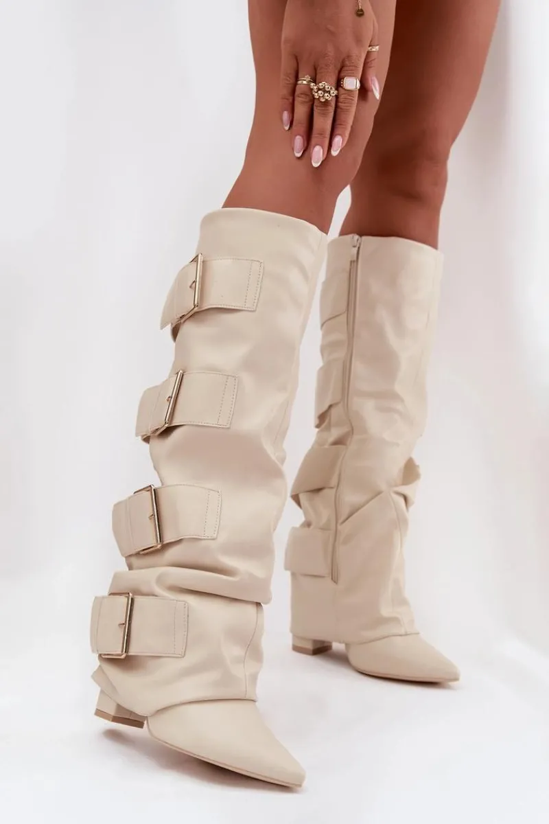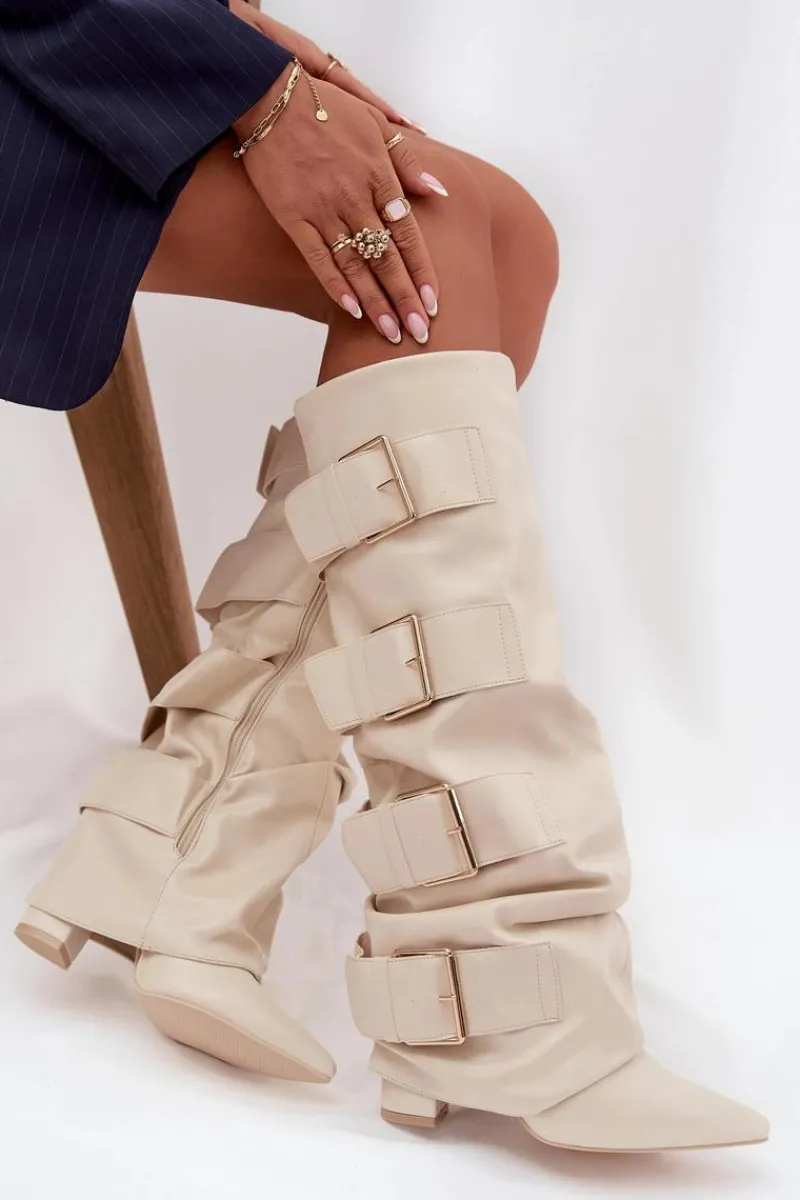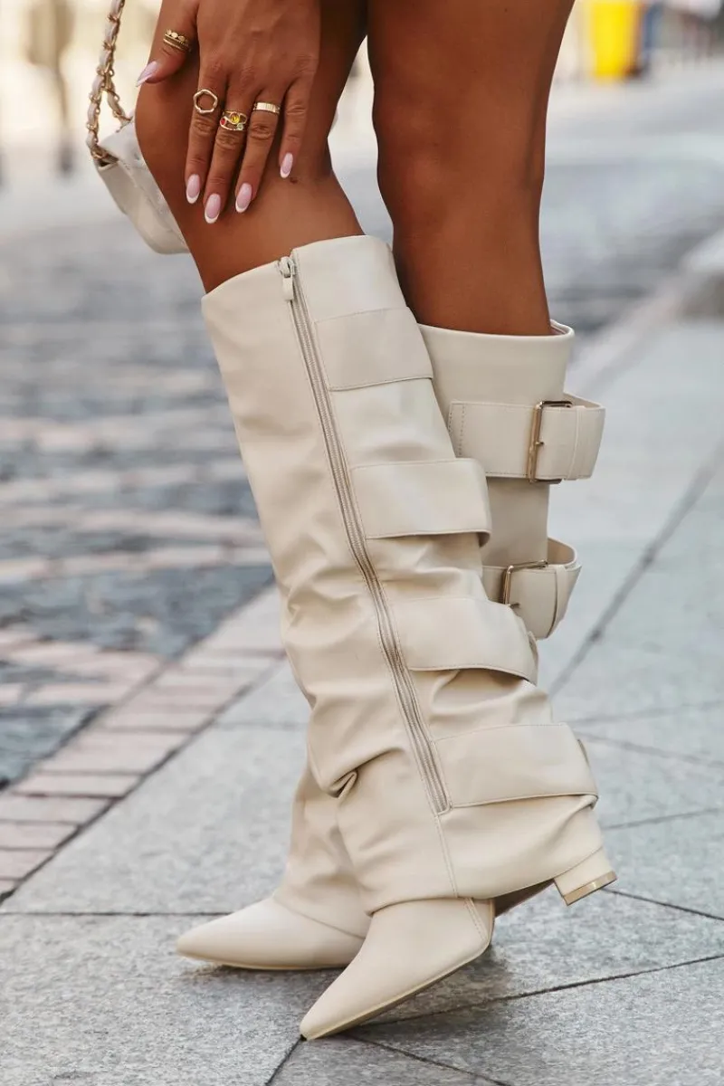 Stylowe kozaki damskie z eko skóry to połączenie elegancji i nowoczesnego wyglądu. Osadzone na obcasie typu słupek, ze szpiczastymi noskami, podkreślają kobiecą sylwetkę. Wywinięta cholewka, ozdobiona złotymi klamrami, przyciąga wzrok i dodaje charakteru, a zamek ułatwia szybkie zakładanie i zdejmowanie. Doskonale komponują się z sukienkami i spódnicami, wprowadzając modny, wyrafinowany akcent do każdej stylizacji. Przy wyborze rozmiaru prosimy sugerować się tabelą rozmiarów.