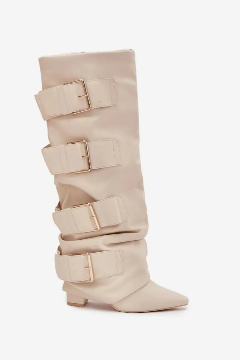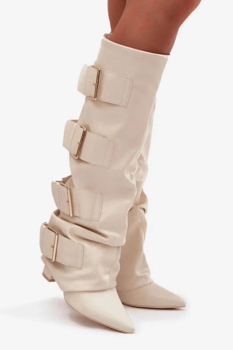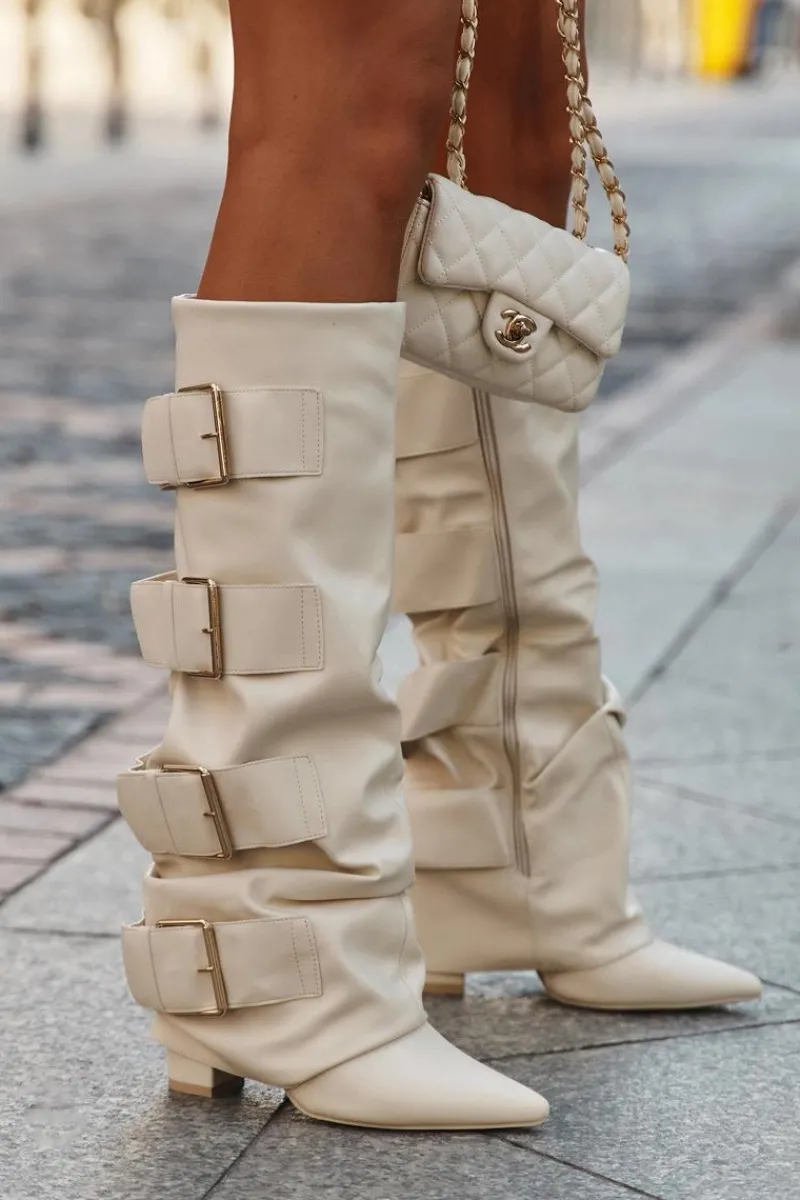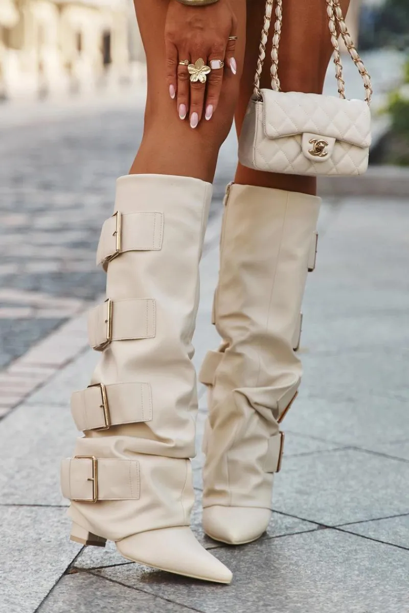 Stylowe kozaki damskie z eko skóry to połączenie elegancji i nowoczesnego wyglądu. Osadzone na obcasie typu słupek, ze szpiczastymi noskami, podkreślają kobiecą sylwetkę. Wywinięta cholewka, ozdobiona złotymi klamrami, przyciąga wzrok i dodaje charakteru, a zamek ułatwia szybkie zakładanie i zdejmowanie. Doskonale komponują się z sukienkami i spódnicami, wprowadzając modny, wyrafinowany akcent do każdej stylizacji. Przy wyborze rozmiaru prosimy sugerować się tabelą rozmiarów.