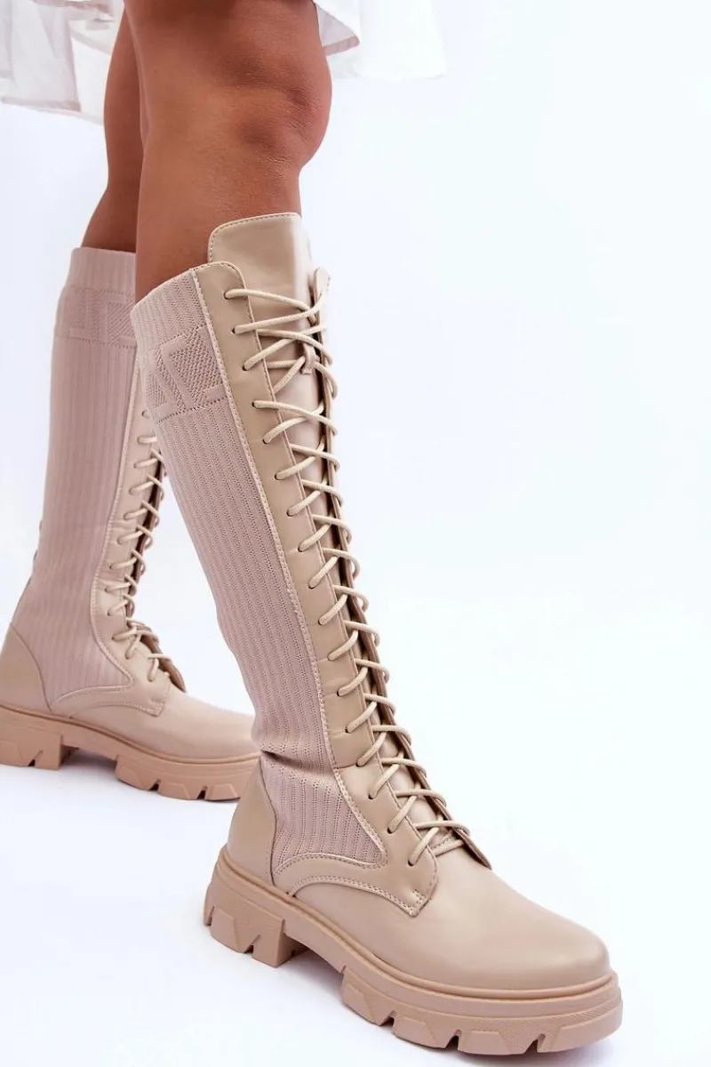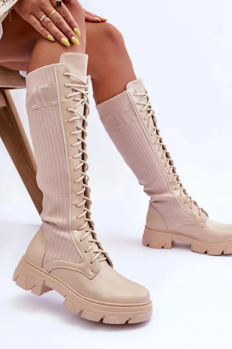 Modne damskie kozaki zostały wykonane z połączenia eko skóry oraz elastycznej tkaniny. Cholewka do kolana. Model osadzony na płaskim obcasie i platformie. Buty te posiadają usztywniany zapiętek. Model wsuwany z dodatkowym wiązaniem. Te klasyczne kozaki świetnie będą pasować do jesiennych stylizacji. Modny fason, który powinnaś mieć! Przy wyborze rozmiaru prosimy kierować tabelą rozmiarów.