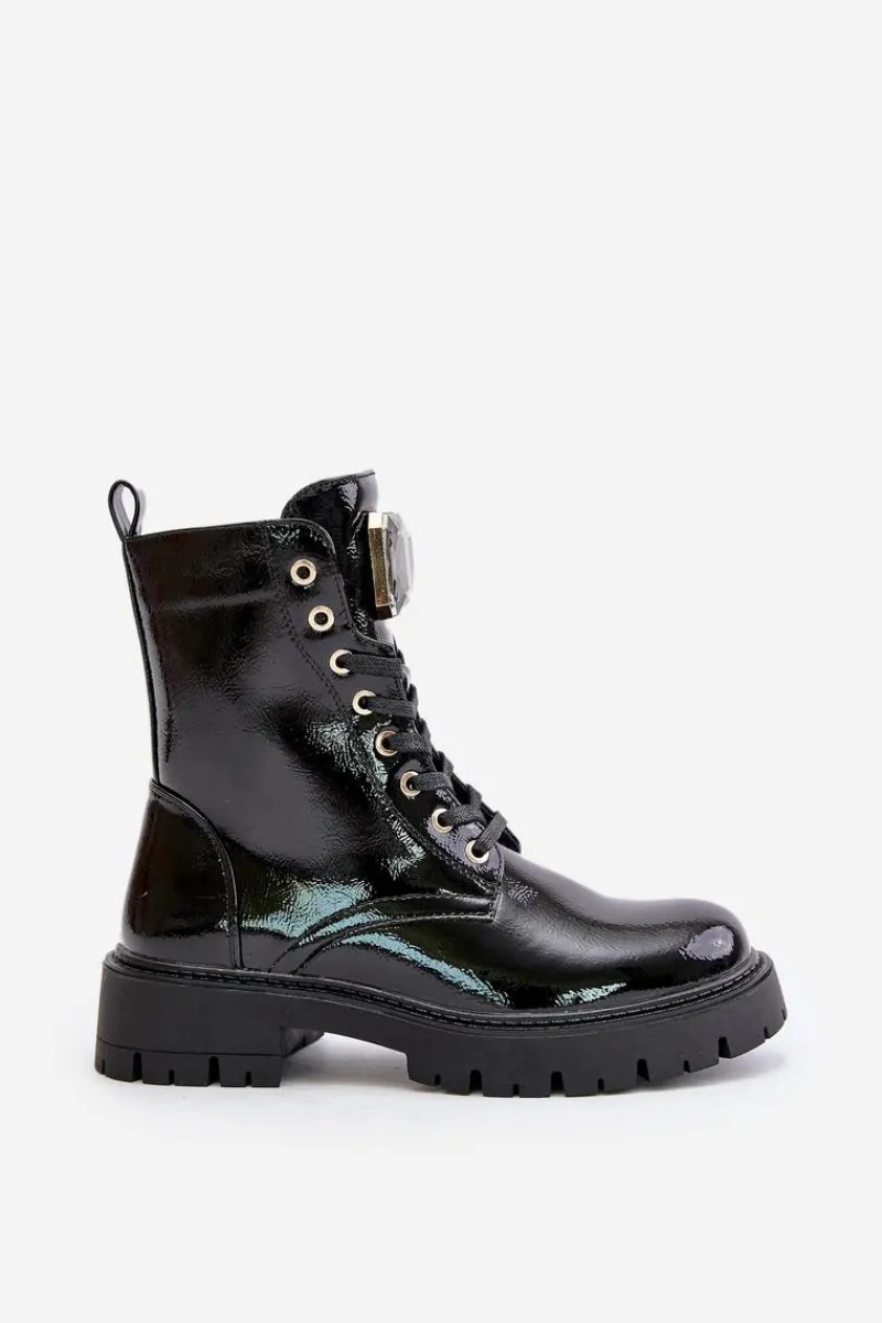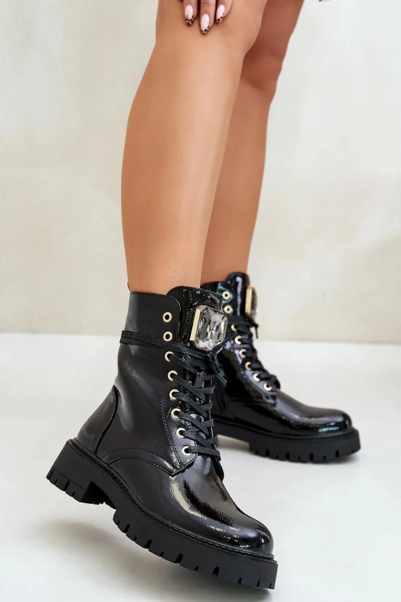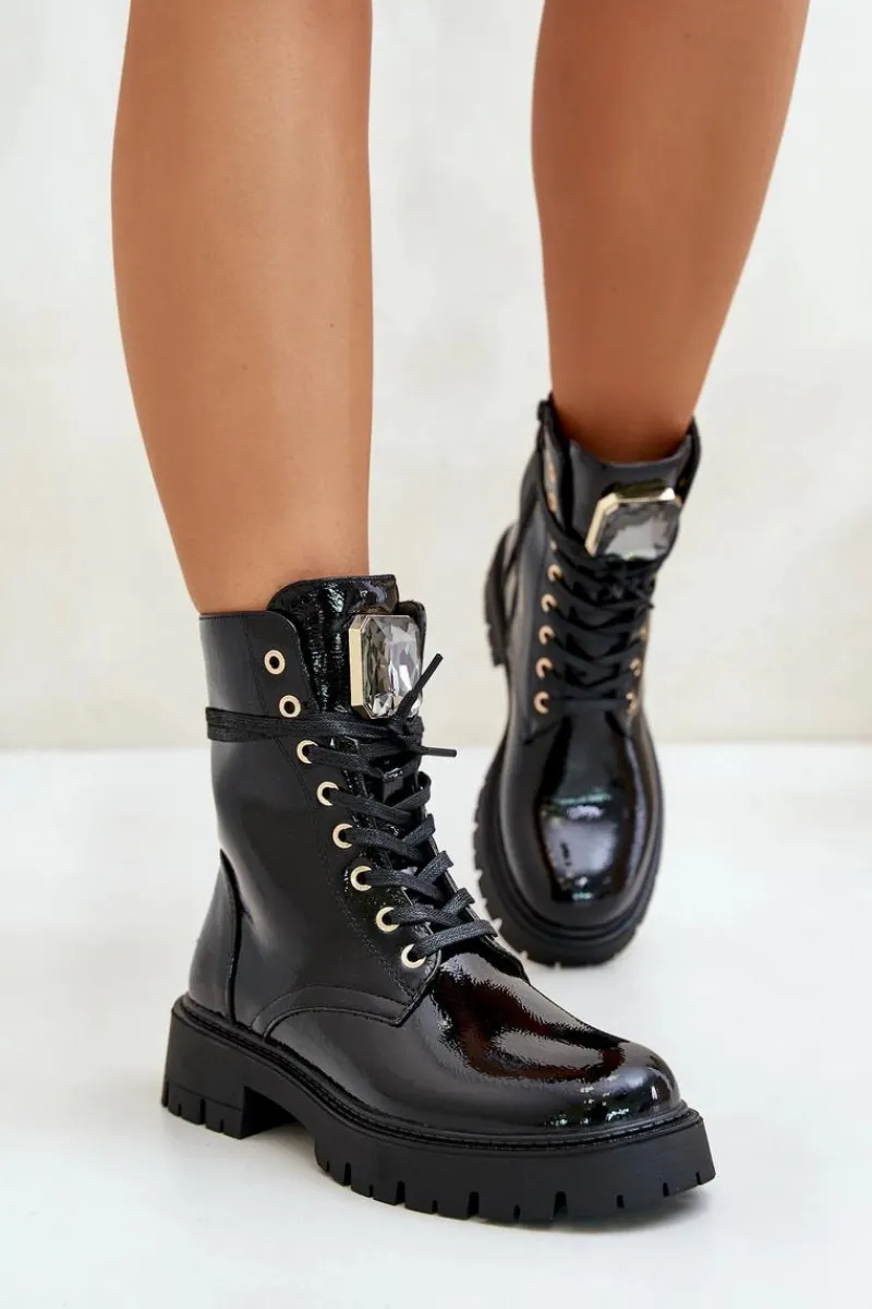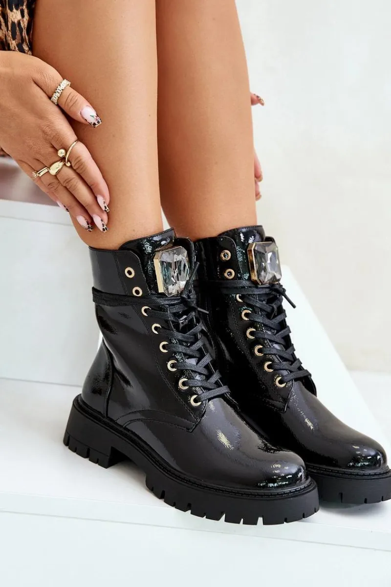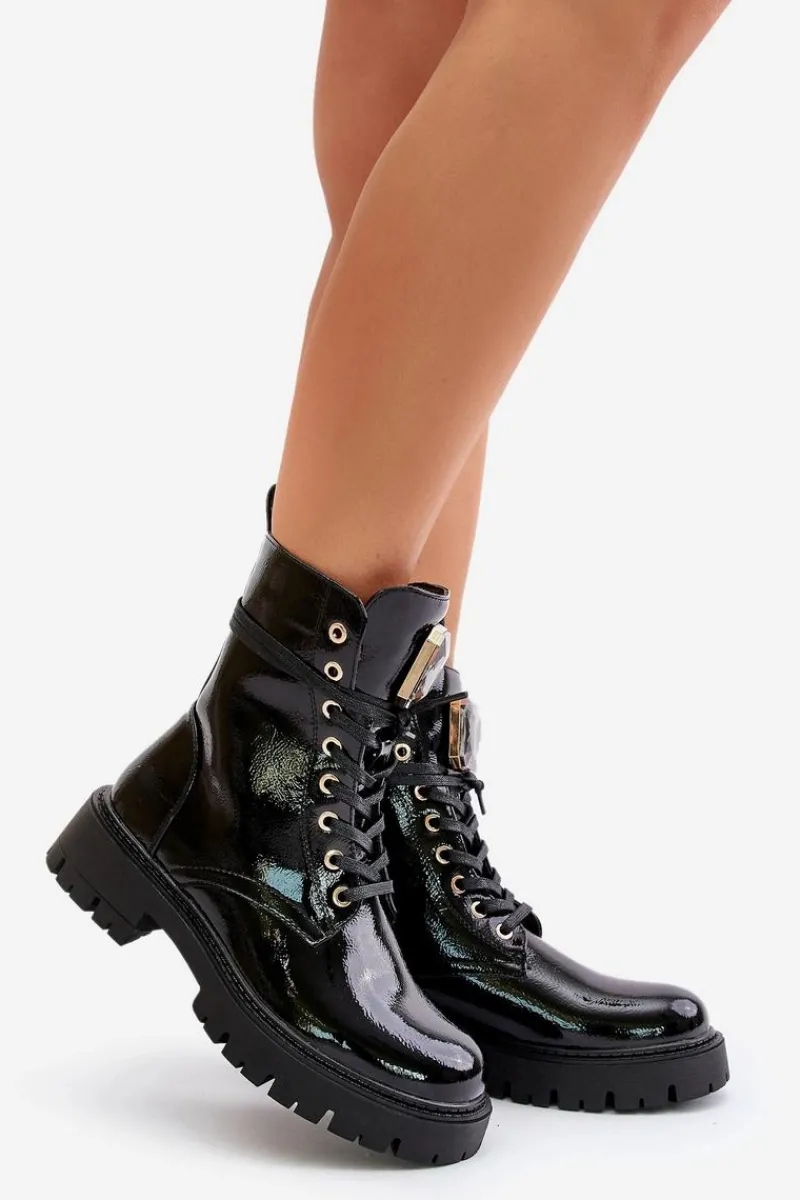 Te stylowe botki typu workery to idealne obuwie na chłodniejsze dni. Wykonane z eko skóry. Ocieplone wnętrze zapewnia komfort termiczny. Głównym atutem tego modelu jest biżuteryjna ozdoba na języku. Posiadają zamek błyskawiczny dla łatwego zakładania, jak i sznurowanie, które pozwala na idealne dopasowanie do stopy. Botki te doskonale sprawdzą się idealnie w codziennych stylizacjach, jak i podczas dłuższych spacerów na świeżym powietrzu. Przy wyborze rozmiaru prosimy sugerować się tabelą rozmiarów.