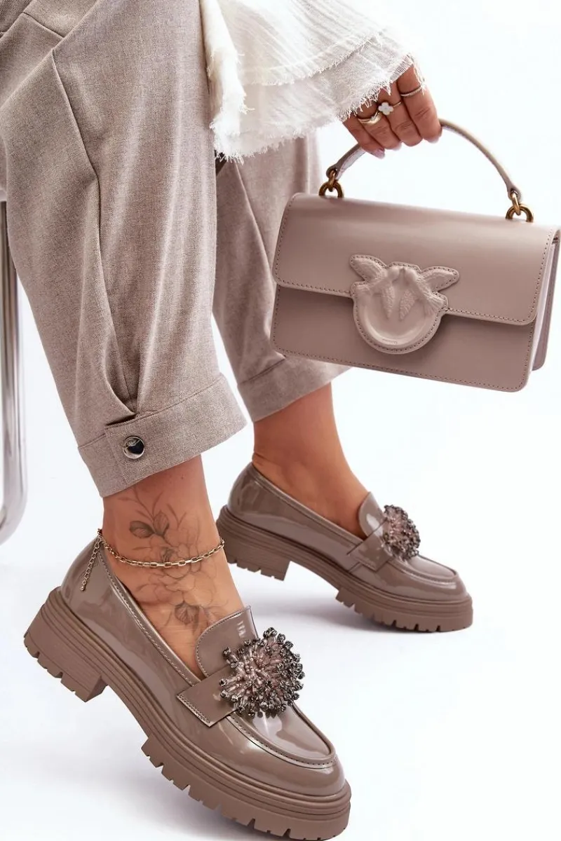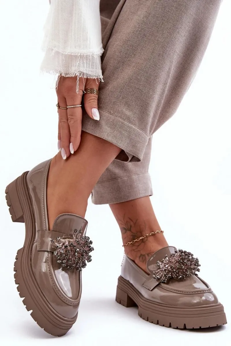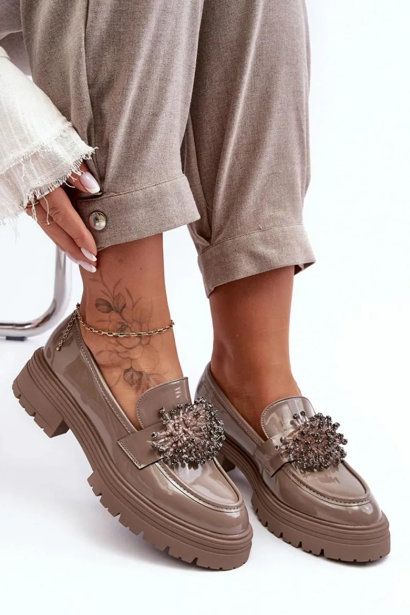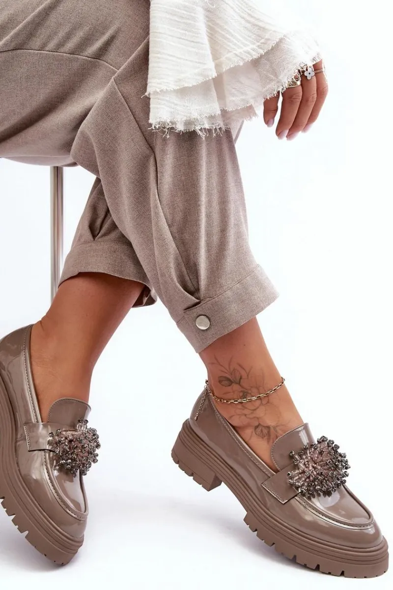 Klasyczne damskie półbuty wykonane z eko skóry. Osadzone na grubej podeszwie i płaskim obcasie. Noski w migdał. Wygodna eko skórzana wkładka zapewni komfort podczas użytkowania. Z przodu na pasku ozdoba. Model ten będzie idealny niemalże do każdej jesiennej stylizacji! Przy wyborze rozmiaru prosimy sugerować się tabelą rozmiarów.
