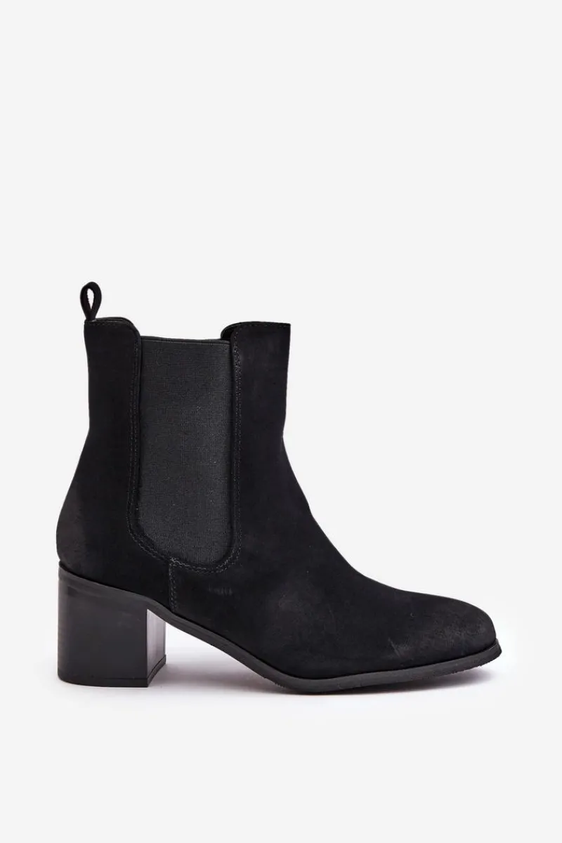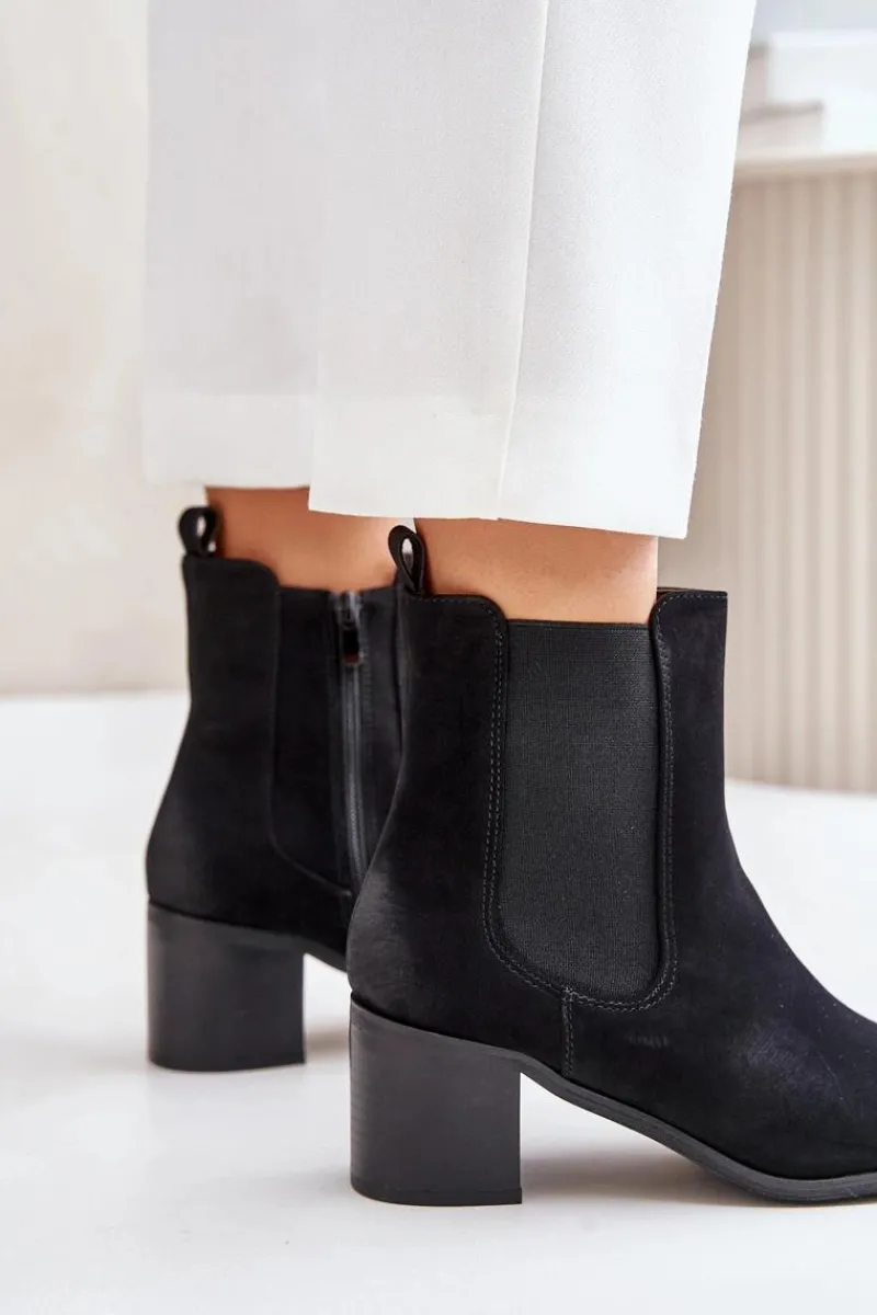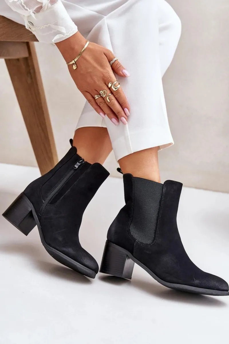 Botki damskie wykonane z eko zamszu. Charakteryzują się obcasem w formie słupka oraz zaokrąglonymi noskami. Usztywniony zapiętek zapewnia stabilność i wygodę podczas użytkowania. Na cholewce elastyczna wstawka. Środek ocieplany kocem obuwniczym. Te botki będą idealnym dodatkiem do jesiennych stylizacji! Przy wyborze rozmiaru prosimy sugerować się tabelą rozmiarów.