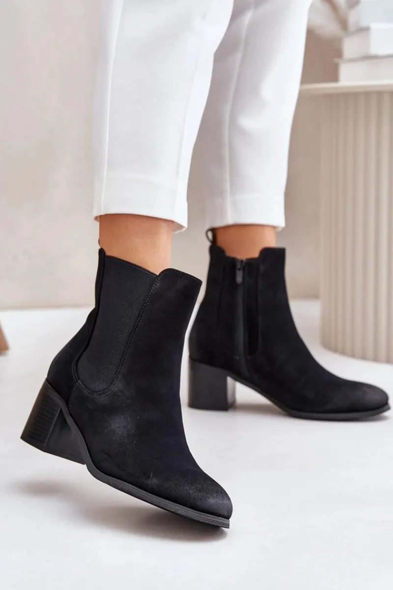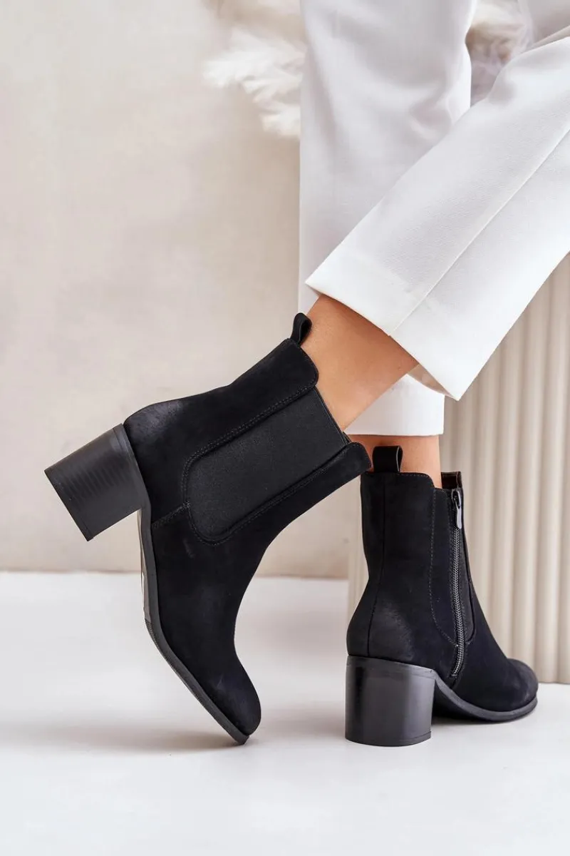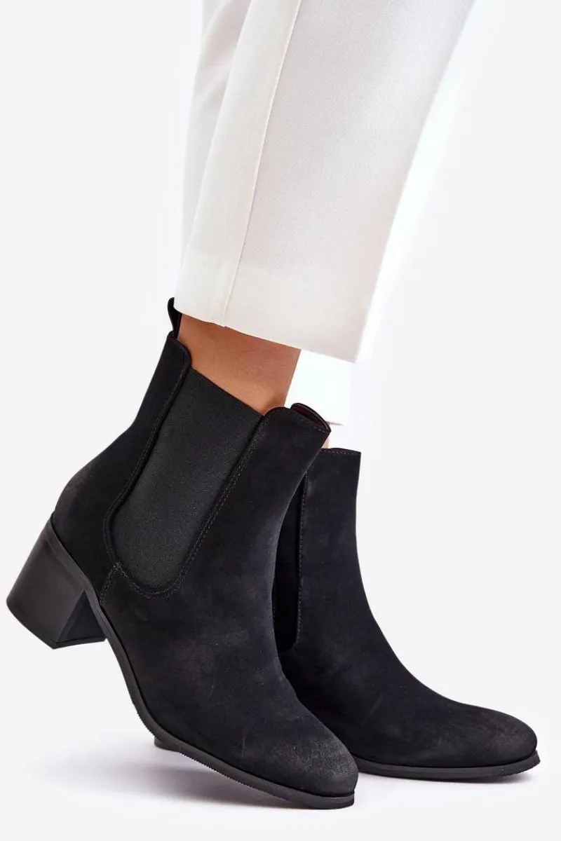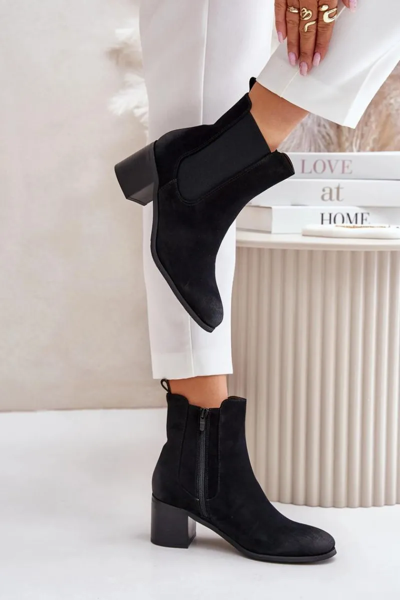 Botki damskie wykonane z eko zamszu. Charakteryzują się obcasem w formie słupka oraz zaokrąglonymi noskami. Usztywniony zapiętek zapewnia stabilność i wygodę podczas użytkowania. Na cholewce elastyczna wstawka. Środek ocieplany kocem obuwniczym. Te botki będą idealnym dodatkiem do jesiennych stylizacji! Przy wyborze rozmiaru prosimy sugerować się tabelą rozmiarów.