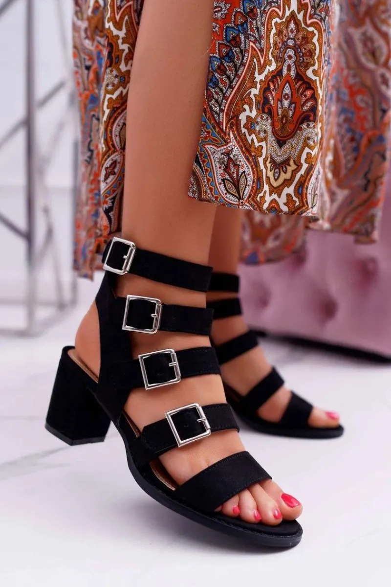 Wspaniałe damskie sandały, które uzupełnią naszą garderobę. Wykonane z delikatnego w dotyku eko-zamszu. Oparte na stabilnym, średniej wysokości słupku. zapinane na 4 sprzączki, które są również piękną ozdobą. Dwa pierwsze paski posiadają wszytą gumkę dzięki której będą jeszcze łatwiejsze w dopasowaniu. Przy wyborze rozmiaru prosimy sugerować się tabelą rozmiarów, która dostępna jest po najechaniu bądź kliknięciu w dany rozmiar.