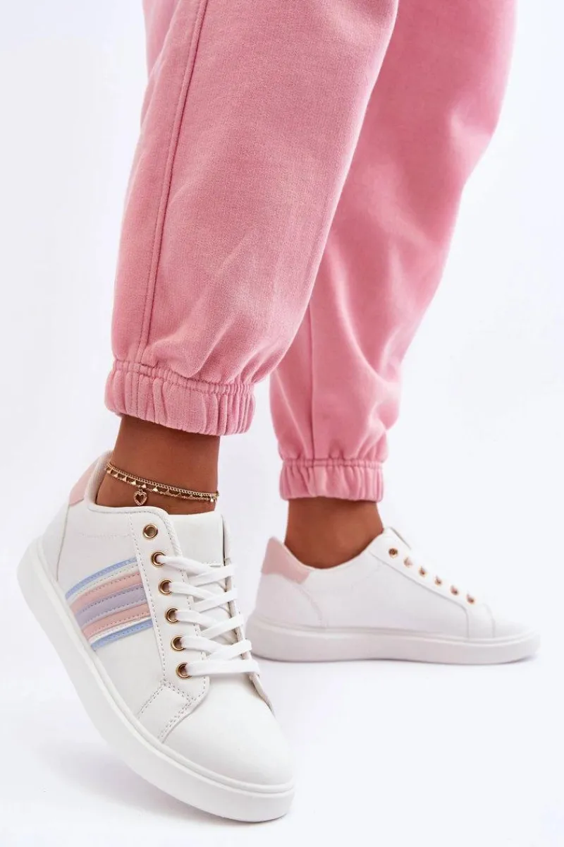 Klasyczne sneakersy damskie zostały wykonane z eko skóry. Buty te posiadają klasyczne sznurowanie i zdobienia w postaci cienkich pasków. Model został osadzony na platformie z zaokrąglonym noskiem. Szukasz butów do codziennego użytkowania, do pracy czy szkoły? Ten model będzie idealny! Przy wyborze rozmiaru prosimy kierować tabelą rozmiarów.