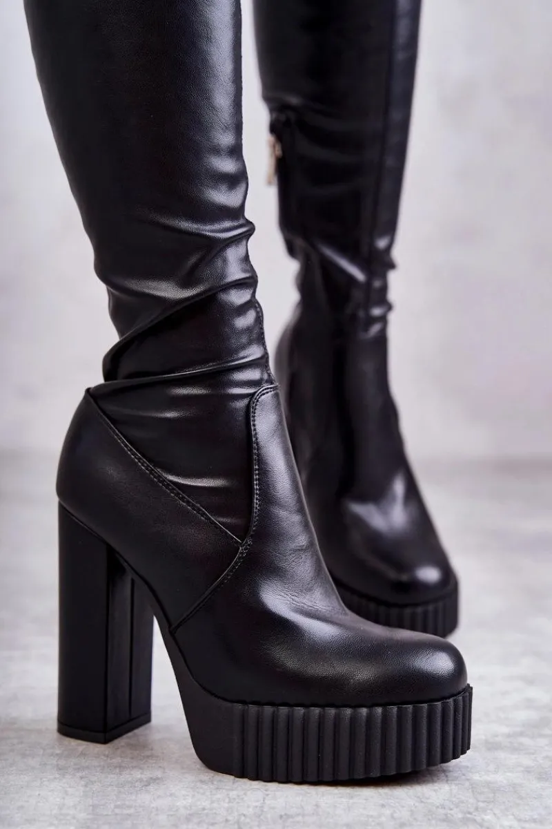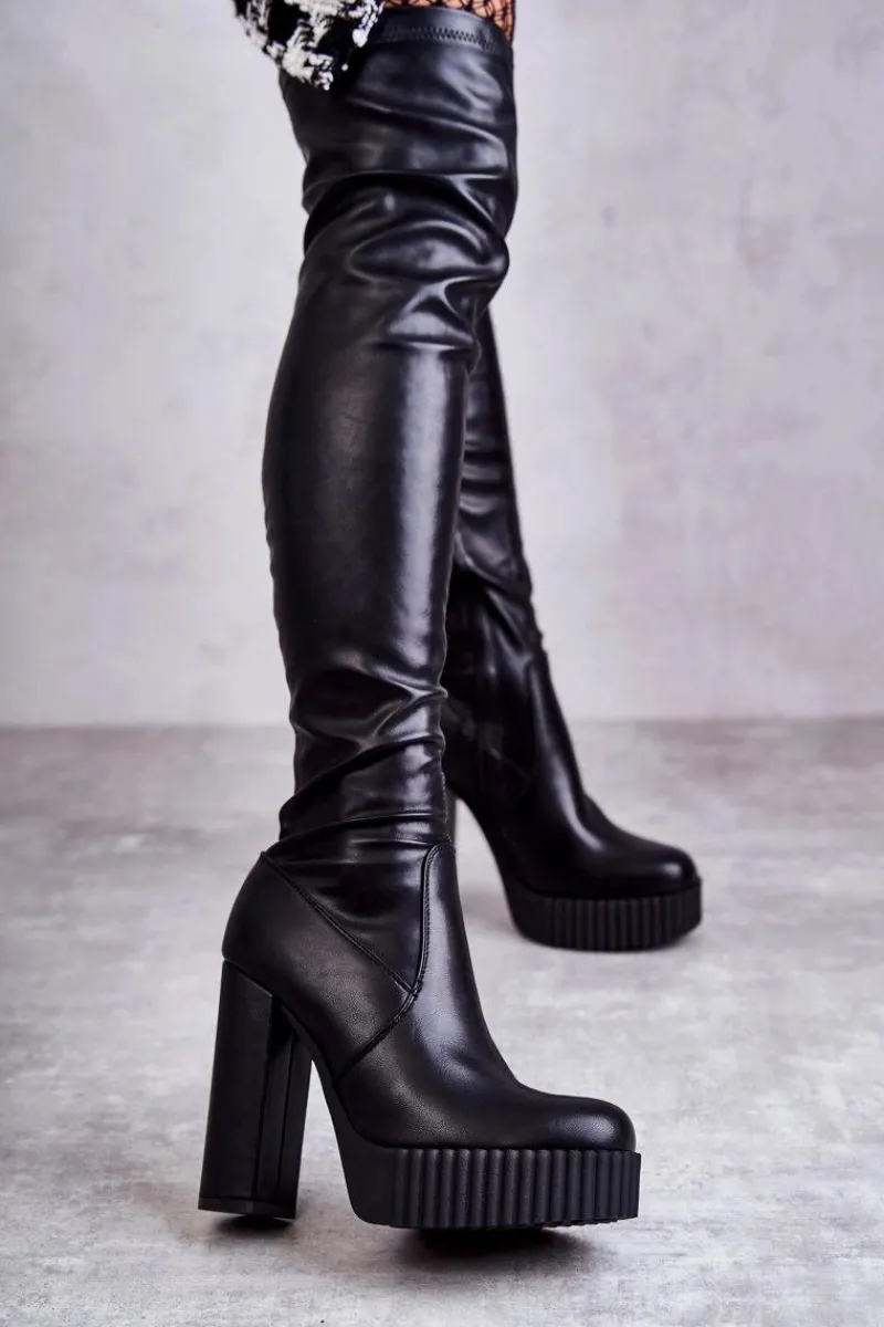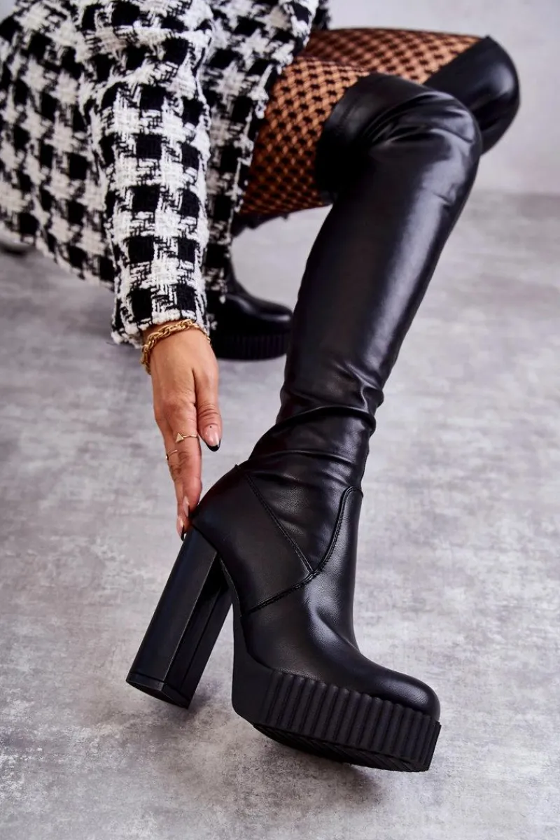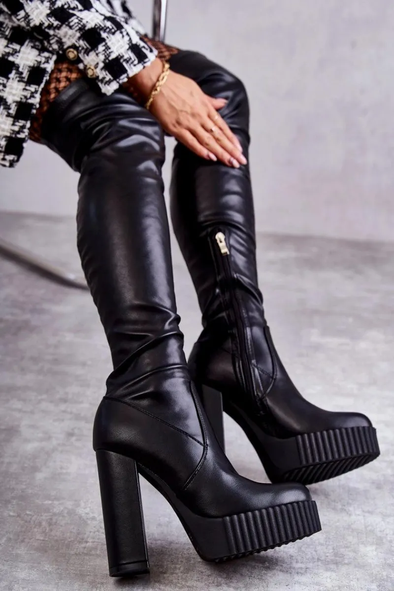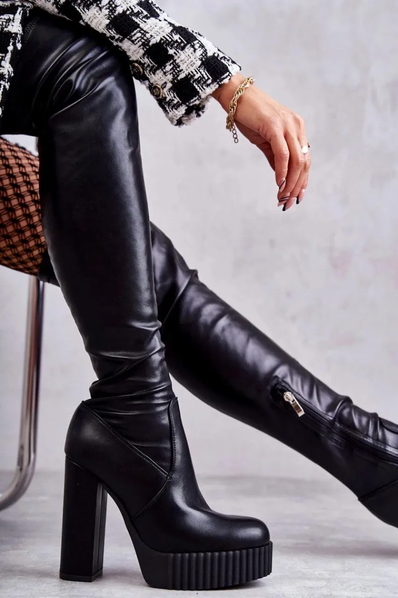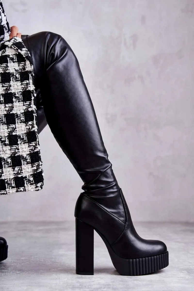 Wyjątkowe kozaki damskie z cholewką za kolano wykonaną z eko skóry. Model wsuwany, z dodatkowym suwakiem z boku cholewki. Kozaki osadzono na platformie oraz obcasie w postaci słupka. W środku ocieplone kocem obuwniczym. Dodatkowo posiadają usztywniany zapiętek. Świetnie będą prezentować się ze spódniczkami oraz sukienkami mini. Przy wyborze rozmiaru prosimy sugerować się tabelą rozmiarów.