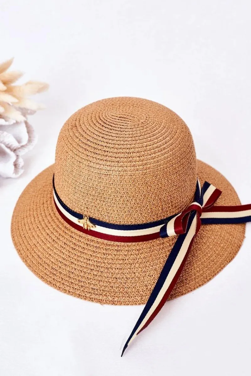 Lekki i modny kapelusz damski. Kapelusz wykonany jest w 100% z plecionego papieru. Rondo ozdobione jest tasiemką oraz złotą pszczołą. Koniecznie sprawdź całą naszą kolekcję kapeluszy!