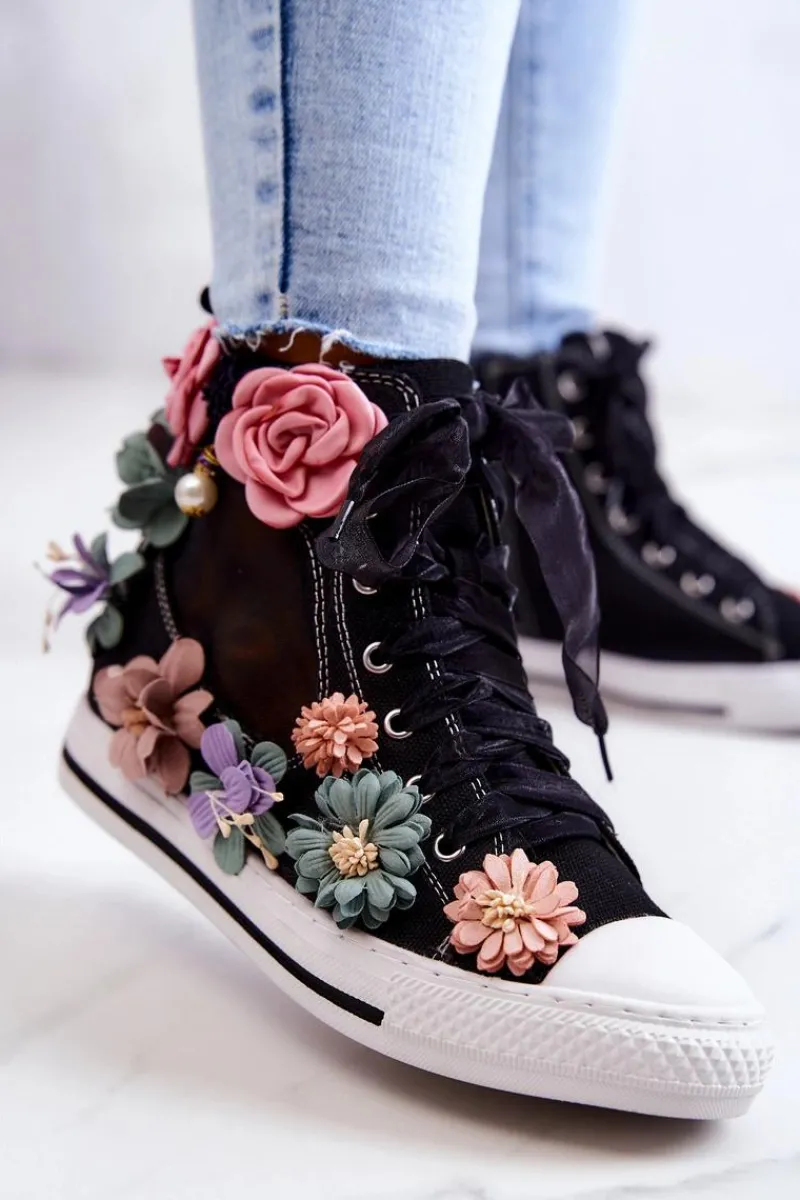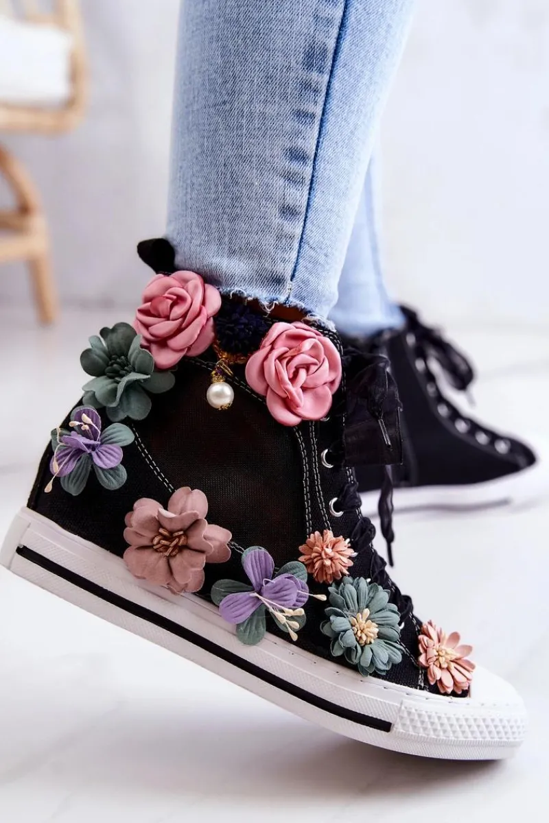 Wyjątkowe trampki, z którymi Twoje stylizacje będą wyróżniać się z tłumu! Model ozdobiony kwiatami ożywi Twoją garderobę! Wykonane z przewiewnego materiału tekstylnego. Z zewnętrznej strony cholewki znajduje się prześwitująca siateczka. Trampki są wiązane na sznurowadła z organzy oraz zapinane na suwak. Nosek wzmocniony gumowym tworzywem. Wkładka materiałowa. Podeszwa wykonana z gumowego tworzywa, antypoślizgowa. Przy wyborze rozmiaru prosimy sugerować się tabelą rozmiarów.