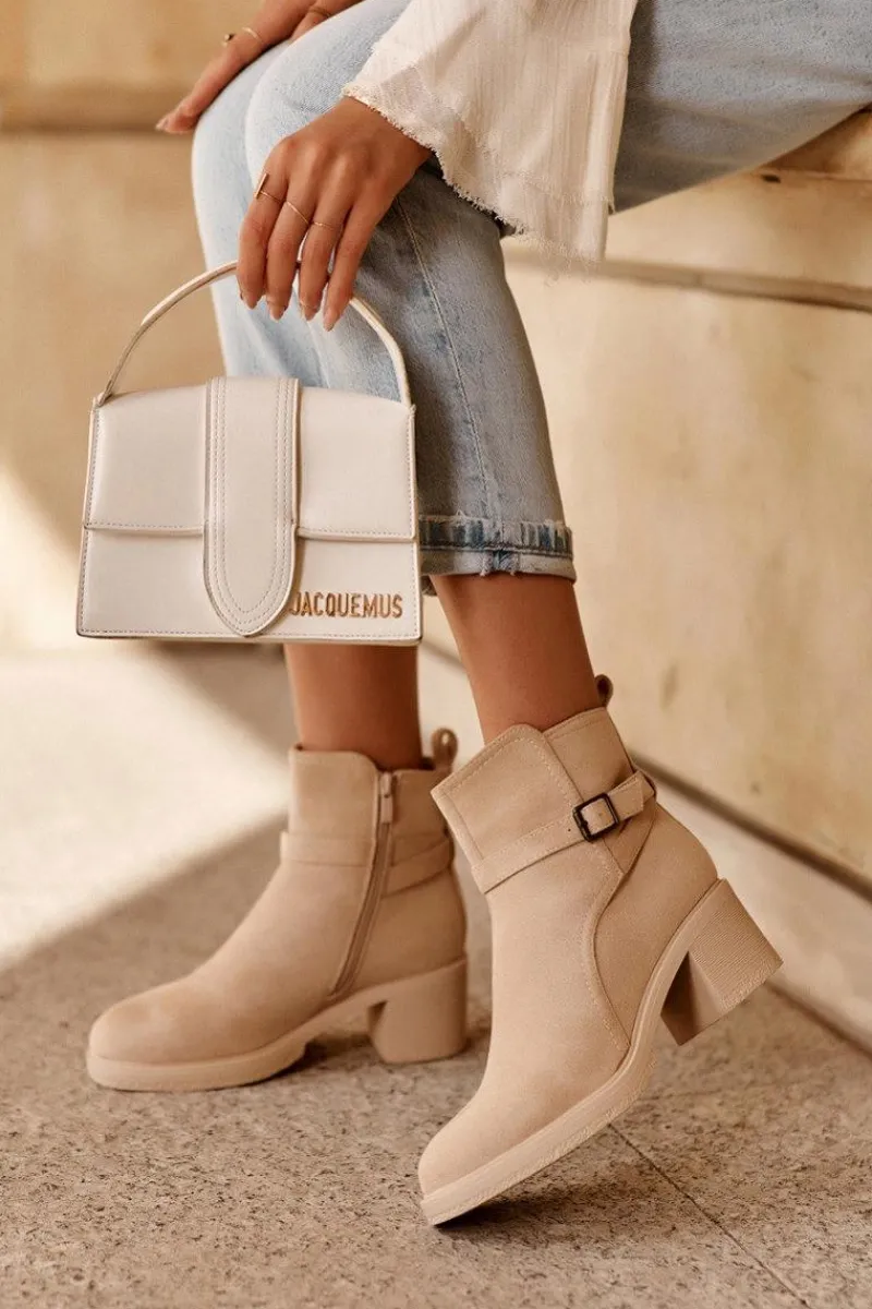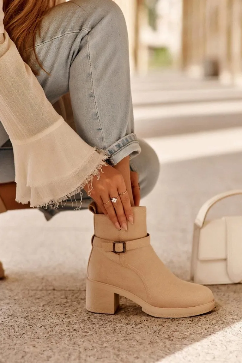 Klasyczne botki wykonane z eko zamszu. Osadzone na obcasie w postaci klocka. Wnętrze ocieplone kocem obuwniczym. Z boku cholewki znajduje się pasek z klamrą. Modny fason sprawia, że możesz założyć je do wielu stylizacji. Nosek zaokrąglony. Buty posiadają także usztywniany zapiętek. W tych botkach jesienne dni nie będą już takie straszne! Przy wyborze rozmiaru prosimy sugerować się tabelą rozmiarów.