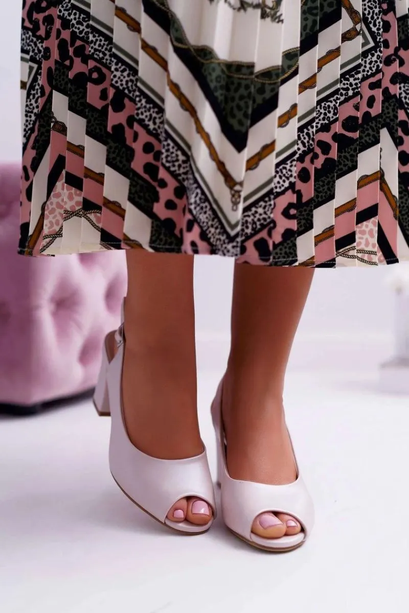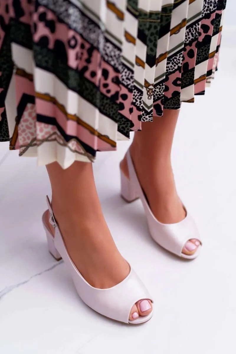 Wygodne sandały to marzenie każdej kobiety! Stabilny, niski słupek zapewni Ci gwarancje dobrego samopoczucia oraz gustownego wyglądu. O nasz komfort zadba skórzana wkładka typu soft comfort. Delikatny perłowy kolor oraz odkryty nosek w stylu peep toe sprawi, że zostaniesz zauważona! Sandały sprawdzą się w każdej codziennej oraz wieczorowej sytuacji. Przy wyborze rozmiaru prosimy sugerować się tabelą rozmiarów.