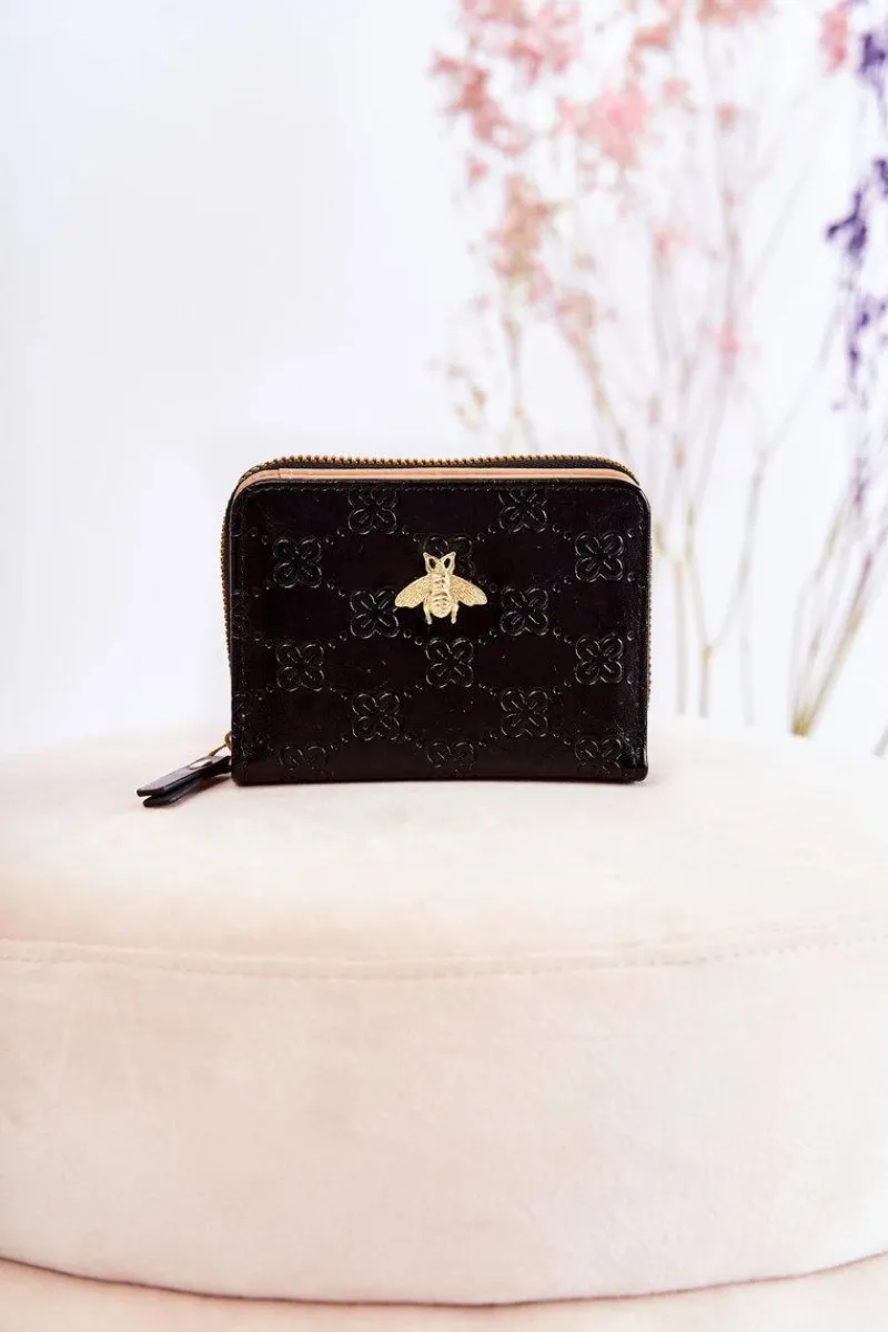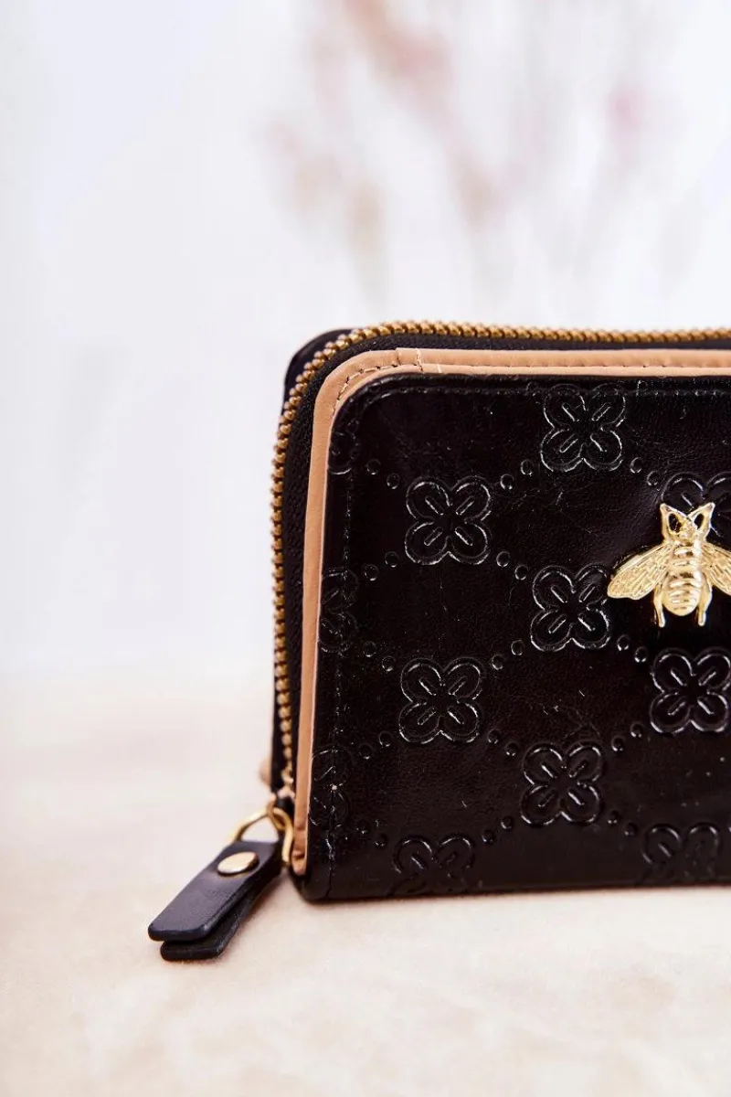 Mały, elegancki portfel został wykonany z eko skóry z tłoczeniem na całości. Zapinany na magnes oraz suwak. W środku posiada kilka kieszeni na karty czy wizytówki, miejsce na banknoty, a także miejsce na fotografię. Zamykana na suwak kieszonka pomieści bilony. Na przodzie umieszczono modny emblemat. Portfel dodatkowo posiada dopinany pasek. Ten niezbędny dodatek każdej kobiety sprawdzi się także idealnie jako prezent!
