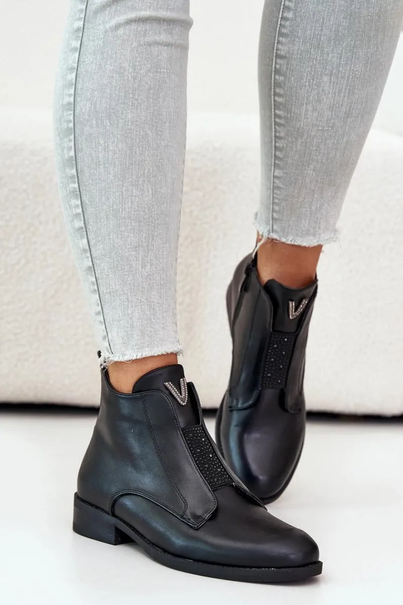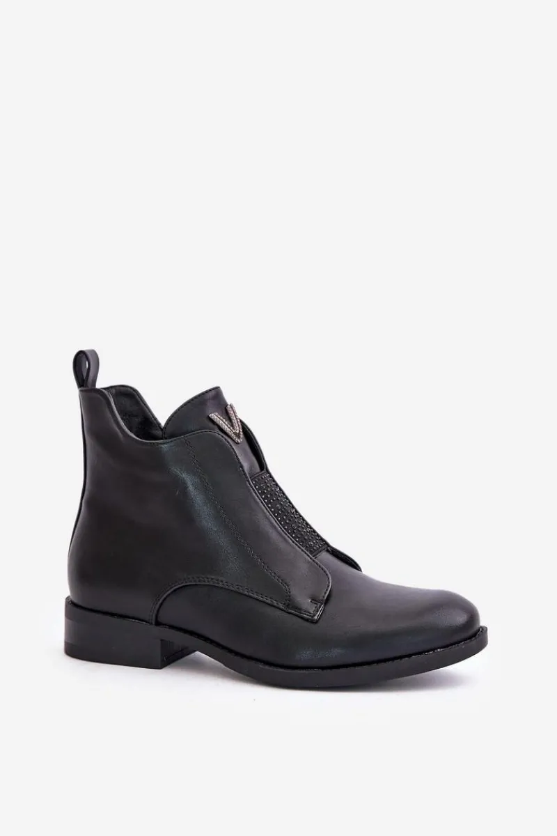 Botki damskie wykonane ze skóry ekologicznej. Osadzone na płaskim obcasie, który zapewni stabilność na każdym kroku. Środek ocieplony kocem obuwniczym. Noski zaokrąglone. Zapinane na zamek. Z przodu zdobiona, elastyczna wstawka oraz mały detal na języku. Cholewka za kostkę. Usztywniony zapiętek. Przy wyborze rozmiaru prosimy sugerować się tabelą rozmiarów.