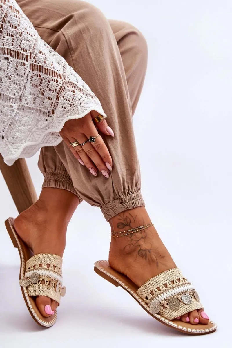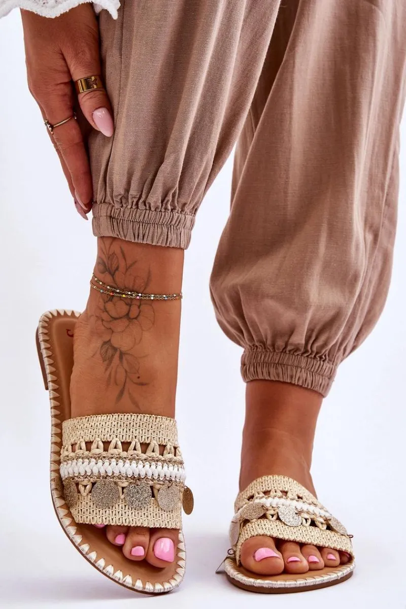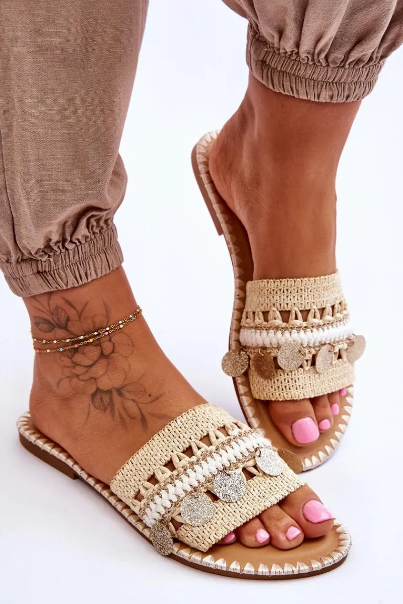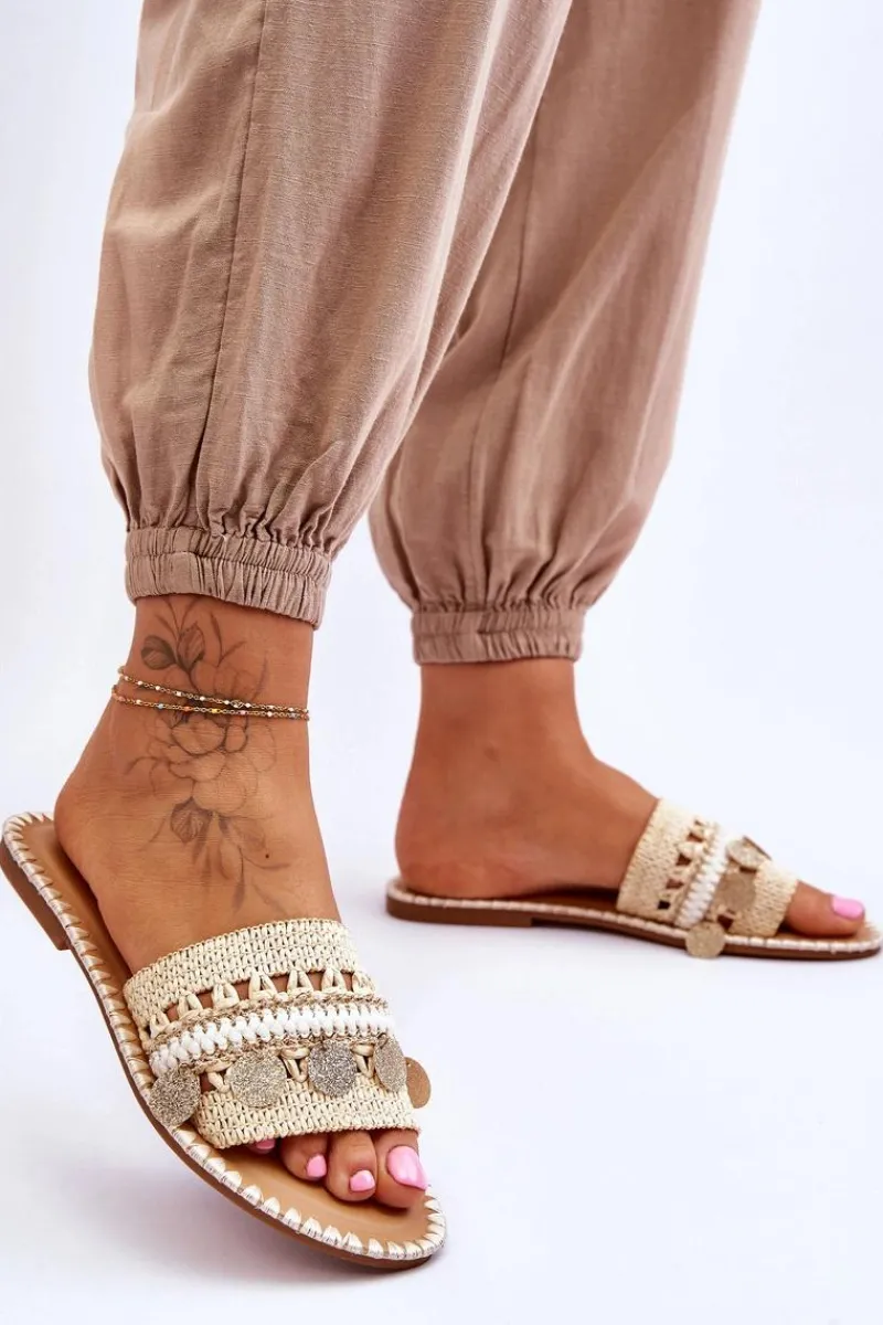 Modne, damskie klapki zostały wykonane z połączenia tworzywa sztucznego oraz materiału. Model ten posiada ozdobne kółeczka oraz lurex, czyli błyszczącą nić. Model klasycznie wsuwany, z płaskim obcasem i antypoślizgową podeszwą. Wkładka z eko skóry została także ozdobiona nicią. Przy wyborze rozmiaru prosimy sugerować się tabelą rozmiarów.