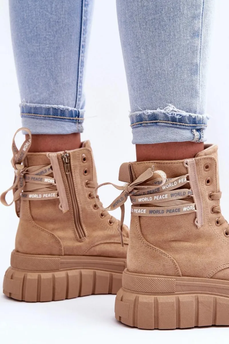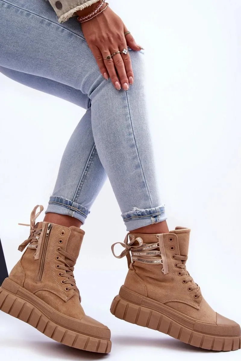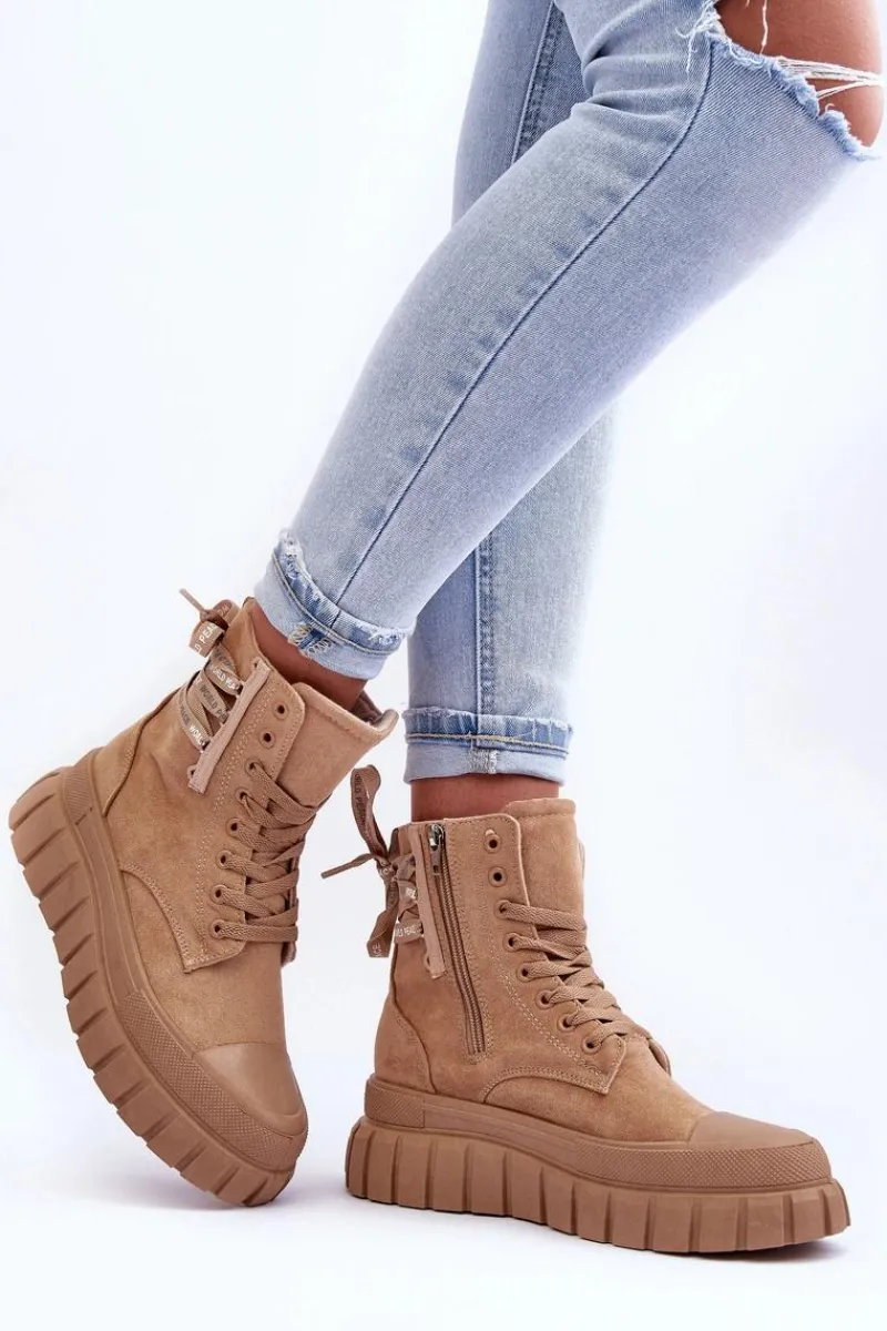Modne botki damskie zostały osadzone na masywnej platformie z gumowego tworzywa. Wykonane z eko zamszu. Model ten zapinany jest na suwak z boku cholewki oraz dodatkowo sznurowany. Nosek jest zaokrąglony. Materiałowa wkładka zapewni komfort oraz wygodę. Koniecznie powinnaś je mieć w swojej garderobie. Przy wyborze rozmiaru prosimy sugerować się tabelą rozmiarów.