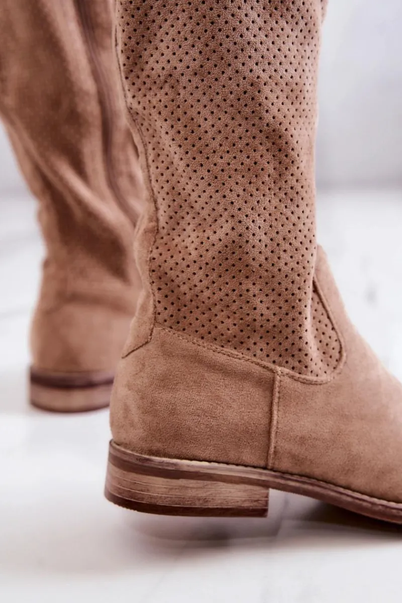 Kozaki z perforowaną cholewką do kolana oraz okrągłym noskiem. Zapinane na całości cholewki na zamek błyskawiczny. Posiadają usztywniany zapiętek. Wykonane z eko zamszu. To kozaki, z którymi stworzysz wiele ciekawych stylizacji na co dzień. Miękka, eko skórzana wkładka oraz niski obcas zapewnią stabilność podczas użytkowania. Przy wyborze rozmiaru prosimy sugerować się tabelą rozmiarów.