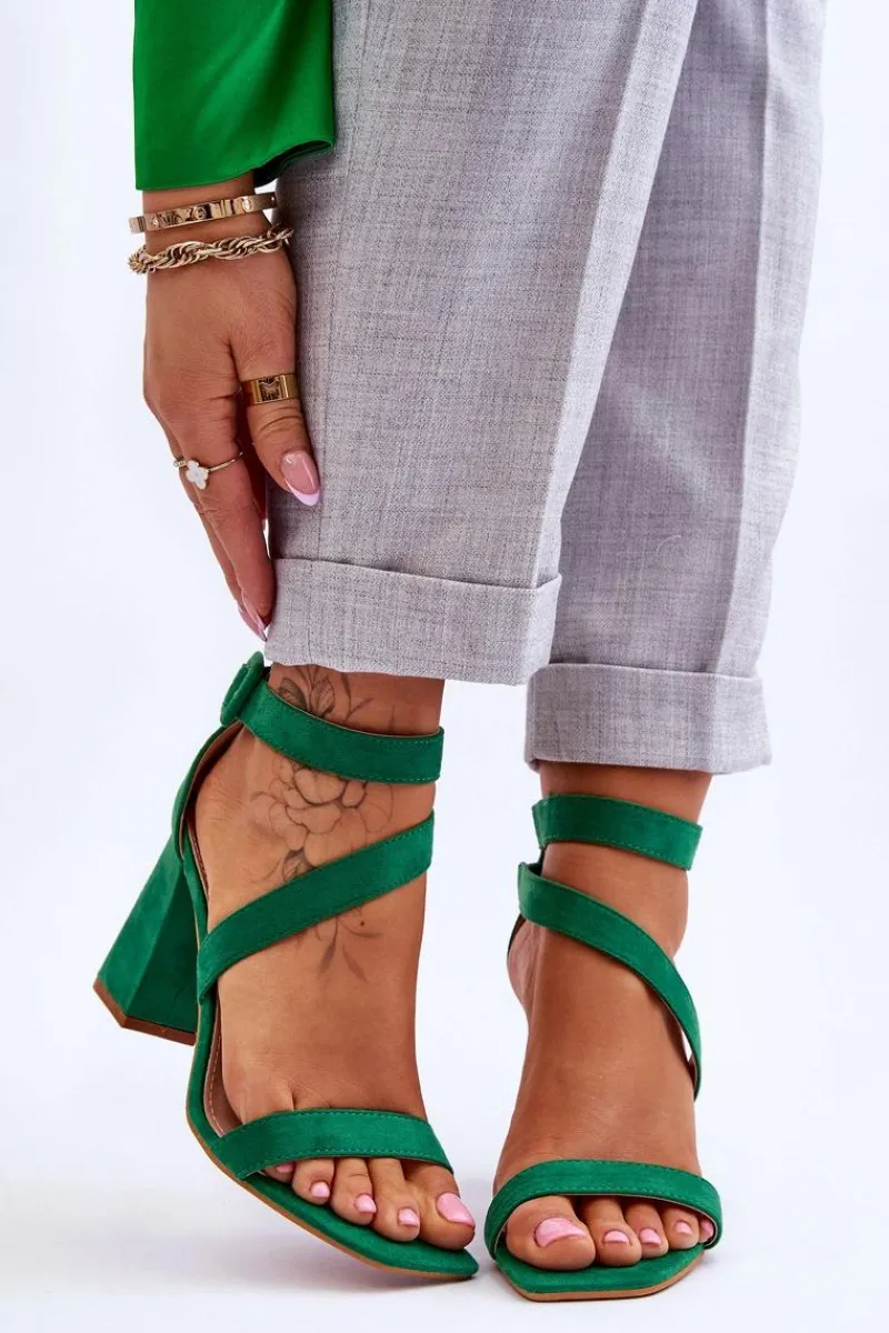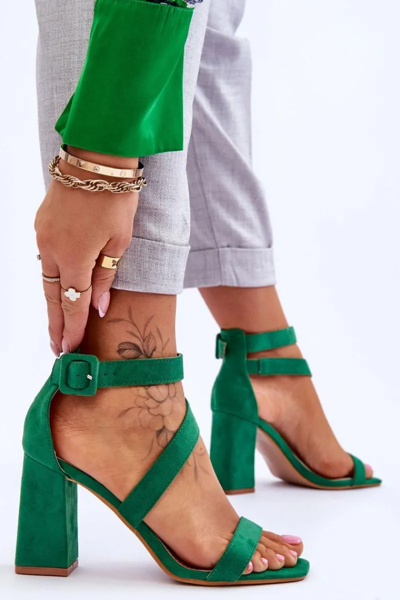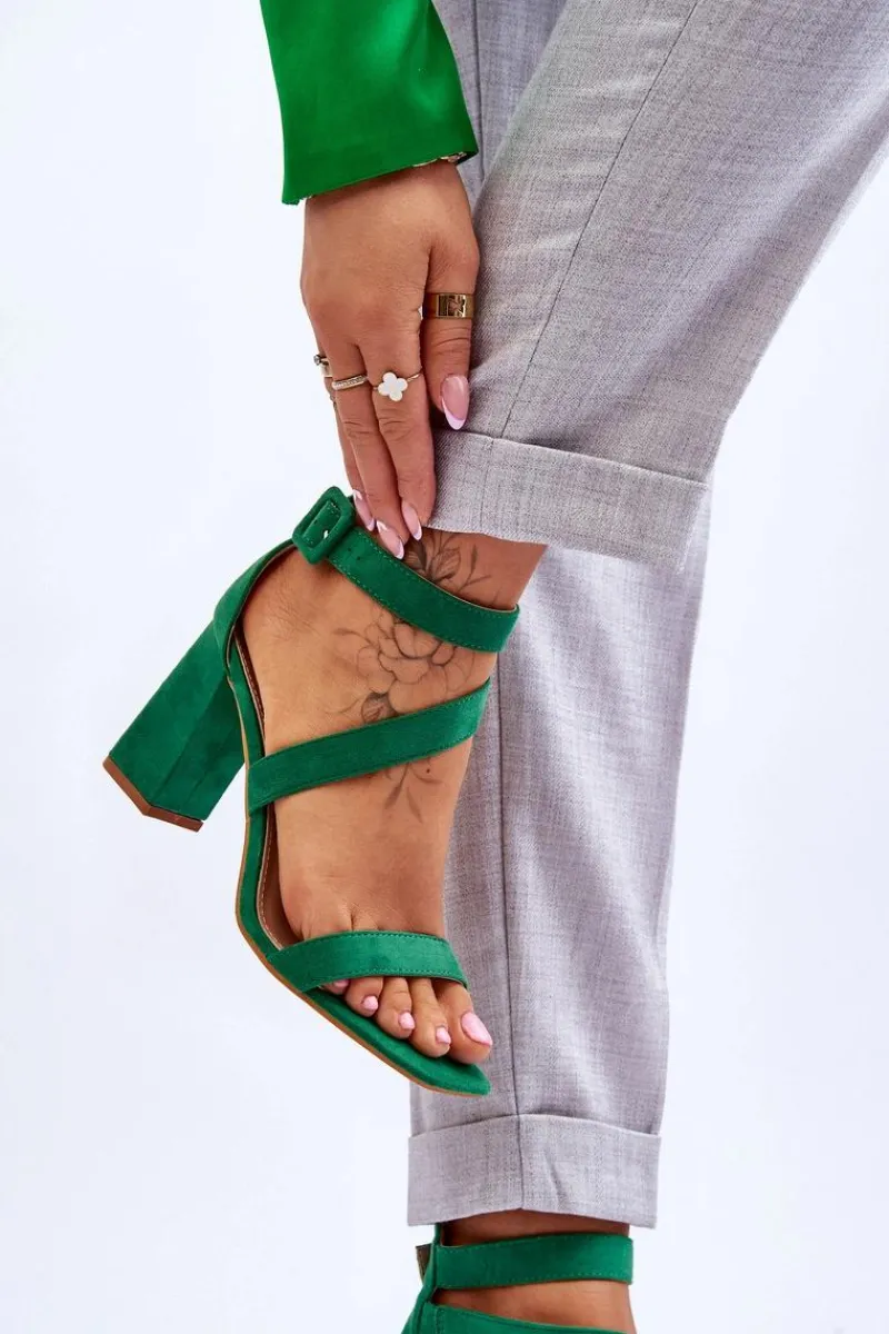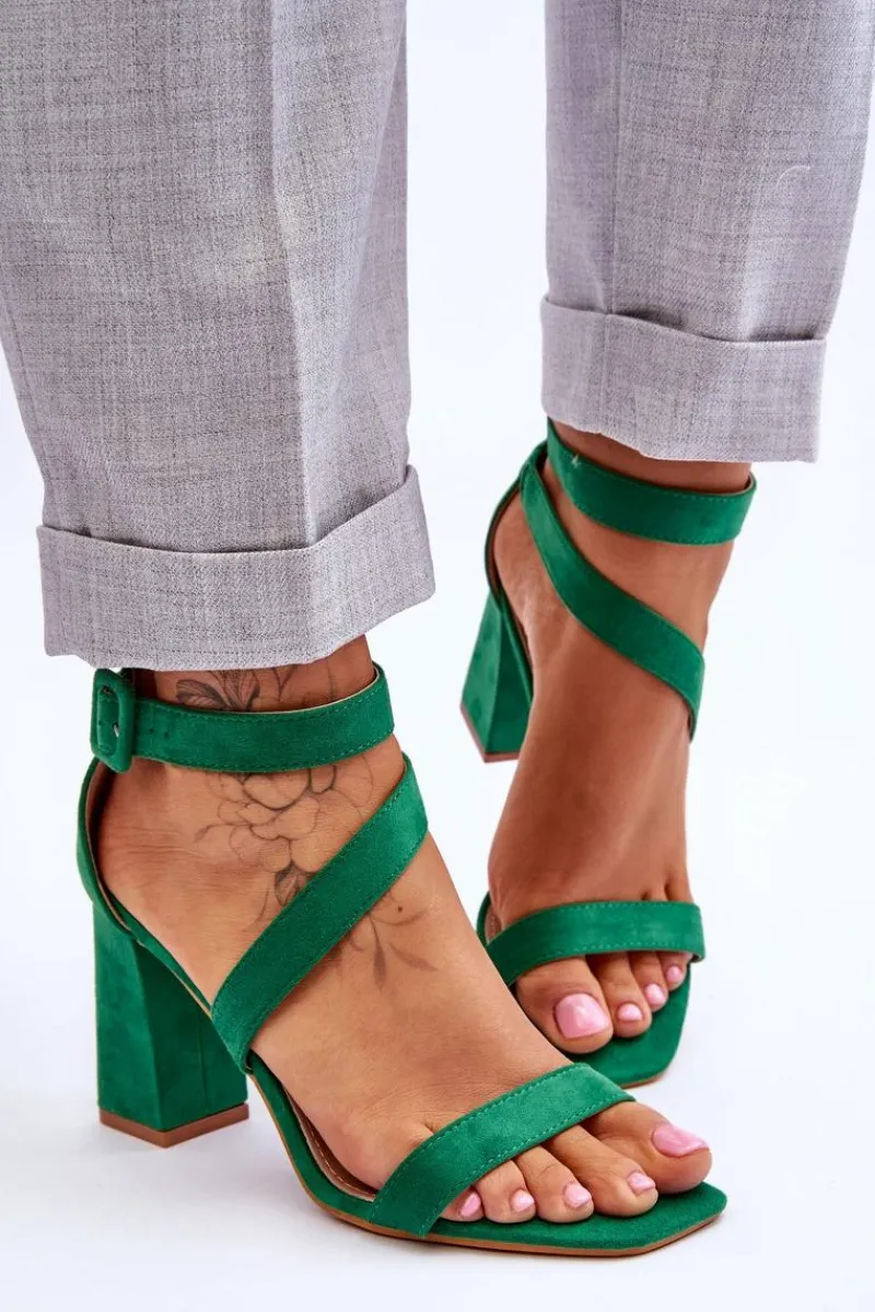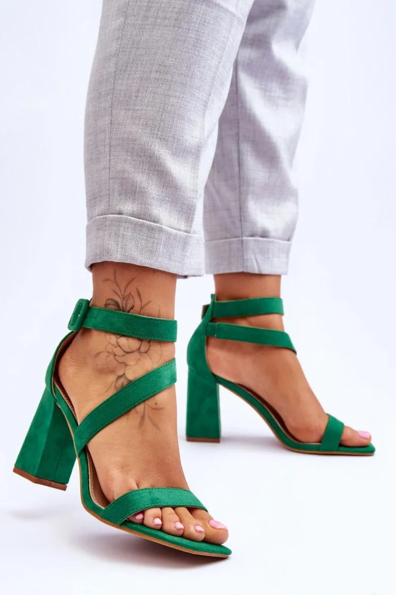 Modne sandałki damskie na obcasie w postaci słupka. Wykonane z eko zamszu z dodatkowym paseczkiem przechodzącym przez środek obuwia. Zapinane wokół kostki na regulowany pasek ze sprzączką. Wkładka z eko skóry jest miękka i wygodna w użytkowaniu. Buty te świetnie sprawdzą się w upalne dni podczas randki, uroczystości czy ważnego spotkania. Przy wyborze rozmiaru prosimy sugerować się tabelą rozmiarów.