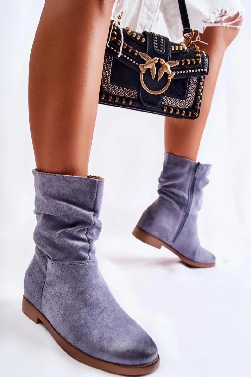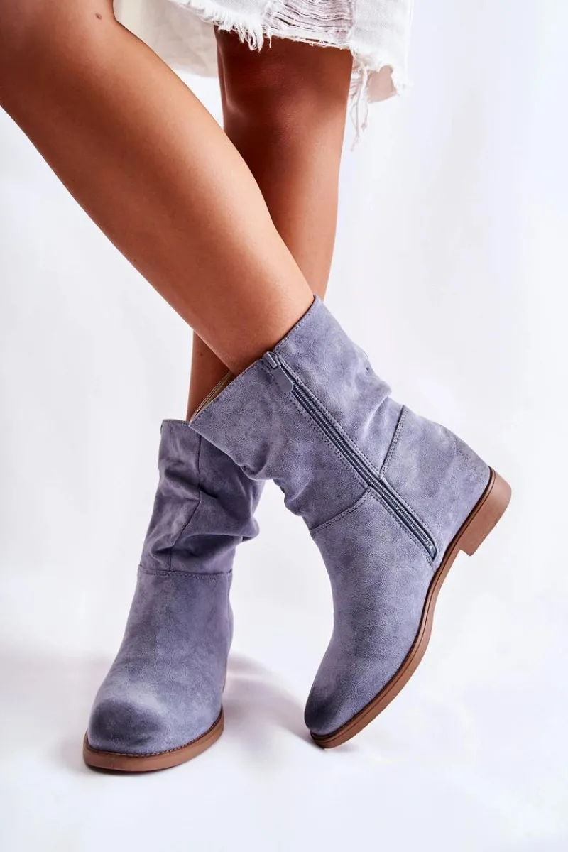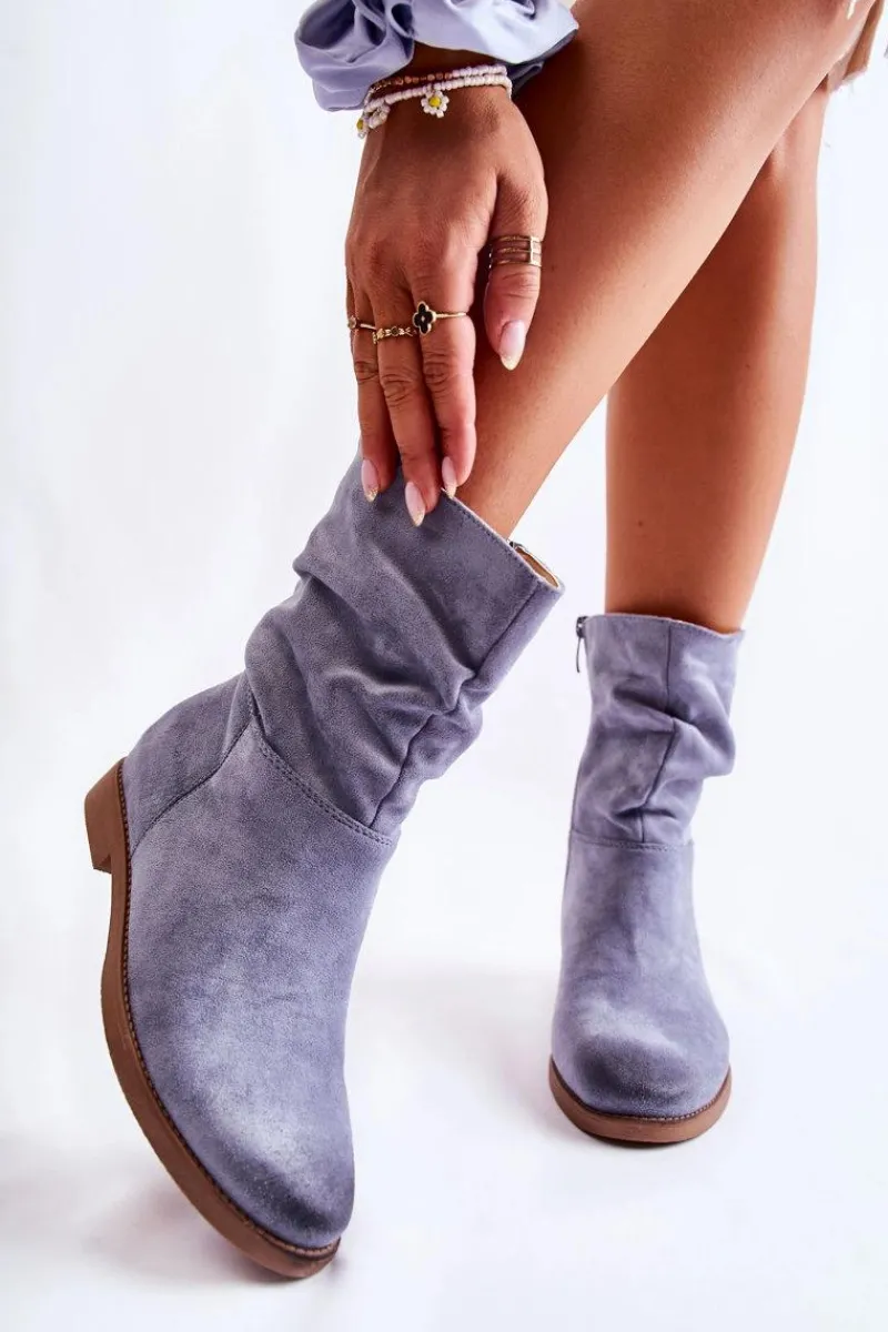 Botki damskie posiadają wysoką, lekko marszczoną cholewkę za kostkę. Zamykane na suwak. Wykonane z przyjemnego w dotyku eko zamszu. Wkładka została wykonana z tkaniny. Zapiętek usztywniany. Na nosku oraz z tyłu cholewki znajdują się modne przetarcia. Idealne na sezon wiosenno-jesienny. Model ten będzie świetnie prezentował się z jeansami czy zwiewną spódnicą. Przy wyborze rozmiaru prosimy sugerować się tabelą rozmiarów.