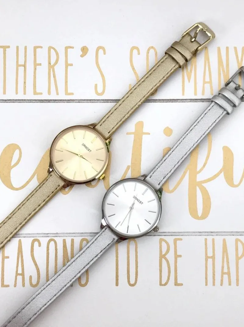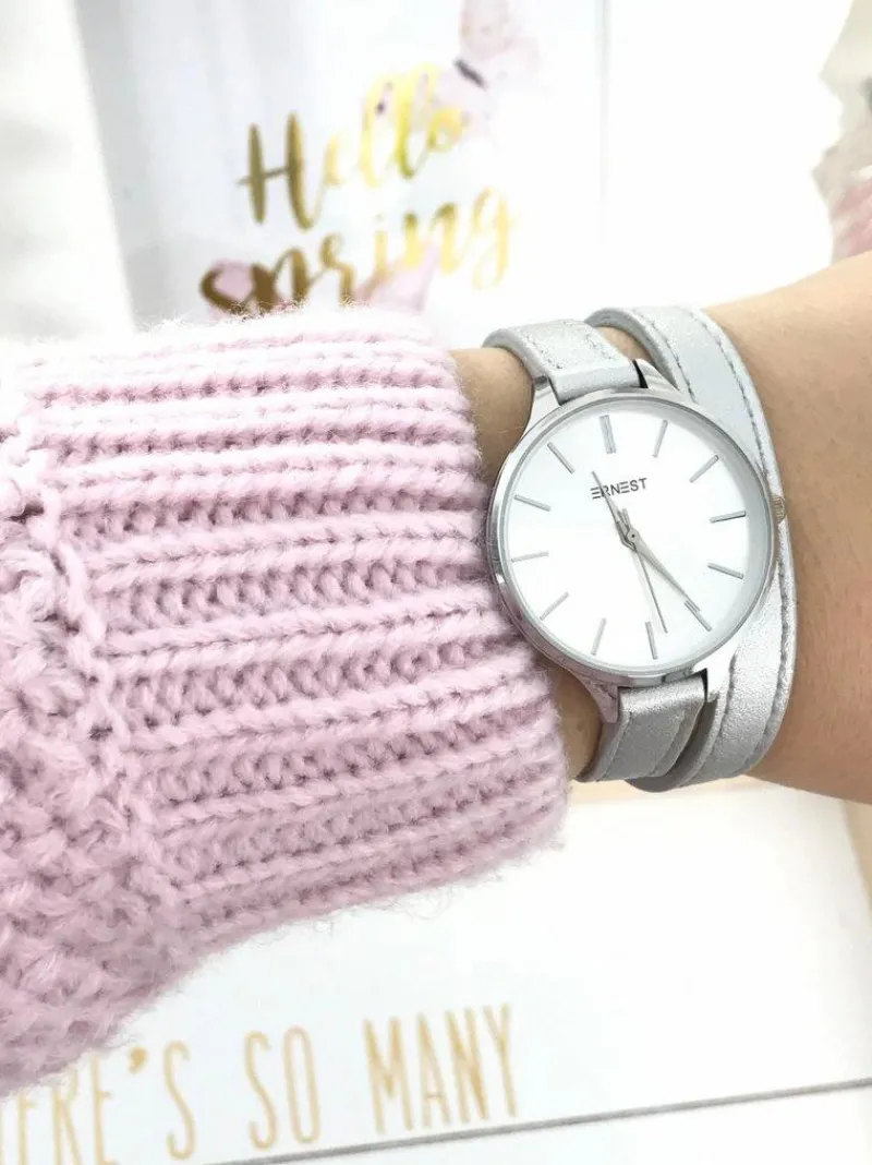 Zegarek Jules marki Ernest to gratka stworzona z myślą o kobietach kochających gustowne dodatki nie tylko do eleganckich ale również do codziennych stylizacji. Zegarek posiada płaskie szkiełko, dzięki temu jeszcze lepiej prezentuje się na ręce a jednocześnie jest bardziej czytelny. Delikatny długi pasek wykonany ze skóry ekologicznej, złota koperta wykonana ze stali chirurgicznej. Wysoka jakość wykonania mechanizmu i koperty.