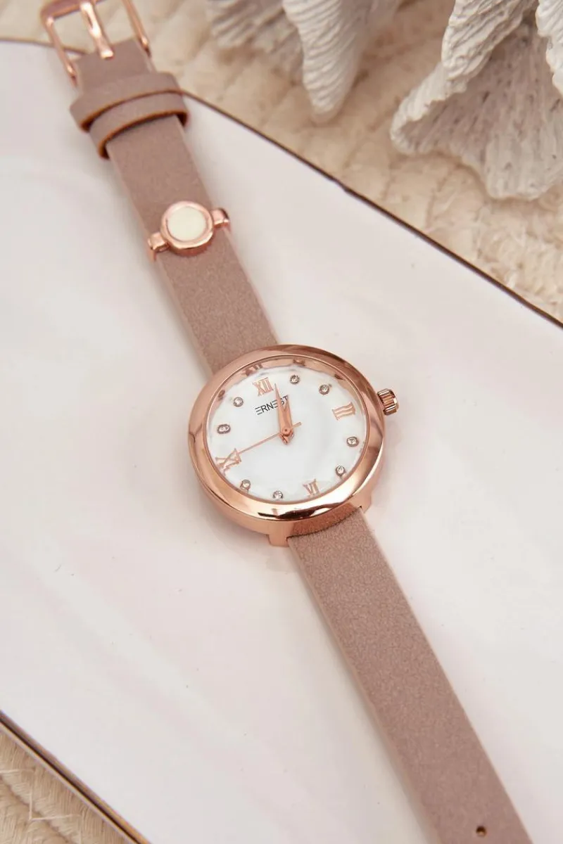 Damski zegarek na eko skórzanym pasku marki Ernest. Tarcza zegarka ozdobiona cyrkoniami dodaje mu wyjątkowego blasku i uroku. Dzięki możliwości regulacji paska, zegarek doskonale dopasowuje się do każdej wielkości nadgarstka, zapewniając komfort noszenia i stylowy wygląd. Idealny wybór zarówno na codzień jak i na bardziej specjalne okazje.