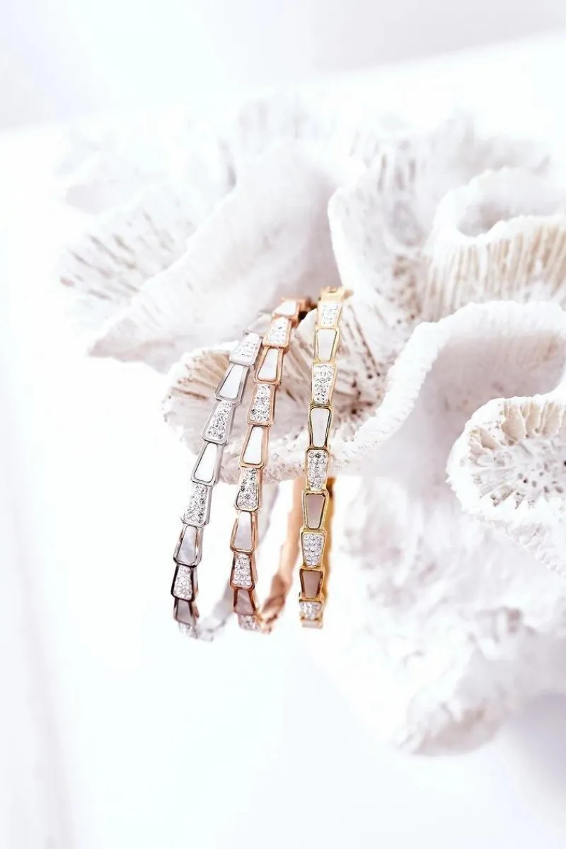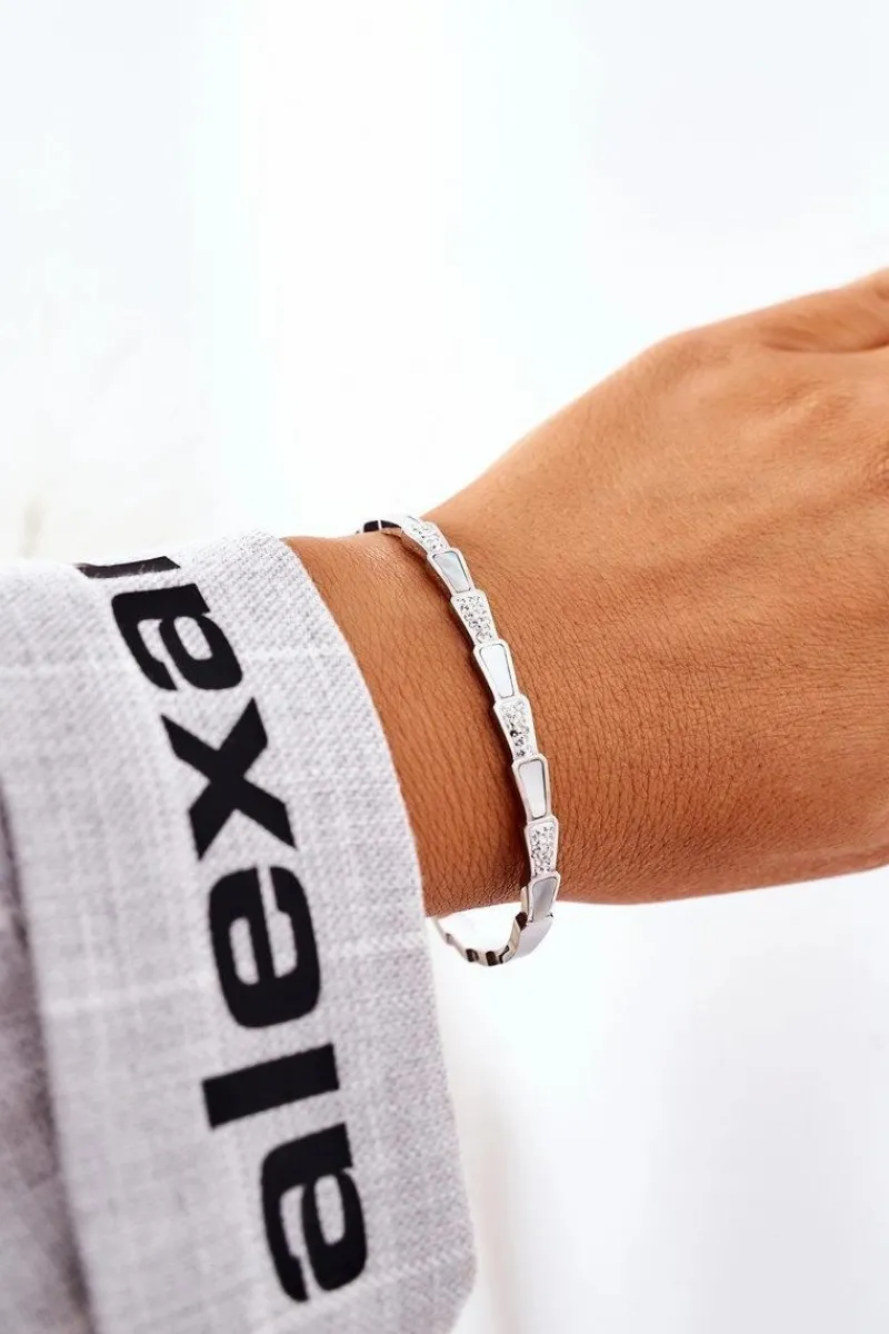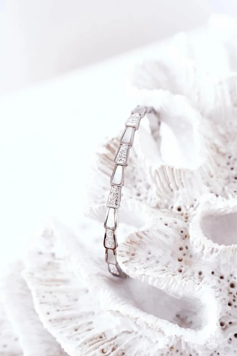 Bransoletka wykonana jest ze stali nierdzewnej, ozdobiona mieniącymi się cyrkoniami oraz kamieniami o perłowym wykończeniu.